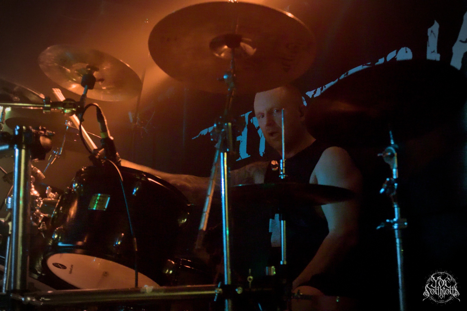 Alors c'est du brutal de chez brutal évidemment. Sur fond de batterie programmée deux guitaristes construisent un mur du son implacable, le frontman nous jetant ses « growls » à la figure. C'est vicieux aussi, ça groove avec des riffs de zombies tueurs. Bref, nous en avons pris plein la « g...le » sans problème. Allez, un peu plus de mise en scène p ourles prochaines tueries et ce sera parfait !