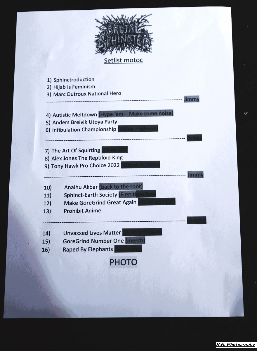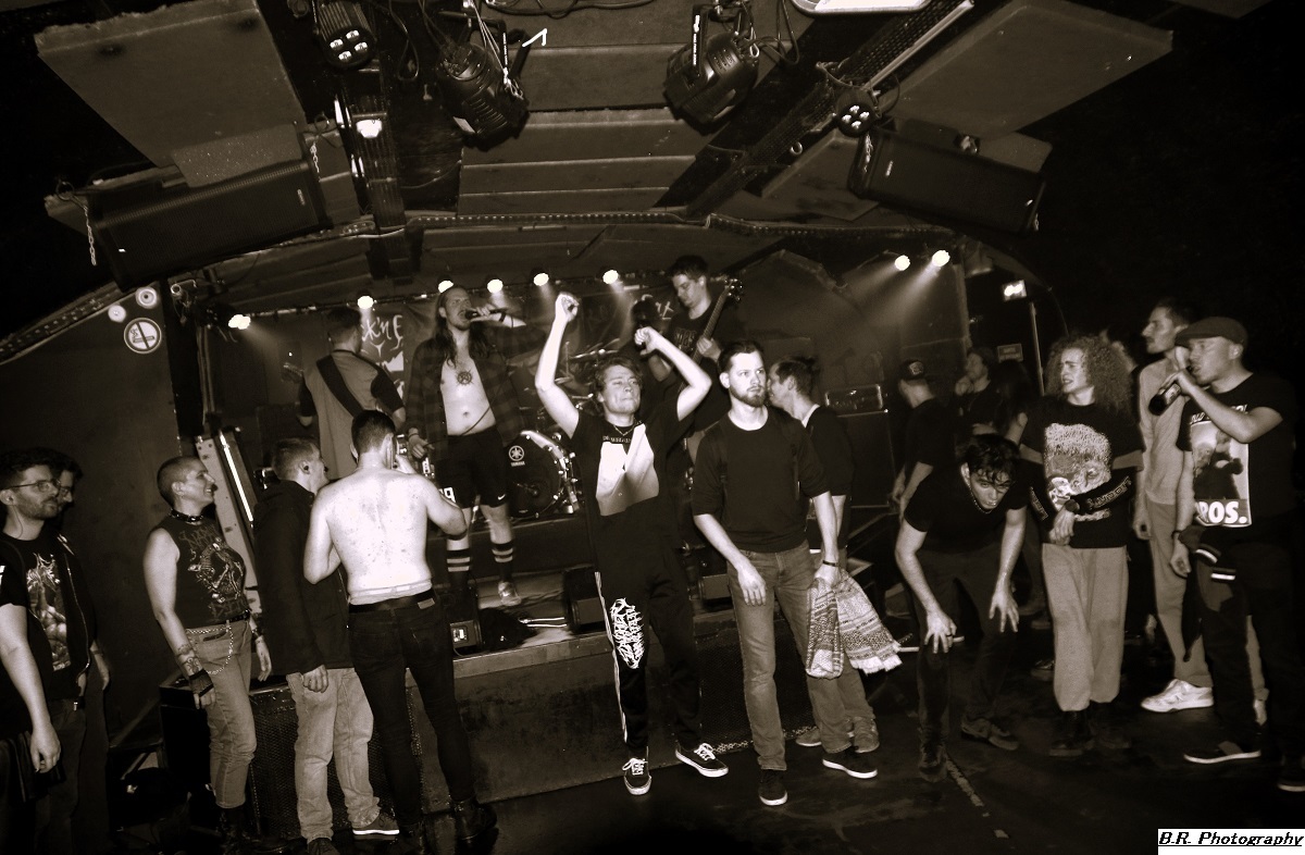 WOUNDED mélange allègrement le son d'un Entombed, death à la Suédoise donc, et des vocaux hardcore, voire grind aussi. Les Lyonnais ont choisi un frontman charismatique dans la région, un certain Bobby qui en fait des tonnes en live et invite le public à s'émouvoir physiquement parlant. Et ça marche, les premiers ébats de la soirée se font jour dans le pit. Bonne entrée en matière donc pour cette jeune formation qui en veut et s'en donne les moyens, on aime ! La suite sera vraiment brutale de chez brutal avec un NECROSCUM qui, après une intro aux ambiances mortelles, nous colle contre les murs dès les premiers titres. Leur brutal death-grind ne fait pas dans la dentelle évidemment et leur EP de 2020 « Self Collapse » et l’album de 2023 « Gates of Misery » nous avaient déjà mis dans le bain de sang à leur écoute, alors en live, je ne vous fais pas un dessin. Avec les Lorrains, c'est du pur death metal violent et sans concession, et même si quelques mélodies vicieuses en fond d'écran viennent adoucir le propos cela reste brutal (re), vraiment. On pense bien sûr à un certain Cannibal Corpse (oups) voyons ! C'est donc bestial et gore en diable, et figurez-vous que l'on aime ça, brelle découverte en ce qui me concerne ! Avec les Liégeois de BRUTAL SPHINCTER ce n'est pas du café doucereux (sic) mais c'est la provoc' permanente sur des rythmiques épileptiques qui font déplacer la foule devant les scènes où ils se produisent, que ce soit au Hellfest, au Metaldays ou encore au Motoc (comme ils disent). Alors ce soir ils vont démonter notre RNE avec une certaine présence bien fun. Mais ne vous y trompez pas, leur gore-grind est quand même puissant et nous interpelle grave sur notre belle société actuelle avec un humour bien acide disons-le. Mais qu'a cela ne tienne, les rythmiques poussent tout le monde à s'éclater dans tous les sens avec évidemment à la clé un wall of death à l'envers, pourquoi pas ! Bref, en fin de set à vous de rechercher devant la scène votre chemise ou votre godasse sur un sol mouillé aux boissons houblonnées et autre sueurs dégoulinantes. Et ce fus bien pour une certaine ambiance, amen ! Merci aux organisateurs Turbo Lovers et au Rock n'Eat pour cette soirée agitée comme un petit bal du samedi soir sur les bords de Saône ! |