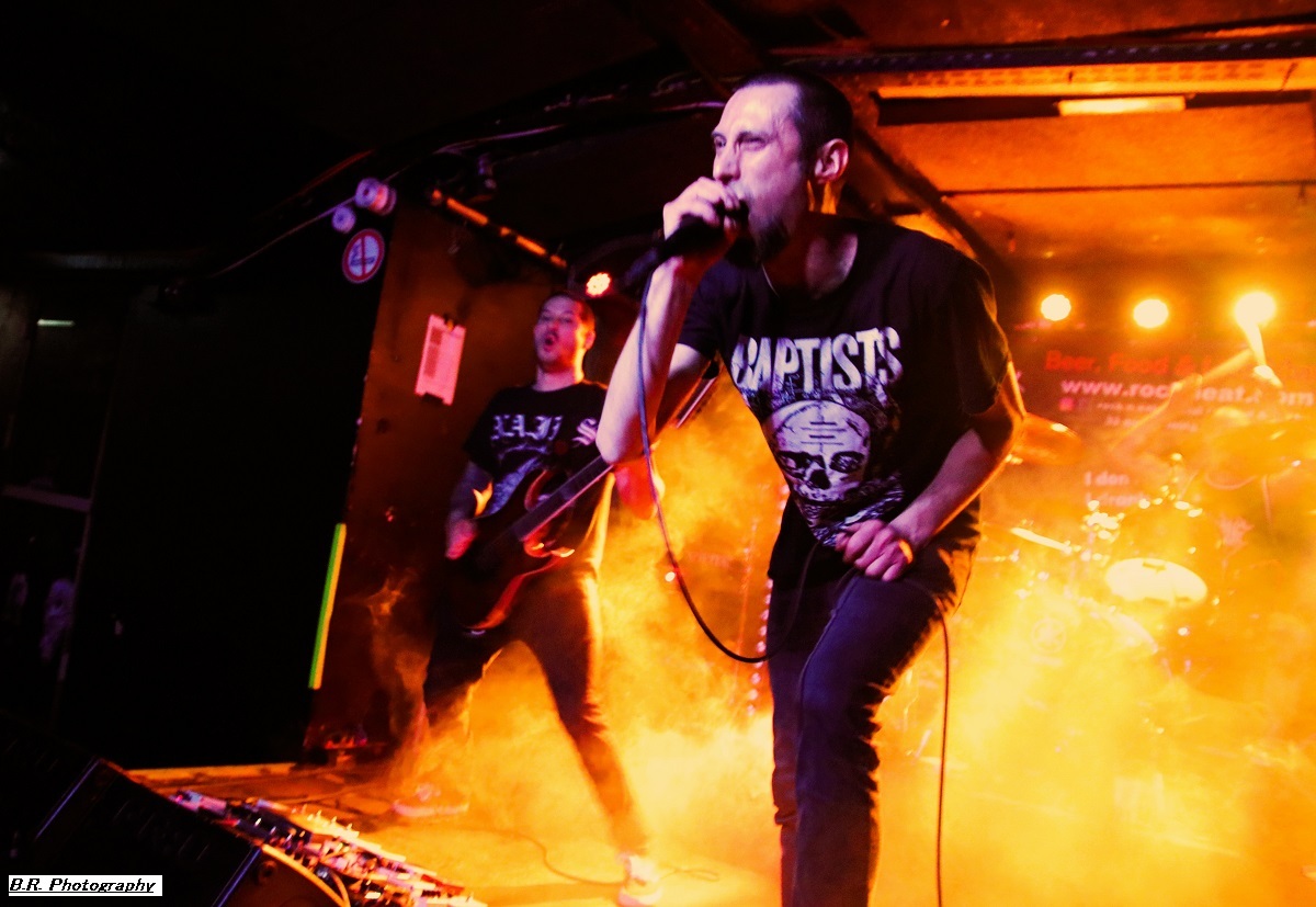 Premier groupe sur les planches dès 18heures 30 avec les locaux de BTK (Bind Torture Kill » qui vont placer d'entrée de jeu la barre bien haute, « get a grip » ! Un trio qui nous arrache les viscères (sic) à l'aide d'un grindcore chaotique nous collant au plafond des voûtes du RNE.