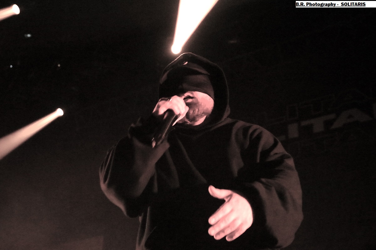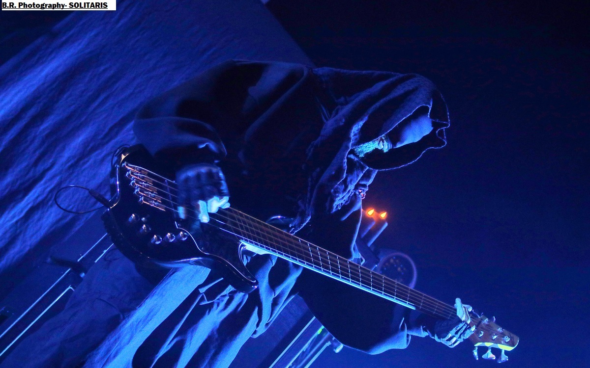 Ce sont les parisiens de SOLITARIS qui ouvrent la soirée dans une atmosphère sombre, des lumières noires et des musiciens masqués revêtus d'habits noirs.