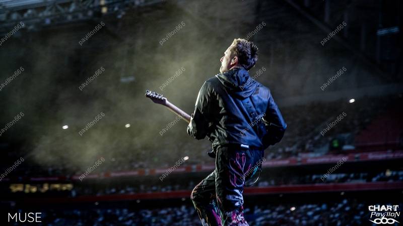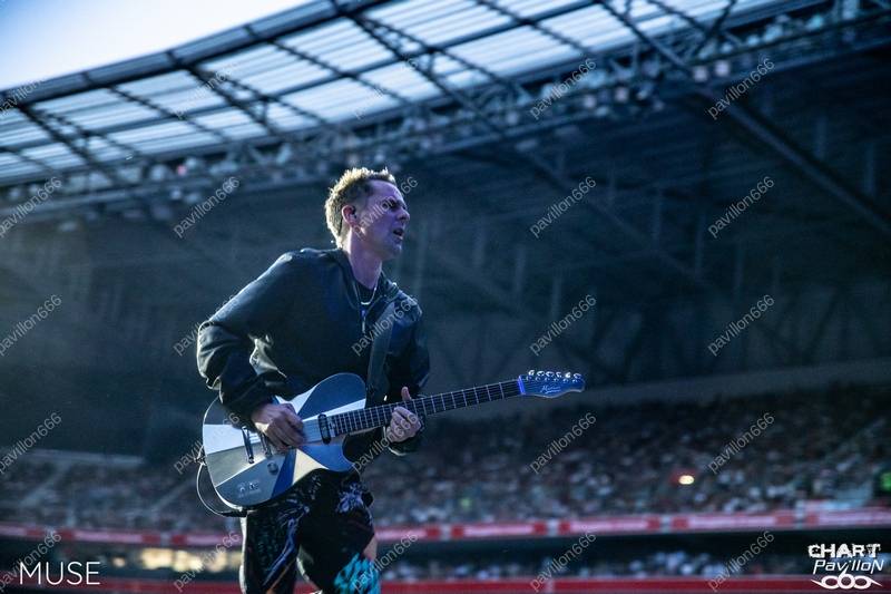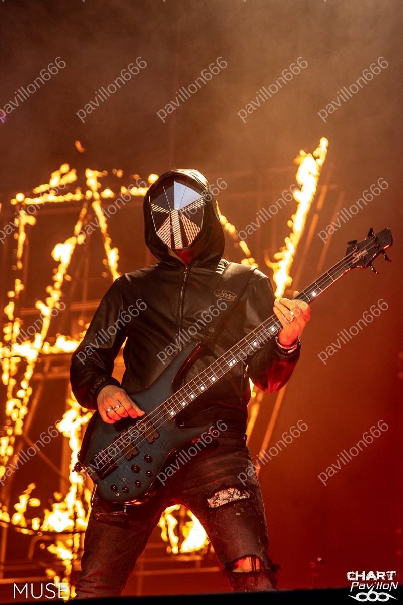 Il est temps d'accueillir comme il se doit la tête d'affiche de la soirée, la raison pour laquelle tant de personnes se sont réunies en cette enceinte. MUSE est actuellement en train de promouvoir son nouvel album "Will Of The People", mais pas seulement. Il s'agit également de célébrer les trente années de carrière de ces musiciens. MUSE est venu nous présenter un set des plus pertinents pour l'occasion. Après une entrée en scène avec le morceau "Will Of The People", accompagnée d'un logo enflammé en arrière-plan, le trio enchaîne rapidement avec "Hysteria". On sent déjà un groupe en grande forme prêt à nous offrir un spectacle époustouflant. Les vidéos des fans publiées sur Internet nous laissaient présager quelque chose d'exceptionnel, mais le voir en vrai est encore différent. Le concert de ce soir s'avère être à couper le souffle, non seulement grâce à sa set-list, mais aussi grâce à son spectacle grandiose. Il y a des groupes, comme celui-ci, qui savent s'adapter aux stades, et cela n'est pas donné à tout le monde. Pour l'occasion, MUSE dispose d'une longue avancée de scène et d'un jeu de lumières éblouissant. La qualité sonore est également au rendez-vous, malgré les difficultés acoustiques du stade, le rendu est impeccable. Tout est en place pour que nous puissions profiter de morceaux puissants tels que "Bliss", "Resistance", "Compliance", "Time Is Running Out", "Undisclosed Desires", "Madness", "Supermassive Black Hole", "Plug In Baby" et "Starlight", pour n'en citer que quelques-uns, car la liste est longue. Mais elle a été choisie avec soin, ne comportant que les meilleurs titres du groupe. La mise en scène de tout cela est incroyable, à la hauteur des plus grands spectacles, avec des personnages inquiétants en arrière-plan. Les musiciens portent également des masques à différents moments. Mais surtout, l'ensemble dégage une aura majestueuse, où chaque détail est millimétré et techniquement maîtrisé de A à Z. Nous retiendrons également le rappel avec "Kill or Be Killed" et l'incontournable "Knights Of Cydonia".