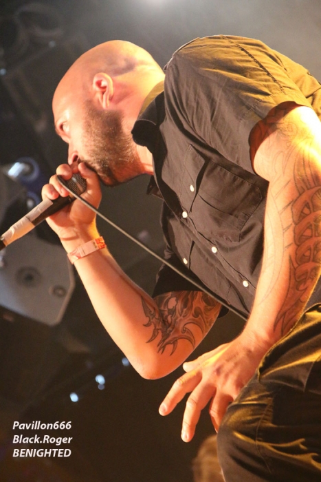 En effet, Benighted n’a pas ralenti le tempo et se bonifie en prenant de l’âge, mais pas en sagesse car en live c’est la défonce assurée avec des musiciens de plus en plus déchaînés qui nous présentent notamment des titres de « Carnivore Sublime » tous meilleurs les uns que les autres. Et la devant nous c’est le direct « in your face » avec une puissance de feu énorme sur un son à décoller la tapisserie de votre salon. Les vocaux de Julien relèvent de la psychiatrie et vont toujours plus loin en intensité malsaine et ses compères guitaristes tranchent dans la viande saignante, la basse nous remontant les tripes au cerveau, le tout servi par un batteur pas né de la dernière pluie de décibels, actuellement David Diepold de CATTLE DECAPITATION, tout un programme sanglant donc !