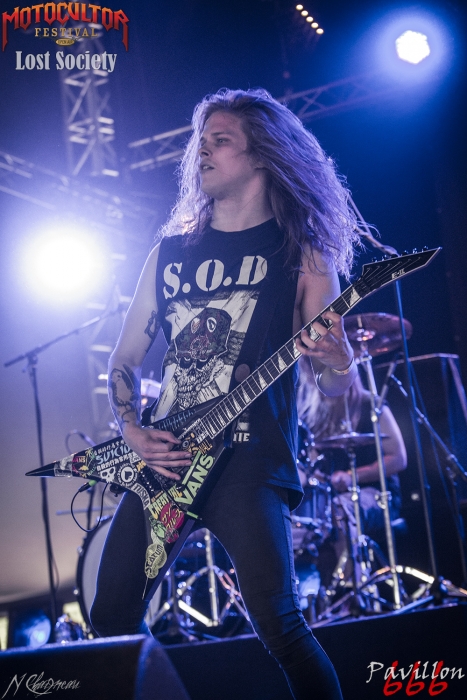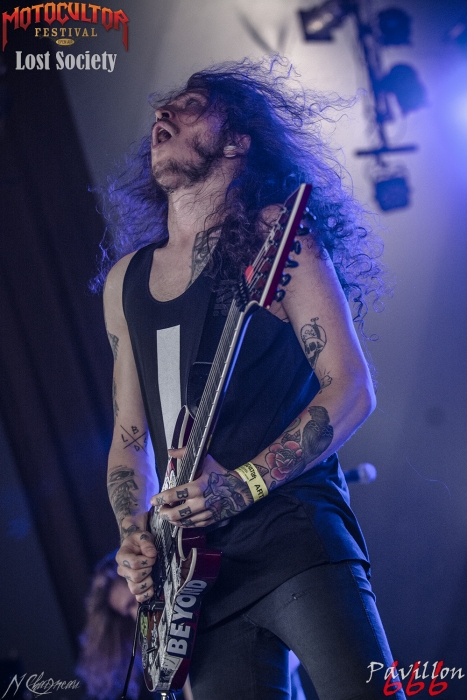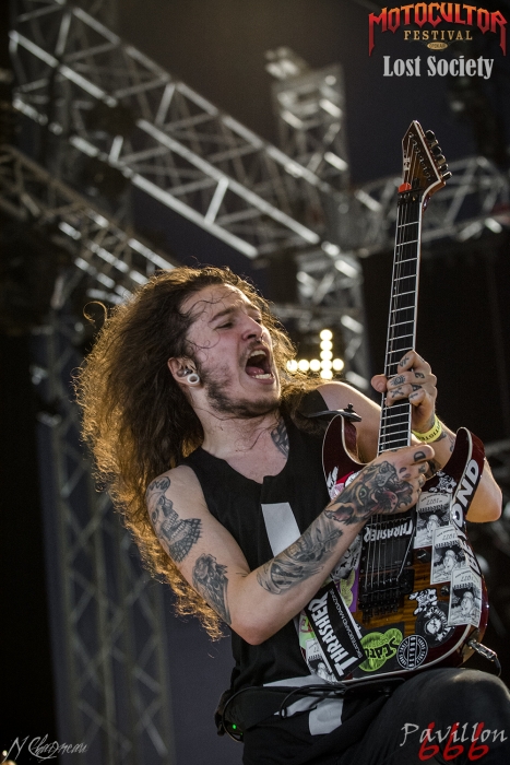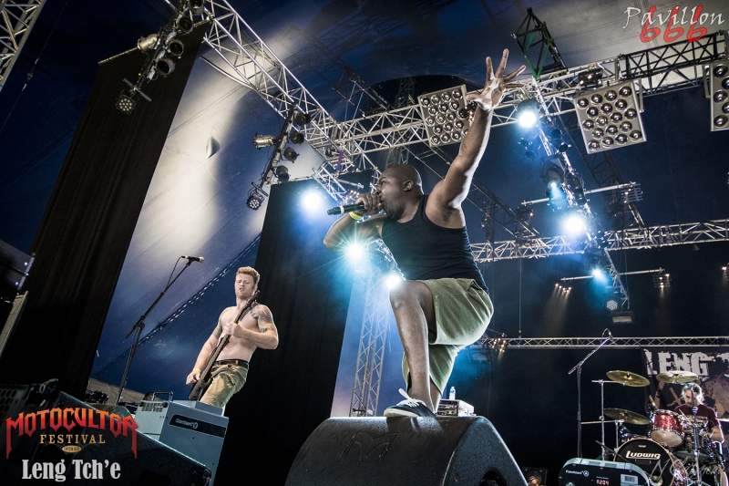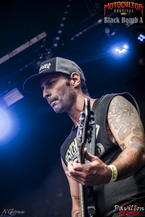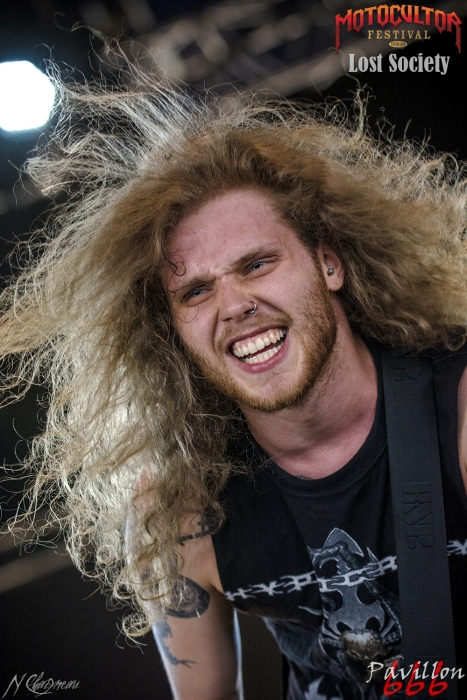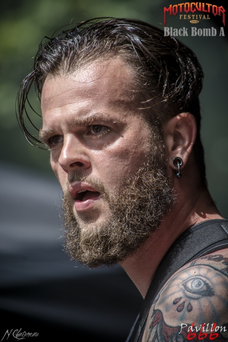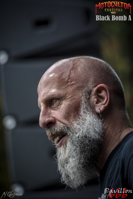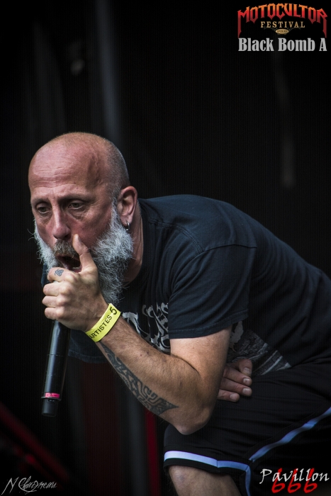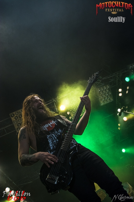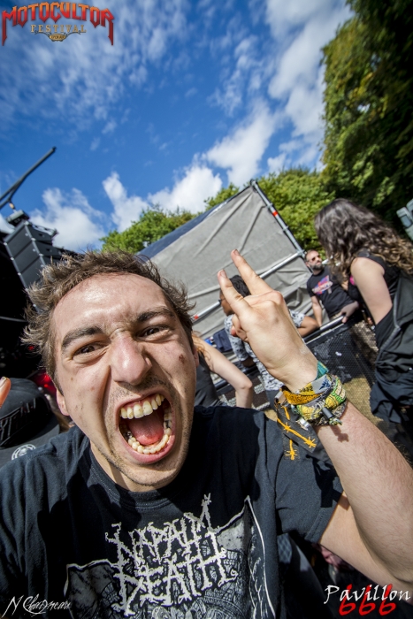 L’ouverture est donc assurée par Poésie Zéro. Premier constat : ils portent bien leur nom ! Nous sommes accueillis par un magnifique « Alors, on a bien dormi comme des grosses merdes ? » Point positif : le son est bon et la voix du chanteur ressort mieux que ce qu’on a pu avoir la veille. Son utilisation pour insulter le public et l’organisation du festival est par contre d’assez mauvais goût à mon avis. Le public semble plutôt amusé et ne prend pas vraiment le groupe au sérieux. Les membres de Recueil Morbide prennent le relai avec un brutal death dont l’équilibre entre lourdeur et rapidité est à mon goût très bien géré. Je regrette que le public n’ait pas été très dense, je pense que beaucoup de festivaliers auraient pu s’éclater sur ce set. On enchaîne ensuite avec les Belges de Leng Tch’e qui secouent également le public et le réveillent totalement avec leur grind (tout en s’excusant de tirer les festivaliers de leurs sacs de couchage à une heure aussi matinale que 13h20 !) Le courant passe entre la scène et le pit et le chanteur descend même quatre fois au contact de la foule pendant le set. Petit bonus : un festivalier est invité à monter le rejoindre le temps d’un morceau ; un peu désemparé et étonné au départ, il a soutenu le chanteur avec un scream plutôt puissant. Changement de niveau avec l’arrivée de Black Bomb A. Ceux qu’on ne présente plus étaient très attendus au Mototcultor et la quasi-totalité des festivaliers se masse dans la pente surplombant la petite Suppositor Stage. Sans chichis les Français lancent un set explosif qui ravage les oreilles d’un public surexcité. La fosse n’est qu’un tapis roulant déversant ses slammeurs sur les vigiles entre les multiples pogos et circle pits. Malgré la cuisson imposée par la météo, tout le monde se défoule danc ce joyeux bordel. Et cette joie se voit aussi sur scène : les membres de Black Bomb A sont visiblement très contents de cet accueil. Si l’ambiance dans le public ne peut rester à ce niveau d’excitation non contenue, les Finlandais de Lost Society maintiennent avec brio une ambiance électrique et dynamique qui semble ne pas vouloir retomber depuis le passage de Recueil Morbide deux heures et demie plus tôt. C’est un véritable plaisir. Le chroniqueur reste humain et va donc se sustenter. C’est l’occasion pour moi d’aller voir les stands de restauration dont je n’avais pas vu l’organisation cette année. Comme beaucoup des festivaliers de l’année dernière j’avais été très déçu par les temps d’attente et la baisse de qualité de la nourriture proposée. Cette année on est revenus dans le raisonnable : si les galettes, sandwiches et autres croques (une nouveauté très plaisante !) n’arrivent pas à une vitesse folle, on n’a plus du tout l’impression de perdre notre temps devant le stand. Les frites sont peu cuites mais avec une friteuse pour 20 000 festivaliers on ne peut pas demander aux bénévoles de faire des miracles… Ceux-ci semblent beaucoup moins exténués que lors de l’édition précédente, j’espère que cela témoigne d’une meilleure rotation des postes parce que j’avais compris que qu’on sortait d’une édition calvaire. Bref : il y a toujours des choses à peaufiner mais on profite tout de même. Des tables installées sous des tentes permettent de prendre le repas à l’abri… du Soleil ! On regrettera juste que les chapiteaux empêchent de profiter des concerts de loin en mangeant. Le ventre plein, il est temps pour moi de retourner devant la scène. Et bien m’en prend parce que c’est le tour des Lorrains de Fractal Universe. Les co-vainqueurs du Headbang Contest (avec Gaidjinn qui est passé vendredi) nous délivrent un set à la fois brut et technique qui convainc le public. Tout le monde bouge sous le chapiteau et on observe d’ailleurs l’un des plus beaux wall of death du festival. Est-il nécessaire de préciser que l’arrivée de Graveyard sur la Dave Mustage est synonyme d’un changement radical d’ambiance ? Les suédois qui flirtent avec le blues et le rock psyché nous emmènent loin. Par contre, seul un petit noyau du public semble réellement profiter des morceaux, les autres festivaliers n’ont pas l’air de goûter au style de Graveyard dans le contexte du Motocultor qui nous habitue il est vrai à des sons plus violents. Je quitte les chapiteaux pour rejoindre la Suppositor Stage : il est temps d’apprécier le set d’Obscura. Personnellement j’aime beaucoup le death mélodique et très technique des allemands mais c’est la première fois que je vais les voir sur scène. Je ne suis pas déçu et ceux qui ont fait le déplacement non plus à ce que je vois même si le chant aurait gagné à un peu plus ressortir. Seul bémol à mon avis : le jeu de scène quasiment absent et la communication très froide avec le public (même si en tant que photographe j’apprécie des poses un peu plus statiques de temps en temps) Stop ! Arrêtez tout ! Soulfly va bientôt jouer et les festivaliers quittent les deux scènes secondaires avant la fin des sets en cours pour rejoindre le chapiteau de la Dave Mustage. Extrêmement attendu, Max Cavalera provoque une explosion de cris de joie à son arrivée devant le public. Le rouleau compresseur Soulfly se met alors en route et l’ambiance devient indescriptible. Alors que les pogos servent de support aux slammeurs la totalité du chapiteau saute sur place. Là-dessous, un nuage de poussière s’élève, transformant l’atmosphère en un brouillard suffocant et épais qui n’arrête pas le moins du monde les festivaliers déchainés. Poussé par la nostalgie (j’écoute Soulfly depuis le collège) et l’envie de me défouler (oui, c’est compliqué de voir les autres s’amuser quand on est photographe), je réussis à me débarrasser de mon matériel pour m’éclater lorsque Prophecy démarre. Après deux mor