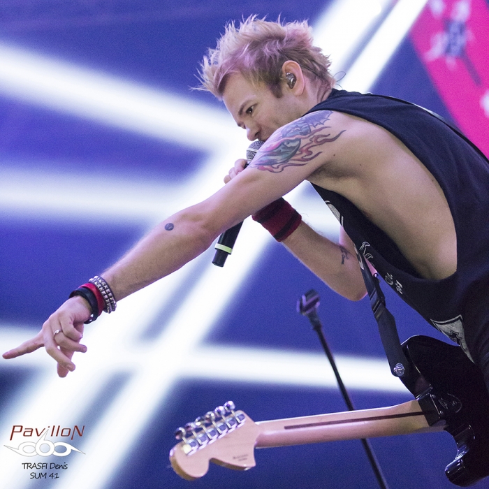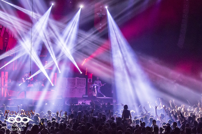Ca y est, nous pouvons rentrer. Les photographes accèdent au Pit. Nous voilà devant un immense drap blanc cachant la scène. Derrières nous le public est prêt et attend SUM 41 avec impatience. C’est parti, le rideau tombe. Le groupe investit la scène. Le show commence !!! Malheureusement les galères commencent. Le son est médiocre. Les basses sont trop puissantes et engloutissent tout. Le chant est parfois inaudible et oblige notre chanteur à limite hurler lors des passages plus appuyés. Pour rajouter à ce tableau, les lumières sont plus que hasardeuses. Lors de la première chanson « A Murder of Crows », Deryck Whibley est obligé d’arrêter pour signaler qu’il ne voit rien. On a l’impression que la rampe d’éclairage frontale vient de lâcher…