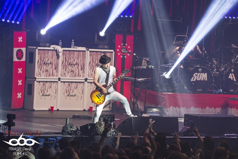 Mais quand on s’appelle SUM 41, de renommée internationale et que l’on est venu faire la fête à Paris, on ne s’arrête pas à ça ! En vrai pro il recommence la chanson et assure un gros show pendant plus de 2 heures. Avec un décor en arrière-plan rouge et noir gratifié de la croix de leur dernier album « 13 Voices », le groupe enchaïne les morceaux « Fake My Own Death » puis « The Hell Song », pour prouver qu’ils sont bien là. La fosse commence à bouger. Les morceaux s’enchainent avec notamment « Screaming Bloody Murder », « War », « Motivation ». Nous avons droit également à une reprise d’Iron Maiden avec « Trooper ». A la fin de « Makes No Difference », Deryck Whibley descend dans la fosse du Zénith où une petite scène provisoire y était installé. Au cœur de son public il a pu communier avec le morceau « With Me ». Les fans sont ravis. Ils font partis d’un ensemble où SUM 41 en est le noyau. Les lampes torches des portables s’illuminent partout dans ce Zénith immense mais devenu si intimiste… alchimie opère… Et puis s’est reparti sur des chapeaux de roues avec « God Save Us All (Death to POP) ». Puis les morceaaux s’enchainent encore et encore avec également une reprise de Queen. Des solos de batteries, de basses et de grat’. Tout le monde y va de sa technicité. De très bons musiciens et showmen !