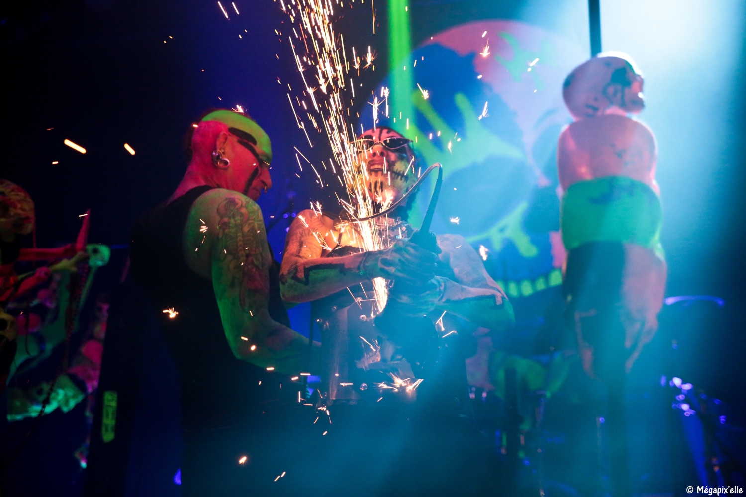 La soirée, du moins la fin d’après-midi s’engage avec les vainqueurs du tremplin, les Rémois de INWARD. Joué devant très peu de monde est compliqué et le manque de retour de la foule pourrait déstabiliser certaines formations. Il n’en fut rien, INWARD à déroulé son Deathcore (c’est l’étiquette qui me parait la plus adéquate.) avec aplomb et violence. Bravo, c’est propre, j’ai aimé. La caution Rock du festival était assurée par THE WARM LAIR. Un son hard rock, old school, blues avec quelques pincées de Western bien gras et plutôt original qui dénote un peu avec la suite de ce 3 metal fest. Mais cela importe-t-il ? Non… J’ai trouvé ce groupe très en place et appliqué, le tout mené par un chanteur/ soliste très plaisant à voir et entendre. Place aux locaux de l’étape. SLEAZYZ, c’est un cocktail explosif de metal, de glam, de punk des années 80 et du cinéma d'horreur magnifiquement mis en scène avec des projections par des musiciens aux maquillages effrayants. En gros de quoi passé un bon moment ! Le groupe est au top, pas grand-chose à redire de leur prestation qui fut hyper groovy et malfaisante à souhait. Ma petite valeur sure PORNO GRAPHIC MESSIAH que j’ai découvert au Fertois metal Fest cette année en extérieur est encore meilleure (si, si) et indoor ! Toujours aussi travaillé et immersif, le show des PGM est impeccable et à immédiatement séduit le public. Les compos sont bien ficelées et les refrains restent en tête, c’est de l’excellent travail. Un groupe français, original, bosseur et super sympa, à découvrir si ce n’est pas le cas. Aura-t-on assisté au dernier concert de Punish Yourself ? Il semblerait bien que oui… Je ne développerai pas les accusations et autres faits reprochés, mais le groupe a annoncé se séparer prématurément avant la fin de cette tournée d’adieu faisant de Troyes sa dernière date. Depuis 1993 ces zombies fluos arpentent les scènes, donnant des prestations hallucinantes qui impactent les cerveaux. J’ai passé un excellent moment avec les Punish, jamais l’on ne s’ennuie et c’est très impressionnant tout ce bazar sur scène, ces maquillages, les petits happenings avec la disqueuse etc.… Dommage de clore une carrière sur des faits douteux, mais je ne retiendrai ici que cette belle prestation donnée chez moi. Un chouette festival qui a eu le mérite de proposer de l’originalité et des groupes qui ont beaucoup travaillés leur image et leur show, merci à vous. |