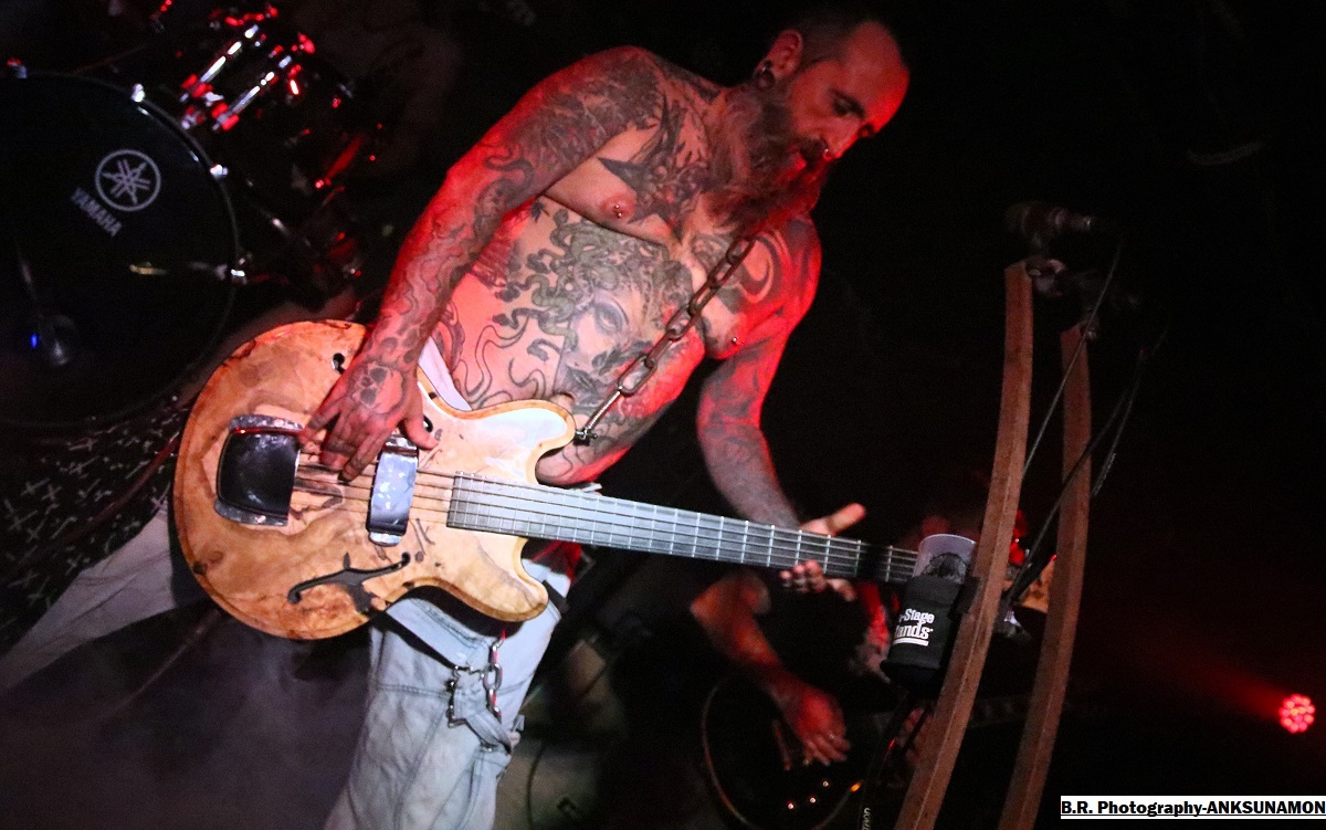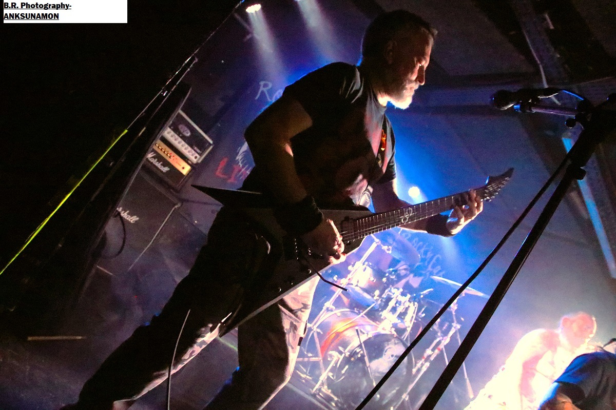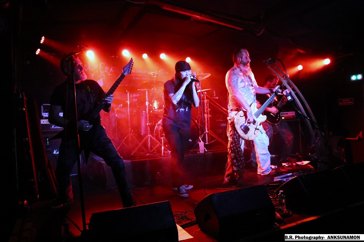 Il est 20 heures à l'horloge du Rock n'Eat lorsque ceux d'EVER AFTER du Nord Isère ouvrent le petit bal du Samedi soir avec leur metal symphonique à deux voix. Oui deux voix, celle d'Hélène en clair et celle de Laurent (Lolo Bass) pour les « growls ». Et ça fonctionne plutôt bien avec leur metal qui fait la différence entre agressivité et envolées théâtrales. Vous avez apprécié leur premier EP « Lost Control » paru en 2020 et ensuite leur premier album « Fucking Phoenix » paru en 2022, alors vous êtes prêts a rencontrer la formation en live, ce que vous avez fait ce soir. Et je suis sur que ce metal symphonique pas comme les autres vous a séduit, amen ! Pour la suite, ce sera en quelque sorte un « flash-back » dans les 80's avec le heavy-metal de GALDERIA, un groupe venu de Marseille pour vous faire « sauter en l'air » sur leur metal traditionnel, heavy, speed et power si vous voulez. Depuis l'an 2006, nos sudistes peaufinent leurs titres parus sur des Eps et 3 albums, mais toujours avec cette volonté de faire chanter un public sur des refrains accrocheurs, mais un peu répétitifs à mon goût. Rajoutez à leur prestation une pincée de « true metal », un peu de binaire plombé et des guitares bavardes en riffs et soli et le tout va satisfaire un public amateur du genre ce soir. Du power-metal au thrash il n'y a qu'un pas (vous croyez?) que ceux de la région parisienne (Mantes-la-Ville) ICELAND franchissent allègrement, sans faux semblants, sans compromis. Ici, ça passe ou ça casse, mais au final ça passe très bien avec leur metal tranchant et abrasif à souhait. Ce groupe n'est pas né de la dernière pluie métallique car formé à l'origine au début des 90's, mais séparé en 1998 après un album qui avait fait parler la poudre et de nombreuses tournées au succès certain.Et puis il se reforme en 2021 et c'est reparti pour du « bourrin » comme quoi ! D'ailleurs ce soir aux bout de quelques titres ça « bourrine » devant la scène, signe que les compositions d'Iceland ressuscité font leur œuvre. Et, cerise sur le gâteau on nous offre une reprise de Sepultura bien sentie, du coup personne de refuse, personne ne résiste ! Alors le groupe semble se faire plaisir et nous aussi par la même occasion. Merci les gars quel chaud moment passé en votre compagnie, on aime. Du thrash au death...patati, patata il n'y a qu'un pas mais quel pas avec la venue d'ANKSUNAMON, des locaux burinés du metal extrême qui vont d'entrée de jeu nous éjecter de nos sarcophages à l'aide de compositions inspirée par l’Égypte ancienne (non ce n'est pas Nile enfin quoi!). Né en 2000, puis semblant décédé, son tombeau musical est redécouvert récemment dans la vallée des rois, non pas en Egypte mais dans la cité des Gaule. Anlsunamon revient maintenant hanter les salles obscures avec la brutalité de guitares death, une basse lourde de conséquence , une batterie monumentale et des vocaux d'outre-tombe(sic). Le propos est grave flirtant parfois avec ce que l'on nomme grindcore, les titres sont bien différents les uns par rapport aux autres et l'on apprécie, le public aussi semble-t-il. Bref, Anksunamon nous a explosé la cervelle qui semblait momifiée depuis longtemps et ce fus bien (qui a dit comme d'habitude ?). Au final, cette seconde soirée fut une belle réussite, alors merci aux organisateurs, merci aux 4 groupes en lice qui nous ont fait part de leur passion dans des paysages metal différents et merci bien entendu au Rock n'Eat pour le bel accueil ! |
