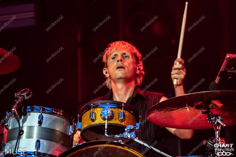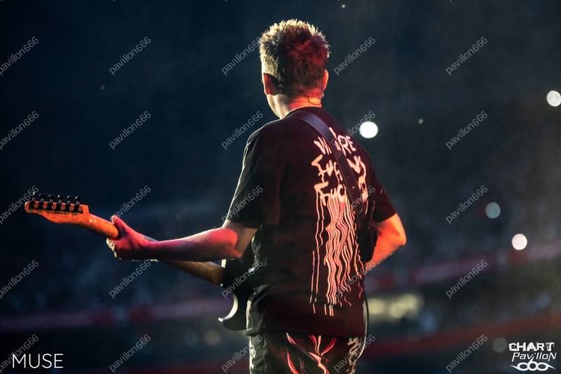 Il est temps d'accueillir comme il se doit la tête d'affiche de la soirée, la raison pour laquelle tant de personnes se sont réunies en cette enceinte. MUSE est actuellement en train de promouvoir son nouvel album "Will Of The People", mais pas seulement. Il s'agit également de célébrer les trente années de carrière de ces musiciens. MUSE est venu nous présenter un set des plus pertinents pour l'occasion. Après une entrée en scène avec le morceau "Will Of The People", accompagnée d'un logo enflammé en arrière-plan, le trio enchaîne rapidement avec "Hysteria". On sent déjà un groupe en grande forme prêt à nous offrir un spectacle époustouflant. Les vidéos des fans publiées sur Internet nous laissaient présager quelque chose d'exceptionnel, mais le voir en vrai est encore différent. Le concert de ce soir s'avère être à couper le souffle, non seulement grâce à sa set-list, mais aussi grâce à son spectacle grandiose. Il y a des groupes, comme celui-ci, qui savent s'adapter aux stades, et cela n'est pas donné à tout le monde. Pour l'occasion, MUSE dispose d'une longue avancée de scène et d'un jeu de lumières éblouissant. La qualité sonore est également au rendez-vous, malgré les difficultés acoustiques du stade, le rendu est impeccable. Tout est en place pour que nous puissions profiter de morceaux puissants tels que "Bliss", "Resistance", "Compliance", "Time Is Running Out", "Undisclosed Desires", "Madness", "Supermassive Black Hole", "Plug In Baby" et "Starlight", pour n'en citer que quelques-uns, car la liste est longue. Mais elle a été choisie avec soin, ne comportant que les meilleurs titres du groupe. La mise en scène de tout cela est incroyable, à la hauteur des plus grands spectacles, avec des personnages inquiétants en arrière-plan. Les musiciens portent également des masques à différents moments. Mais surtout, l'ensemble dégage une aura majestueuse, où chaque détail est millimétré et techniquement maîtrisé de A à Z. Nous retiendrons également le rappel avec "Kill or Be Killed" et l'incontournable "Knights Of Cydonia".