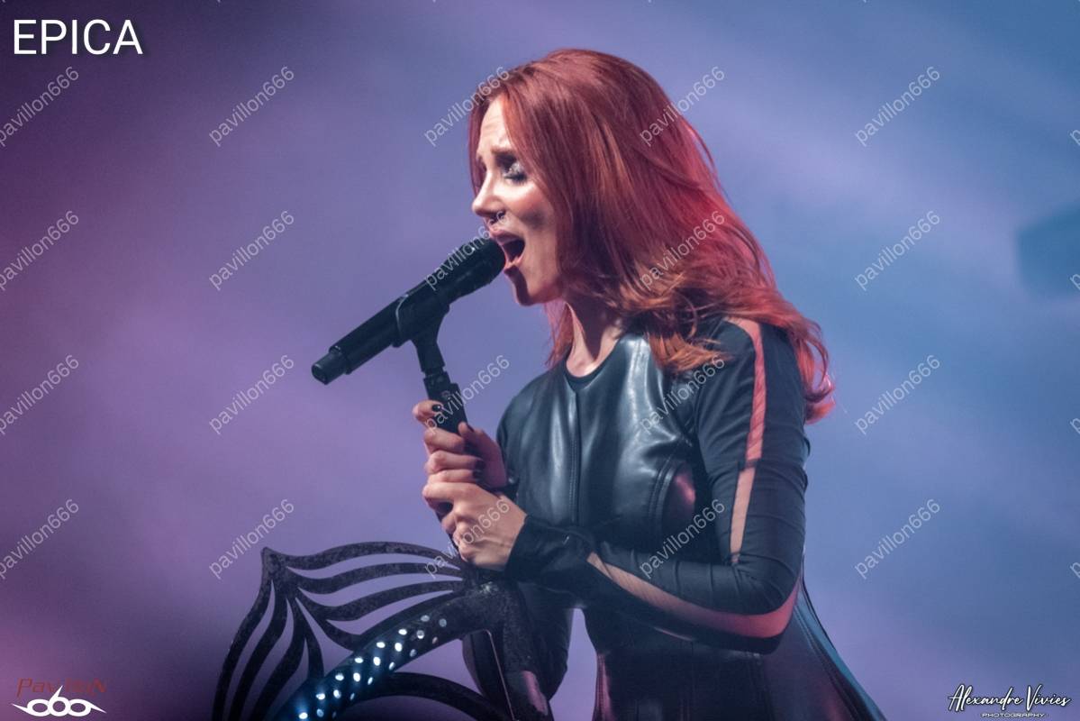 C’est sur « Apparition », tirée du nouvel album, et sous les clameurs de la foule que le groupe fait son entrée. Pour cette première chanson, la scène est très sombre, toute en contrastes. La chanteuse Simone Simons la domine depuis sa plateforme et apparaît presque spectrale sous son voile noir et son enveloppe de fumée.