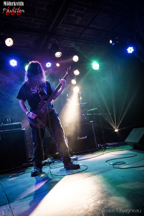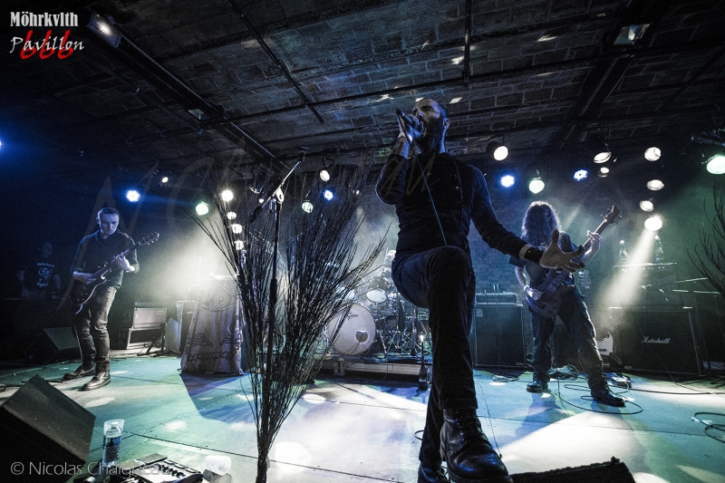 A mon arrivée sur place je n’ai pas le temps de faire le tour des lieux : le premier set va commencer dans la « Halle », la plus grande des deux salles où se produiront les groupes aujourd’hui. D’ailleurs, pressés par le froid et l’humidité les festivaliers s’y engouffrent dès l’ouverture. Ce premier set nous emmène bien loin de ce à quoi on pense d’abord à propos d’un festival pagan puisque les Français de Toter Fish chantent… la piraterie des Caraïbes ! Et c’est un contre-pied extrêmement agréable qui ouvre les festivités sur une note très joyeuse, presque dansante au son d’un accordéon et de riffs très rythmés. La salle est bien remplie pour ce démarrage dédié au rhum plutôt qu’à l’hydromel. Sur scène, cordages de bateaux et tricornes sont de mise pour créer l’ambiance. Le quintette est quant à lui très joyeux et communicatif. A la fin du set il me faut courir un peu : pas de pause entre les concerts, juste le temps de changer de salle ! Et « l’Abreuvoir », salle bien plus petite que la Halle, ne peut malheureusement pas contenir tous les festivaliers qui souhaitent voir les bretons de Möhrkvlth. Ce deuxième concert de la journée est sans conteste mon coup de cœur de ce festival. Dès le moment où on entre dans la petite salle au plafond bas on pénètre dans une ambiance feutrée très travaillée. L’atmosphère est emplie d’encens et seule une faible lumière verte venue de la scène éclaire l’endroit. Des rameaux de plantes décorent les micros. Les membres de Möhrkvlth entrent sur des chœurs et nous délivrent une communion de Black Metal en Breton. On n’arrive pas à se décider de savoir si la performance est déchirante ou au contraire extrêmement pure tant les membres du groupent semblent plongés dans leur musique. Chacun à leur manière d’ailleurs : si les musiciens semblent plutôt être plongés loin de nous dans leur jeu, le chanteur a lui l’air complètement habité. C’est LA claque du jour, qui donne un petit frisson que malheureusement on ne retrouvera pas. Surprise en voulant changer de salle : le public de Dordeduh a complètement rempli la Halle et tout le monde ne peut pas entrer. Ce sera d’ailleurs à partir de ce moment un problème récurrent à chaque passage de groupe : il n’y a pas assez de place pour tous les festivaliers. Dans la petite salle de l’abreuvoir on peut le comprendre mais c’est décevant lorsqu’il s’agit d’aller voir la scène principale. Je réussis néanmoins à me frayer un chemin pour écouter le groupe. La performance ne me convainc pas du tout malheureusement. Je trouve le set globalement mou, voire poussif, et le public écoute sans conviction apparente. Je décide donc de quitter la Halle pour faire le tour du festival. Dehors il n’y a pas foule : le temps maussade et froid n’appelle pas à prendre l’air. Cependant il y a quand même quelques personnes devant le petit bar extérieur à profiter d’une bière ou d’un hypocras. Un peu plus loin dans la cour un feu fait le bonheur de ceux qui veulent se réchauffer les mains. Pour rejoindre l’espace du merch et de la restauration, il faut sortir de l’espace festivalier. C’est assez rare pour le noter qu’un festival laisse un accès ouvert à tous. Par contre je n’ai tout de même pas eu l’impression que beaucoup de Noisiéliens soient venus en profiter. Ce côté est bien plus peuplé que devant le petit bar extérieur : météo toujours, les festivaliers ont tendance à se mettre à l’abri. Outre le merchandising des groupes, on trouve les classiques stands d’artisanat, de GN et de bijoux pour médiévistes et/ou metalleux. L’intérêt principal de l’endroit reste la restauration : l’équipe de Cuisine Historique nous propose diverse salades, assiettes de charcuterie ou végétariennes, quiches et tartes à un tarif raisonnable par rapport à ce qu’on trouve souvent en festival. Je m’interroge cependant sur la disponibilité de places assises lorsque viendra l’heure du repas pour la plupart des festivaliers. Accompagnés d’une musique médiévale très douce qui ne prend pas le pas sur les conversations, deux danseuses dont une montée sur échasses offrent une performance de chorégraphie maniant des grands foulards. Non sans prendre un hypocras en passant, je retourne du côté des scènes pour assister au passage de Perkelt. Le trio nous offre un set très agréable et doux, guidés par les mélodies de la frontgirl flutiste et la petite salle de l’abreuvoir prend une ambiance chaleureuse. On regrette juste les réactions masculines complètement inappropriées qui fusent dans la salle. Je m’éclipse néanmoins de cet excellent concert pour aller écouter une partie de la conférence de Grégory Moigne sur le Paganisme et la culture Metal. Celui-ci n’est pas seulement le frontman de Möhrkvlth mais aussi professeur d’Histoire, double doctorant en Histoire des religions et celtique et biographe du 5e grand druide de Bretagne. Il résume tout cela avec humour en se présentant comme « la caution intellectuelle du festival. » Si le sujet est tout aussi intéressant que sa manière de l’aborder – un parallèle entre l’évolution des genres de metal tournés vers nos racines et l’avènement d’une culture pagan – on regrette les conditions dans lesquelles se déroule la conférence : Grégory Moigne se tient entre le stand de restauration et les tables dans le Caravansérail et s’il ne se démonte pas on le perd malheureusement dans le bruit ambiant. Au final seules quelques personnes maintiennent leur attention sur cette intervention qui aurait mérité d’être plus mise en valeur. Je retourne en courant vers la Halle où Dalriada a commencé à se produire. Faisant de nouveau face à une salle comble je dois me faufiler à travers le public pour pouvoir profiter du set. L’ambiance est excellente : le groupe est extrêmement dyna