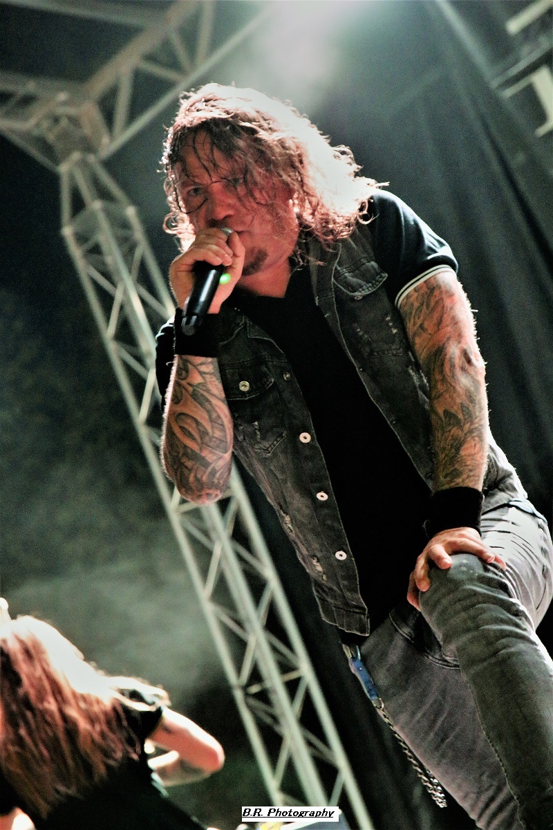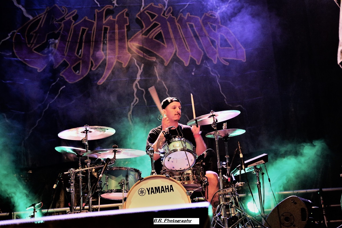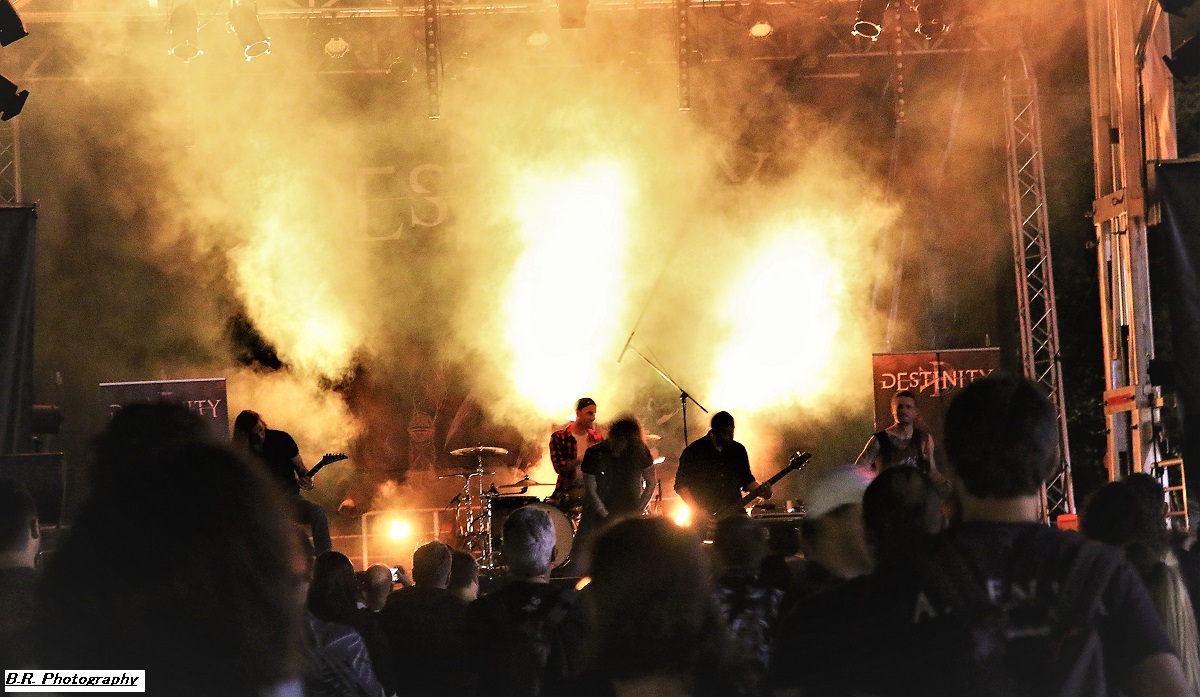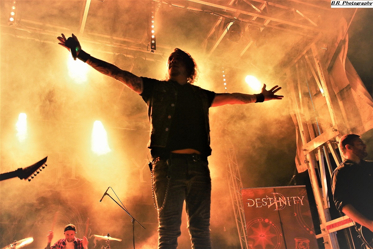 A 17 heures, ce n'est pas encore l'heure de l'apéro (quoique), mais l'heure de déguster la prestation de WHISKY OF BLOOD. Voilà donc du hard-rock bien ficelé qui fait taper du pied comme l'on dit communément, c'est « sex, drink and Leymfest », rock n'roll quoi ! Leur set va mettre enjambe un public d éja la avec notamment des compositions qui figureront sur leur prochain album, des titres bien sentis, on aime enfin, bravo les gars et fille pour ce binaire en folie ! La fanfare KARLEK toujours fidèle à elle même reprend des classiques du metal entre chaque formation du festival (on me dit à l'oreille qu'ils ont même reprit un titre de Destinity). Bravo l'équipe, c'est de la bonne, continuez donc comme cela ! LAST ADDICTION est né dans les Terres Froides du Dauphiné mais ils nous convient à un concert tout en chaleur à l'aide du chaud et froid de leur post-core, post metal, post-rock, poste quelque-chose qui se veut diversifié entre passages respirant une certaine rage et des envolées metalcore du plus bel effet. Le public, leur public fidèle du groupe suit avec attention l'ascension de cette formation promise à un bel avenir, amen ! LODZ qui prend la suite nous emmène dans un monde particulier où les étiquettes courantes n'ont pas lieu d’exister. Lodz nous propose donc des voyages plutôt atmosphériques, mélodiques et souvent tortureux et torturés. Mais tout cela reste bien puissant à l'aide de lourdeurs doomesques bien entendu. Après 4 albums et de nombreuses prestations « live », ils n'ont plus rien à nous prouver. Beau concert ce soir à Leyment ! Après un certain calme sous-jacent, voici l'orage nommé EIGHT SINS avec son menu pimenté de thrash-core qui va déclencher la guerre ni plus ni moins dans un public prêt à en découdre et chaud comme la braise. Au menu donc mosh-parts et circle-pits enragés mais pour le fun ! Le frontman nous invite à la destruction à l'aide de riffs tranchants et malsains, mais le tout reste non dénué d'humour quand même, faut pas déconner !. Alors c'est une certaine rentrée des classes hardcore ce soir avec Eight Sins, Loxiput nous annonce la couleur c'est « love, beers and moshpits ». Le groupe n'a pas fini de nous éclater la cervelle, et les jambes, il semble même se bonifier avec le temps voyons ! DESTINITY, poids lourd de la scène Lyonnaise (mais pas que) avec ses 10 albums parus depuis la fin des 90's, est venu ce soir se frotter au public du Leymfest qui l'accueille avec enthousiasme comme il se doit. Et puis comme nous l'avait suggéré leur album du retour « In Continuum », Destinity nous propose à nouveau une certaine violence mélancolique sublimant son engagement qui nous à toujours proposé son death mélodique clin d’œil à l'école Suédoise dite « death de Gotheburg ». Un death agressif et groovy à la fois et en live nos amis Lyonnais tiennent le public au creux de leurs mains en nous emmenant sur les chemins d'un certain death-melo old-school toujours accessible, on aime DEATHLESS LEGACY ce sont les fils et filles spirituels du fameux groupe Italien Death SS et leur passage sur la scène du Leymfest ce 2 Septembre 2023 va laisser des traces dans nos mémoires avec donc une découverte se révélant magique, occulte et intemporelle. Alors ici on navigue entre black-metal, horror metal et metal gothique. Ici le set est coloré et théâtral, à l'Italienne pourrait-on rajouter. Chacune de leur composition offertes ce soir voit l'intervention de personnages inquiétants s’adonnant à des rituels glauques et malsains, Tout devient envoûtant sur des rythmiques souvent plombées et incendiaires de neurones. La chanteuse/prêtresse Steva mène son petit monde musical à la baguette, une baquette magique semblant diriger les musiciens pour une messe noire aux évulsions talentueuses. Bref, Deathless Legacy, un nom à retenir et malheur à vous si vous ne pouvez venir les apprécier en « live », quel spectacle merveilleusement malsain, Je ne trouve pas les mots pour remercier les organisateurs passionnés et les bénévoles, techniciens et autres instigateurs de ce Leymest. Toiut était parfait jusque dans les moindres détails et l'on ne peut que s’exclamer « quel festival » ! Alors un seul souhait, celui de revenir dans ces lieux pour un prochain Leymest , le 9 en 2024 bien entendu, amen ! |