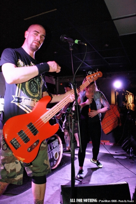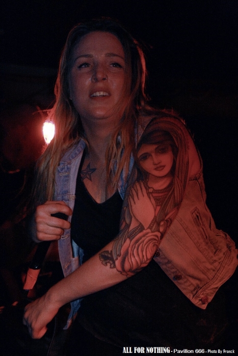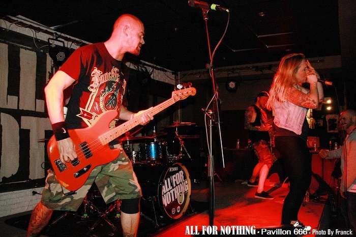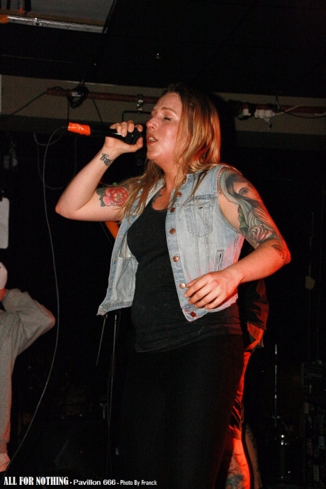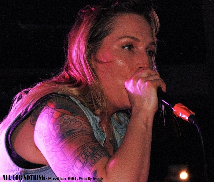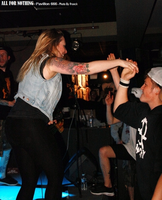 J’aime autant vous dire que lorsque ça a démarré, ce n’était pas du diesel. Radio Metal Sound ainsi que la totalité des groupes ont mis direct le pied sur l’accélérateur et je peux vous garantir que c’est pied au plancher que se sont enchaînés les sets des six combos en présence. La soirée démarre donc en force avec nos coreux locaux de Pit Disorder qui ne vont pas nous ménager les tympans en débutant cette soirée avec un gros set. Nos lyonnais sont en forme et c’est parti pour le gros son et d’emblée ils vont placer la barre assez haut et ça va être au tour des cinq autres groupes de faire aussi bien. Leur hardcore épais et furieux déchaîne déjà le pit où les séances hardcore, muscles et karaté commencent. Le chant rageur de Boris sait faire toute la différence et invite le public à se remuer. Pit Disorder a trouvé en la présence de Damien une guitare qui donne l’effet de coups de haches avec disto californienne totalement énorme à l’appui. La section rythmique composée d’Alex à la Basse et de Bij à la batterie est époustouflante. Ca cartonne un maximum comme à l’ancienne et c’est ultra puissant. Les garçons ne ménagent pas leurs efforts et sont déjà trempés comme des rats. Au Blogg ce soir, pas besoin de chauffage, dès le set de Pit Disorder c’est déjà une loge de sudation. Franchement, nos quatre lyonnais assurent à mort avec ce premier set hardcore extrême plutôt enlevé. On ne peut que se féliciter d’avoir un tel groupe dans notre ville. Vivement leur prochain concert !! En attendant, vous pouvez les retrouver via leur page facebook et découvrir leur premier Ep téléchargeable en ligne. https://www.facebook.com/PitDisorder/?fref=nf Les changements de plateaux vont aller à toute allure ce soir. J’aime autant vous dire que sur scène, ça pulse et ça transpire dur. Radio Metal Sound essaye de récupérer le temps perdu histoire de finir sans dépasser la marge et franchement ça le fait. Un coup de « one, two », « one, two » dans les micros, deux ou trois riffs à la basse et aux grattes, un sextolet sur la caisse claire, « boum, boum, boum… » un peu de pédale de grosse caisse et ça y est c’est parti. Ce sera le même menu express pour tout le monde ce soir. C’est donc reparti avec Parjure aux commandes et leur hardcore incisif a l’accent metal tranchant de chez tranchant. Oscillant entre le punk hardcore, le metalcore avec une pointe de death et le tout bien toasté, Hugo balance dans son micro des textes totalement enragés. Je me garde toujours de faire des comparatifs musicaux avec des tas d’autres groupes car j’estime que chaque groupe a sa propre empreinte, même un cover band. Et chez les savoyards de Parjure pour avoir de l’empreinte, il y en a. Parjure possède une très forte identité musicale surtout dans cette façon qu’ils ont d’interpréter leurs titres où les voix se répondent en permanence les unes aux autres, c’est un ensemble cohérent qui donne une grande force à l’image du groupe sur scène. C’est un groupe qui a de la puissance, les fondations sont solides et chaque riff vous écrase. Musicalement c’est impeccable, le son est également d’enfer, toutes les conditions météos sont réunies pour se prendre en pleine tronche un nouveau set absolument énorme et Parjure l’a fait, ils ont donc tenu leur serment… Si vous ne connaissez pas Parjure, alors c’est une erreur et pour vite combler cette lacune, vous trouverez leur lien Bandcamp ci-dessous pour vous en mettre plein les oreilles. http://parjure.bandcamp.com/album/keep-your-elbows-straight Encore un changement express de plateau et là, ce qui nous est tombé dessus les amis, c’est presque la foudre ou tout comme. Il s’agit des Stinky, un groupe résolument énorme originaire de Clisson. Toutefois ils ne seront pas au Hellfest, mais plutôt à l’Xtrême Fest du 29 au 31 juillet à Albi. Emmené par Claire au chant, ce combo vous retourne littéralement les tripes. La scène du Blogg va totalement prendre feu sous les baskets de la jeune chanteuse qui fout sans modération ses propres tripes sur les planches et c’est à nous de faire le tri au beau milieu de tant de puissance, c’est phénoménal. Claire hurle tout ce qu’elle a dans les abysses de son cœur et l’ouragan sonore se déchaine autour d’elle. Les textes ne sont pas bidons, ils sont vraiment poignant et démontre bien que le hardcore n’est pas réservé à des bourrins au crane rasé, en short NBA et tatoués de partout. Il peut y avoir dans les textes une vraie force qui découle d’une certaine fragilité et d’une poésie sombre et désenchantée. Ainsi des titres comme « Tears in the rain » ou encore « Between lies and life » et j’en oublie, sont les témoignages vivant du message que le hardcore aussi violent soit-il, peut faire passer. Les Stinky sont tout à fait dans l’esprit d’All For Nothing et de ce que Cindy essaye de transmettre au public. Il y a là dedans une forme de pureté et de simplicité qui est en parfaite cohésion avec l’énergie de la vie elle-même. Et de l’énergie, croyez moi que sur scène il y en a. Voyant à chaque titre le set monter en puissance, j’ai cru à un moment que tout allait disjoncter. Claire est de partout à la fois, sur scène, dans le public, chacun de ses mots percutent l’auditoire. Les autres musiciens sont au taquet et tous d’un excellent niveau. Seul un des guitaristes assure chœurs et contre chants donnant appui et réplique au chant de Claire. Les Stinky pratiquent un hardcore mélodique et sauvage aux tendances plus traditionnelles, bien que l’on soit déjà dans les concepts modernes du hardcore qui découlent de Madball. Les Stinky ont sorti un magnifique album en 2015, « Against Wind And Tide » qui sera bientôt chroniqué chez Pavillon 666. Afin de découvrir ce groupe résolument énorme qui dans l’avenir est destiné à pre