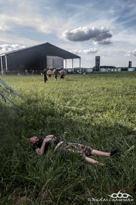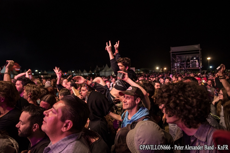 KnFR : C’est à 12h40, que je commence mon premier concert du Download avec le groupe français « Laura Cox Band » sur la scène Firefly du camping devant un très petit comité de spectateurs. C’est sur ‘Hard Blues Shot’ qu’elle débute son concert, et grâce à ses riffs très ‘ac/dciens’ la magie opère presque instantanément avec son public, sachant que pour beaucoup c’était une découverte, et au fil des chansons, son auditoire grossira à vue d’œil. Sa musique déborde d’énergie, et c’est ça qui est agréable, sur la dernière chanson, tout comme le faisait Angus il y a très longtemps, elle grimpera sur les épaules d’un road, et ira fendre la foule, tout en continuant à jouer sur sa guitare Bacchus. A la fin de leur concert, le groupe ira même à la rencontre de son public dans une ambiance très bon enfant, pour une longue séance de dédicaces, photos… NICO : Arriver au Download commence par la vieille habitude du festivalier : la randonnée ! Du parking ou de la gare au camping ou directement au site nous affrontons tous le soleil sur une bonne distance, certains s’abritant déjà sous leur tentes (repliées) en pensant à la chance qu’ont eu ce qui se sont garés plus près. Pour ma part je ne passe pas par la case camping et dès mon arrivée sur le site que je prendrai le temps de parcourir plus tard je fonce devant la Main Stage 2 pour voir démarrer le set d’Eluveitie. Les Helvètes sont très bien accueillis par les festivaliers pour l’instant peu nombreux. Qu’importe, ils nous produisent un set très agréable, je dirais même joyeux où les membres du groupe partagent entre eux et avec leur public nombre de sourires. Les fans ont apparemment passé le temps d’adaptation au nouveau line-up et reprennent en chœur le fameux Inis Mona qui clôt ces petites 40 minutes de folk metal suisse. Pas le temps de s’arrêter pour les nombreux fans communs qu’ont Eluveitie et Powerwolf. Les Allemands prennent possession de la Main Stage transformée pour l’occasion en église à ciel ouvert et la « Metal Mass » s’impose à Brétigny. Comme à leur habitude ils produisent un show grandiloquent, devant un public déjà plus dense que ce qu’on a pu voir plus tôt dans la journée. Le Download Festival se voit alors le lieu de la première mondiale live du dernier morceau de Powerwolf : « Demons are a girl’s best friend » sorti sur Youtube quelques semaines plus tôt. La foule reprend le refrain sans hésiter comme elle le fait pour les classiques « Resurection by Erection » ou « Sanctified with Dynamite ». La recette de Powerwolf marche, le live est excellent, dynamique, partagé avec les festivaliers. KnFR : Il est maintenant l’heure de rejoindre la Mainstage 2, pour un show très en couleur avec la joyeuse bande de pirates : d’Alestorm. Comment ne pas voir l’immense canard-sextoy qui trône au milieu de la scène… ainsi que le backdrop complètement farfelu avec des bananes ? C’est sur le titre « Keelhauled » qu’ils vont nous embarquer sur leur rafiot, et que l’on va naviguer sur un océan de chansons très porté sur la bibine… l’ambiance très festive nous ferait presque oublier que nous sommes au Download. Bowes le chanteur, claviériste en bandoulière flanqué de son kilt, s’amusera beaucoup sur scène à faire des farces en tout genre : demander à un des roads, de jouer de la guitare folk en caleçon sur scène, et le public ne se fera pas prier 2 fois, quand Bowes leur propose de faire un « wall of death ». Au bout de 40/45 minutes de show, il est malheureusement temps de siffler la fin de cette recréation. NICO : Loin des deux Main Stage le Download vit également sur la Warbird et la Sptifire. C’est sur cette dernière que vient se produire Sidilarsen. Le groupe qu’on ne présente plus aurait pu (dû ?) bénéficier d’une scène plus grande pour venir « Retourner la France », d’ailleurs le public est serré devant la toute petite Spitfire Stage. Peu importe, les membres du groupe donnent tout, sautant dans un joyeux bordel très communicatif. Ils sont rejoints par Poun et Arno de Black Bomb A le temps du morceau « Le meilleur est à venir », paroxysme de ce set endiablé hors de tout. KRIST : Sur la Mainstage 1, ce sont les suédois de Opeth qui investissent les lieux, avec leur métal progressif. Mis à part leur premier titre ‘Sorceress’ d’une durée classique de 4-5 minutes, nous aurons droit après à des titres assez long une dizaines de minutes chacun (comme ‘Ghost of Perdition’, ‘Heir Apparent’, ‘The Drapery Falls’) et si l’on ajoute à cela, le fait que les membres du groupe étaient tous assez statique sur scène, j’ai personnellement pas trop accroché à leur show, il manquait pour moi un dynamisme sur scène. Après Opeth possède en France une fan-base assez conséquente, vus le remplissage assez conséquent du pit devant la scène. NICO : Si les festivaliers sont allés se masser en nombre voir Opeth, il en reste tout de même devant la Warbird Stage qu’occupe à présent Underoath, inconnus pour moi. Les américains nous founissent un set de hardcore très sympa à un détail près… il n’y a aucune pèche sur scène, aucun charisme. L’énergie provient du son, pas du groupe, pas de la scène du coup c’est quelque chose d’assez décevant, qui laisse un petit gout de pas fini. Underoath est personnellement le petit bémol de cette journée de festival mais ils semblent tout de même avoir leurs fans qui profitent de leur passage. Le public n’est pas dense mais pas non plus clairsemé et bouge assez bien. Je quitte néanmoins assez vite la Warbird pour rejoindre la Main Stage 2 où va prendre place… Ghost. Nous ne parlerons pas des tractations de ces dernières années à propos du groupe, nous sommes là pour profiter du show, voir du grandiloquent… et attendre une heure que ça décolle. Bon, le principe de Ghost n’a