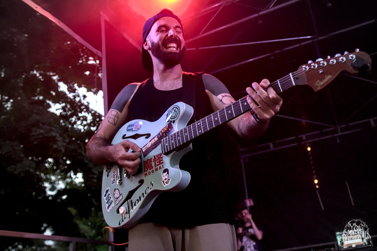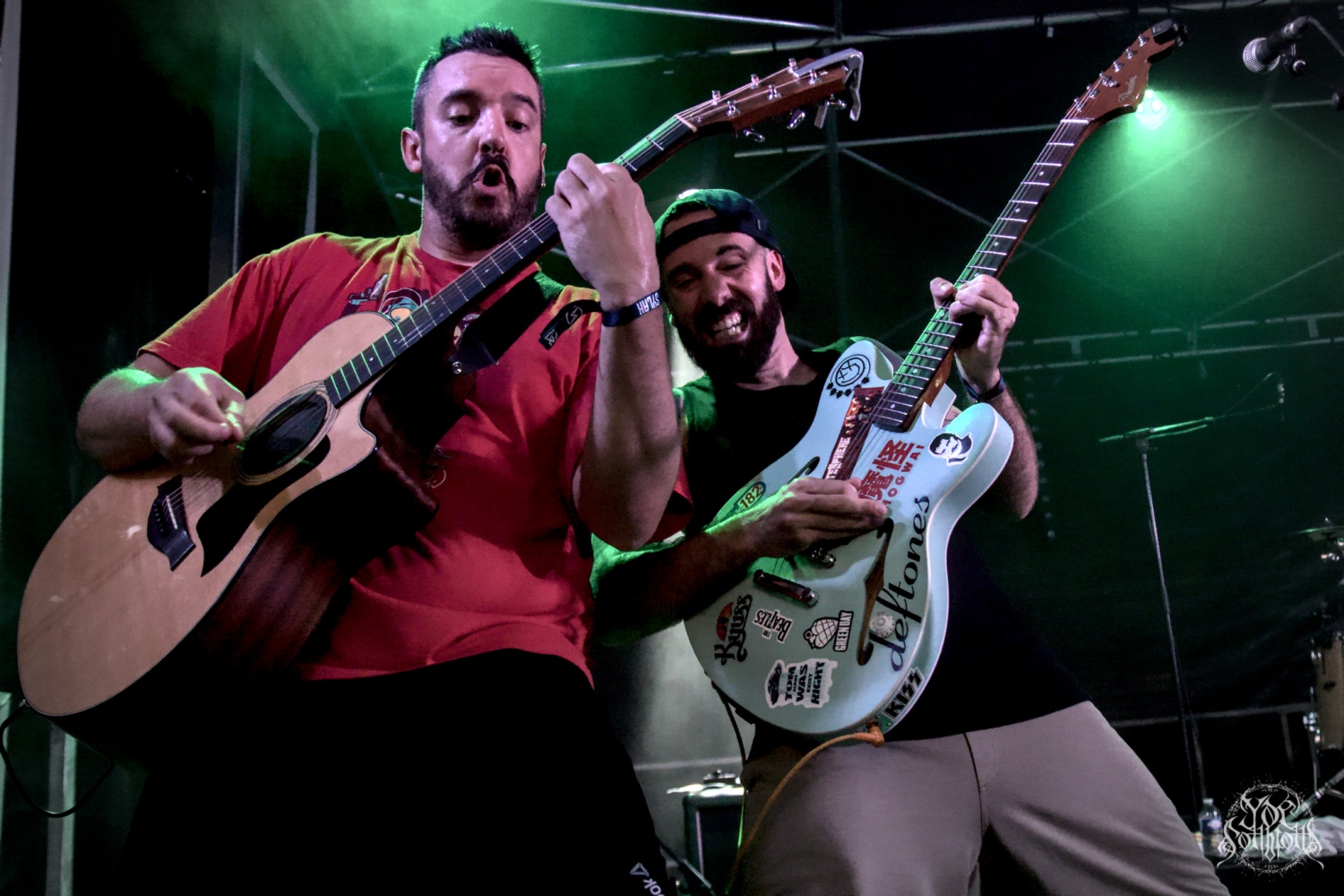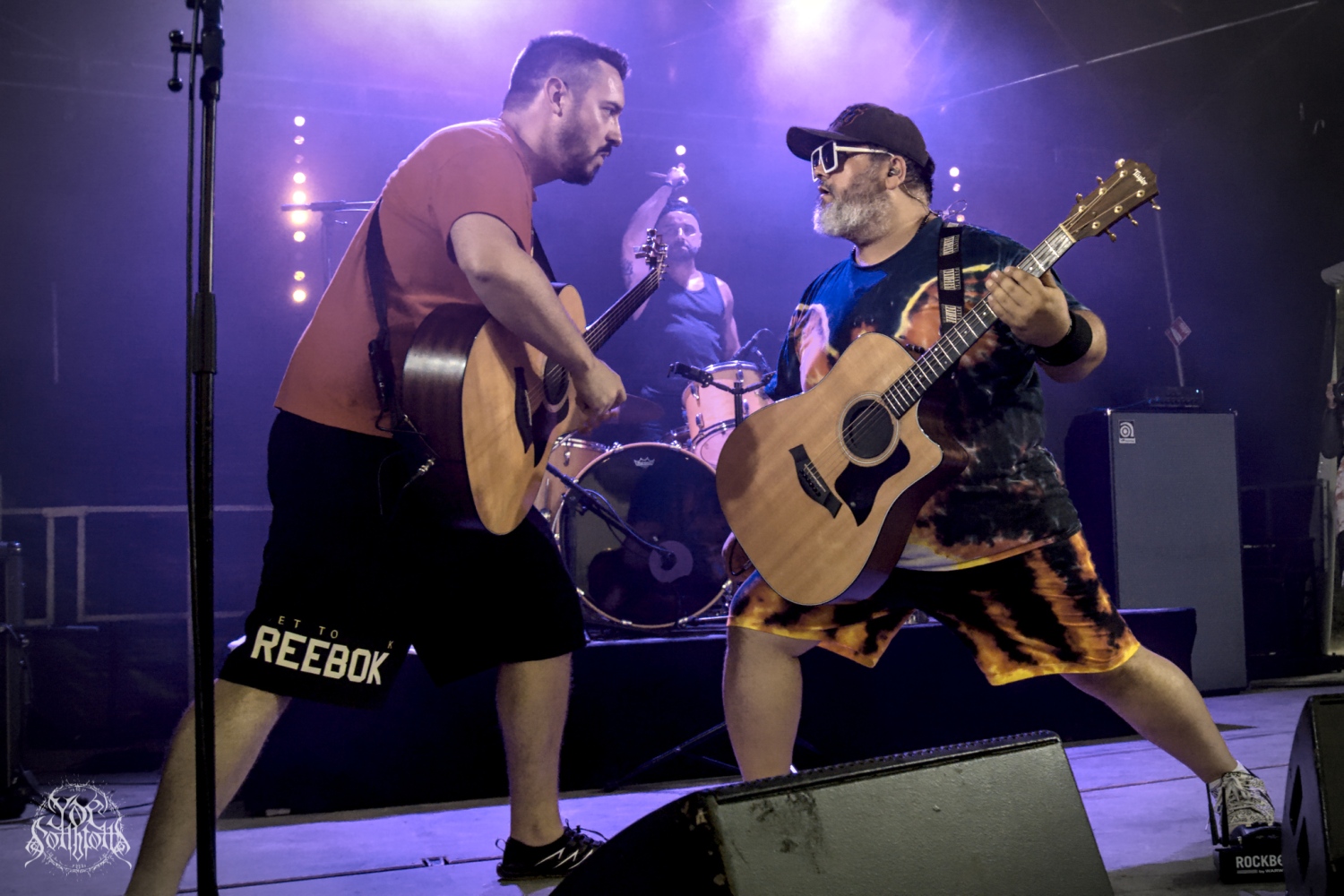 Open Air « Support Your Local Artist Krew » Festival métal emblématique de la région Rhône Alpes affichait encore une fois,Sold Out depuis pratiquement un mois. comme c’est le cas depuis 4 ans. Basé sur les berges de l’Ain sur le stade de la commune de Saint-Maurice de Gourdans , ce festival rassemble environ 10 000 personnes sur les trois jours , il dispose d’une organisation rodée et fluide des plus agréables pour les festivaliers. Vendredi 16h30 ouverture des portes, on file au cashless puis au bar pour se désaltérer avec quelques boissons houblonnées, à peine le temps de finir les verres et de discuter un moment que ça attaque. 17:30 – Perseide En ce début août période d’observation des étoiles filantes , qui de plus approprié que les lyonnais de Perseide pour donner le coup d’envoi cette 12 em édition. Cette bande de potes d’enfance originaires de Saint Laurent de Mure nous offre un show carré, leur Deathcore moderne assez mélodique, parfois même teinté de pop dégage une certaine énergie, le public captivé dès le premier titre ne si trompe pas et commence déjà à bouger ! 18h35 _ Bind Torture Kill Faisant référence au tueur en série américain Dennis Rader ce trio local est composé d’ Olivier au chant, Benjamin aux fûts et Yann à la guitare. Après quelques minutes d’attente juste le temps de remplacer la tête d’ampli défaillante et c’est parti pour un set des plus puissant et ravageur avec des sons alliant grind et hardcore qui nous ravage les neurones. Les festivaliers sont ravis ils se déchaînent joyeusement faisant monter une énorme poussière depuis le pit.C’est le moment choisi pour lancer les premières salves de canon à mousse 19h45: Cuissardes de pêche, épuisette en bandoulière, tête de brochet sur le pied de micro, le décors est planté c’est ainsi accoutré que débarque le trio Francs-Comtois Les Bracos, la contrebasse est également de sortie pour nous servir un punkabilly sauce forestière bien épiucée, le tout dans une ambiance des plus festive et décontractée, un set atypique et entraînant ! 21h00 _ C’est au tour de The Roadies Of The D de s’emparer de la scène. Formé par Carlos Jeldes et Antoine Pelle, ce tribute band Montpelliérain se revendique comme un hommage humoristique au groupe satirique Tenacious D.Ils nous déroulent un set de reprises assez variées, toujours dans la bonne humeur sans tomber dans le cliché, le public semble apprécier et reprend en cœur ! 21h15 _ Princesses Leya Complètement décalé, évoluant dans un multivers peuplé de kangourous vampires ce quatuor alterne entre le concert, le stand up et la comédie musicale une prestation plutôt décérébrante. 23h35 _ Le moment tant attendu par nombres de festivaliers. Loudblast siffle la fin de la recréation , les vieux briscards pionnier du death métal français prennent possession de la scène pour une performance explosive. Leur son puissant et leurs riffs accrocheurs vont faire vibrer le pit. Stéphane Buriez et sa bande nous transmettent une énergie sans commune mesure tout au long de ce dernier set qui clôtura en beauté cette première soirée |