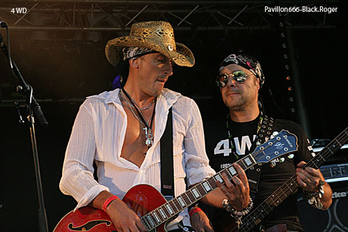A 17h20 tapantes , c'est le groupe FOUR WHEEL DRIVE , plus connu sous le vocable 4WD qui aura l'honneur d'ouvrir "la cérémonie". Portant chapeau ou bandana , ces musiciens originaires de la région lyonnaise pratiquent , sous la houlette de leur chanteur-guitariste Fonz , un hard rock assez classique , typé rock'n blues.Ils interpréteront ce soir une demi-douzaine de chansons pendant une demi-heure seulement ,devant un public encore clairsemé. Leur set est carré, bien conduit, et si on est attentif , on perçoit dans leur musique des accents de AMERICAN DOG et on imagine que les 4WD aiment aussi MOTÖRHEAD. On retiendra leur chanson "Lonely Blues Cowboy". Ceux qui les ont écoutés naguère au Lyon's Hall ou en concert dans la région de Grenoble savent qu'ils ont produit en 2010 un album intitulé "Balls Of Fire",bien accueilli par la critique.Bon vent à 4WD !