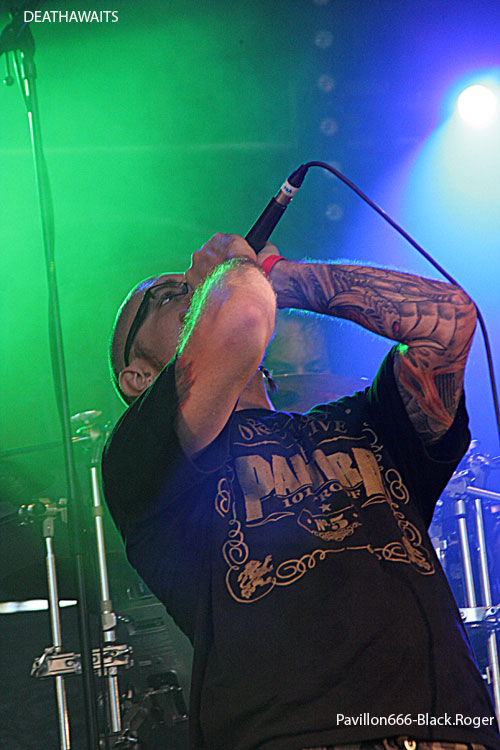 Autres Lyonnais bien connus et appréciés des amateurs de brutal death / thrash , les cinq musiciens de DEATHAWAITS prennent le relais pour 30 minutes également. Florian , leur chanteur au charisme indéniable, est une véritable "bête de scène", doué pour le contact avec le public, sa voix "gruikesque" et le talent des guitaristes , du batteur et du bassiste , les chants gutturaux qui alternent avec des séquences plus "douces" font de DEATHAWAITS une formation qui compte sur la scène lyonnaise.Ils ont sorti un album il y a quelques mois. Le public de plus en plus nombreux réagit comme il convient , d'abord attentif puis déchaîné dans un wall of death impressionnant. Mais l'heure, c'est l'heure, dommage , il faut déjà s'arrêter. Ceux qui les ont découverts ce soir , auront plaisir à les revoir dans leurs prochains concerts. Mention bien. SET LIST de DEATHAWAITS -District Of Isolation -Drunkness -Provocation -Despised The Coldness -Violent Peace -All Confused -Mass Murderer -Look Into The Mirror