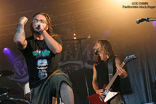 GOD DAMN , pionniers reconnus du stoner, auront droit , eux , à 40 minutes pour faire la démonstration de leur talent et séduire un public curieux ou non averti. Il faut dire que les cinq musiciens de GOD DAMN évoluent désormais dans la cour des grands et se sont fait connaître au-delà des frontières régionales, leur album a ,en général, été bien reçu et a bénéficié d'une bonne promotion. Renato,le chanteur, est un véritable professionnel de la scène , son humour acerbe ne laisse personne indifférent, on bouge beaucoup sur les planches, selon une gestuelle théâtrale bien rodée , les morceaux sont variés , avec de brèves séquences où seuls les instruments interviennent. Enorme succès dans la fosse , leur musique ("southern metal) est en phase avec l'esprit du festival , gentiment "bourrin". Leur set se terminera par un échantillon du prochain album en gestation.Pour les avoir vus à d'autres occasions, je peux sans grand risque d'erreur affirmer que la qualité de leurs prestations est liée au contexte. Ce soir,on a été gâtés , c'était l'une des meilleures.On leur souhaite bonne chance pour leurs prochaines dates , en attendant le nouvel album. Quelques titres de la SET LIST de GOD DAMN -Under Pressure -All In -Never Look -Crazy Train -No Way -Old Days