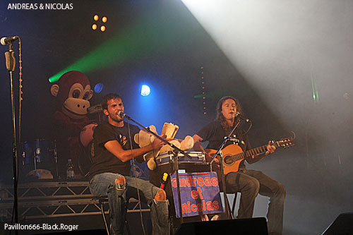 La nuit est tombée , passons maintenant à un registre tout différent. A 20h30, le duo ANDREAS ET NICOLAS (créé en 2006) viendra divertir les festivaliers regroupés en foule compacte entre la scène et la console , et visiblement bien décidés à s'amuser , à rire en écoutant les textes parodiques , grivois , grossiers mais jamais vulgaires - comme disait le regretté Coluche. ANDREAS ET NICOLAS viennent de Nantes , Nicolas est le chanteur-guitariste d'ULTRA VOMIT , Andreas,lui, a officié jadis dans un groupe de metal. Accompagnés d'une musique entraînante , ce duo de choc s'attaque aux travers de la société , se moque de la chanson française , des programmes télé , de la publicité et des médias. On a droit à quelques impros, des chansons courtes ("J'aime pas le sexe"), de vrais petits sketches chantés , le texte se veut humoristique , ponctué de jeux de mots , parfois approximatifs. Le but est de faire rire. C'est chose faite, objectif atteint.Au bout de 40 minutes, on siffle la fin de la récréation.Andreas et Nicolas ne manquent pas de talent et sont chaleureusement applaudis. Cela prouve qu'on peut être adepte de metal pur et dur et apprécier aussi la parodie...,avec modération. Qui a osé dire que les métalleux étaient sectaires ?