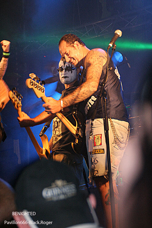 21h45, l'affluence a atteint son niveau maximum. Pourquoi ? Les gens attendent impatiemment et se regroupent devant la scène pour voir enfin à l'oeuvre ceux qu'on appelle affectueusement "les" BENIGHTED. Nos cinq Stéphanois ou ex-Stéphanois , qu'on a pu croiser et saluer dans l'après-midi , sur le site, vont bientôt ,une fois encore, nous montrer de quoi ils sont capables pour remuer les foules. Comme chacun est censé le savoir , ils pratiquent un death brutal , flirtant avec le grindcore , la tendance "grind" s'accentuant avec le temps. Ce soir, heureux de jouer pour cette première édition du Sylak en Rhône-Alpes, ils ont choisi des morceaux issus de leurs différents albums , notamment du dernier en date , "Asylum Cave" (qui traite des pathologies psychiatriques et de la folie), Julien ,le chanteur de BENIGHTED, connaît personnellement le sujet de par sa profession , il s'est intéressé aussi à un fait divers hors du commun qui s'est déroulé en Autriche et dont le groupe s'est inspiré. Mais Icon et Identisick n'ont pas été oubliés.Rappelez-vous "Collapse". Tous leurs fans sont là, on ne peut pas imaginer ce qui se passe dans la fosse et au-delà , il faut le voir pour le croire , circle-pits , walls of death , pogos , slams...Le chanteur aux pieds nus ne se prive pas d'encourager jeunes et moins jeunes à aller encore plus loin , plus fort , plus brutal...Inoubliable , une vraie jouissance , physique et mentale. Kévin (Kikou),batteur hors pair, Eric (Candy) le bassiste slameur , les guitaristes Liem (Litchi) et Olivier (Gab) et Julien ,l'âme du groupe - sa modestie dût-elle en souffrir - tous les cinq inspirent une sorte de respect mêlé d'admiration. Ultra efficaces, sérieux sans se prendre au sérieux,ils sont dotés d'une personnalité à part dans le paysage du metal extrême français. On peut même dire que chacun dans son rôle est une référence pour plus d'un jeune batteur , guitariste, bassiste, chanteur. Les BENIGHTED ont des amis en France , parmi les métalleux lyonnais, par exemple les musiciens de GOD DAMN , grimés , qui les rejoignent sur scène , mais aussi en Europe (Allemagne,Scandinavie) , où ils ont acquis une vraie notoriété. A Saint-Maurice-de-Gourdans , ce ne fut qu'une partie de plaisir.