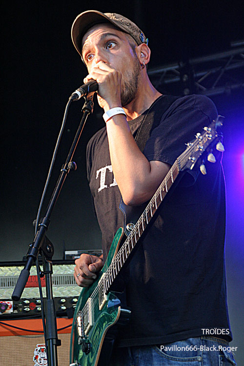 Prévu pour 16h35 , c'est le quatuor originaire de Tarare ,TROIDES PRIAMUS HECUBA (TPH), bien connu dans la région où il donne de nombreux concerts , qui s'apprête à animer le festival. Fondé en 1994,mais avec un line-up renouvelé,les gars de TPH pratiquent un rock fusion énervé , sautant ,bondissant sur scène , les deux chanteurs , Tom et Migl , à la voix si différente , sont très complémentaires. Les chansons en français qu'ils interprètent avec brio s'appuient sur des textes travaillés , bien ciselés, dans lesquels ils expriment leur engagement , notamment sur les questions socio-politiques (exemple: "Fuck le Pôle Emploi").Le rythme est rapide , sans temps mort, avec des passages proches du punk rock , du hardcore ou du rap.La musique et les mots stimulent un public relativement jeune , acquis à la cause de TPH , qui ne demande qu'à bouger dans la fosse. Ceux qui n'aiment pas ,car il y en a , ne sont pas venus ou se sont éloignés. Les musiciens de TROIDES ,engagés et enragés, ont un talent incontestable et la chance de former une équipe soudée , bien coordonnée. Ils ne sont pas les seuls à faire de leur art un vecteur de leurs opinions.Chacun pense ce qu'il veut , évidemment et heureusement. Le groupe TPH présente quelques similitudes avec LA PHAZE ou TAGADA JONES , à la fois festifs et énergiques. TROIDES s'affirme surtout en live , mais a aussi quelques CDs à son actif , dont le plus récent sorti en 2009. Leur prestation de ce soir ( 40 mn ) était d'une bonne tenue.Le public ne s'y est pas trompé.