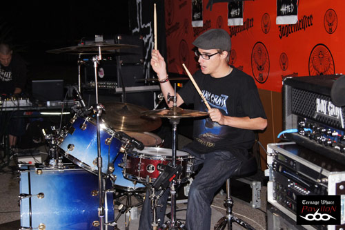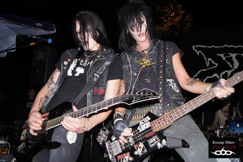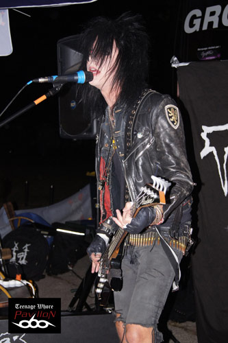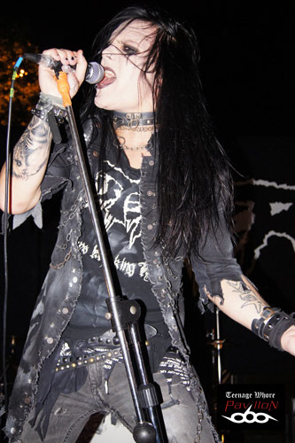Et on fini par un groupe Suédois, les Sister. Maquillages noir, coupes de cheveux excentriques, teint pale et look vestimentaire à la Murderdolls avec comme leader le sosie total de Joey Jordison, ce groupe promet d’être grandiose « fémininement » parlant !! Dès le premier accord, le groupe met le feu et hurle un rock n’ roll puissant dans toute la Foire. Malgré le degré d’alcool pour certains et la fatigue pour d’autres, le public restent présents et dynamique. Sister nous amène sur un plateau un punk dévastateur entre riffs foudroyants et voix stridentes à la Wednesday 13. Décidément, ce soir la qualité des groupes est très bonne et on se régale ! Les Suédois nous feront le plaisir de nous interpréter des titres phares de leur répertoire comme Too Bad for you, Hated, ou Crash Boom Bang. Des vrais Rockstars perdus en plein St Etienne !! Efficace et dynamique, leur show est époustouflant. Autant les riffs que les solos du guitariste sont maitrisés à la perfection. Le batteur est infatigable et Jamie à la voix est tout simplement épatant. Le groupe essaye d’être le plus possible proche de son public, Jamie n’hésite pas à tendre son micro afin de laisser le public chanter en cœur. Malheureusement, le show a du se finir plus tôt que prévu, la Foire se fermant à 10h , l’orga exigea que le groupe s’arrête de jouer vers les 11h. Sister devaient encore jouer 6 morceaux mais impossible de continuer … . Petite fausse note de la soirée mais qu’on oubliera vite vu la qualité de la prestation de ce groupe Suédois.