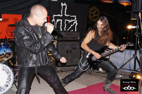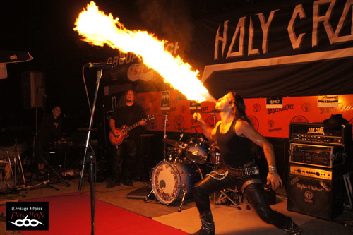Et c’est maintenant au tour d’HolyCross de mettre le feu (dans tous les sens du terme !). Les Stéphanois nous font la surprise de n’être actuellement plus que 4. En effet, appel à la population, HolyCross recherche activement un bassiste ! Dans tous les cas, HolyCross se débrouille plutôt pas mal sans. La bonne humeur est toujours aussi présente et c’est toujours un plaisir de les voir en concert ! Ce soir, les Stéphanois nous font même un petit cadeau en nous interprétant deux covers d’AC/DC. Même si je les est vu plusieurs fois maintenant, je suis toujours aussi impressionner par la qualité de voix du chanteur Mickey qui ce soir dégage une énergie époustouflante. HolyCross va donc nous interpréter des titres incontournables de leur répertoire comme Kings In Hell ou Lightning From The North. De plus les fans sont présents et la bonne ambiance est bien présente. Certaines personnes prennent même le temps de s’arrêter pour apprécier la musique avant de partir de la Foire. Seul petit bémol, le son était beaucoup trop fort ! Les HolyCross, vous me devez à présent deux oreilles !!! Cependant on les pardonnera avec Adrien qui nous fera même son spectacle de feu habituel, toujours aussi impressionnant ! Le feu n’a pas touché mon objectif, spectacle donc réussi !! Pareil que pour RAKEL TRAXX, on aurait aimé que le concert dure plus longtemps.