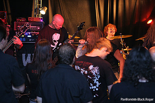 Reveil brutal en cette fin de soirée avec les Lyonnais de CARNAGE OF CHILDREN qui après avoir ravage la semaine dernière, eux aussi, le Warmaudio de Lyon, comptent bien en découdre avec le public local (absent !). Qu’à cela ne tienne, leur métal de la mort qui tue va casser l’Assommoir avec des compositions issues de leur premier opus « Ways Of Darkness » mais pas seulement. Ce soir le frontman assure seul les vocaux enragés, ses acolytes guitaristes étant provisoirement sans oix. C’est du lourd qui nous tombe dessus, du death costaud, un brin technique, bien malsain, bien virulent, bref saignant et puissant comme on l’aime il n’y a pas photo. Pour terminer le set, leur fameux titre « Destroy » nous ravage ce qui nous reste de neurones, mais c’est toujours aussi jouissif en diable. Le show fut donc carré, précis, percutant avec le duo basse-batterie hors norme, les miaulements incisifs des six codes et les growls écorchés du chanteur, que du bon. Rappel demandé, rappel accordé qui termine en beauté à minuit trente la soirée Stéphanoise.