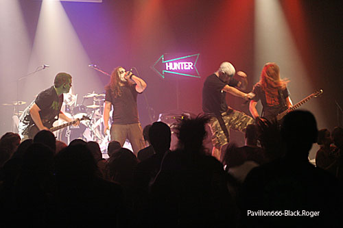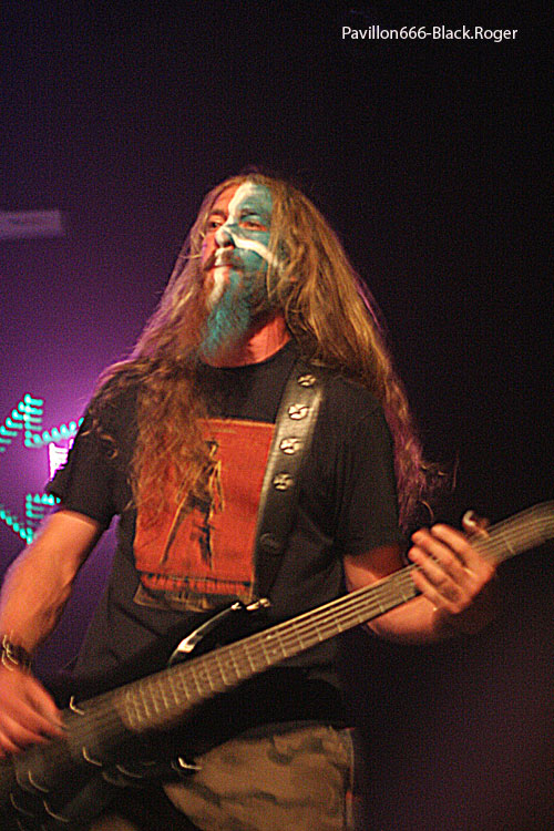 On change complètement de registre, tympans fragiles, s'abstenir ! C'est BOUNTY HUNTER qui va déverser sur le public, toujours aussi déchaîné quand "les BH" montent sur scène, non seulement des tonnes de décibels, mais un stock de rouleaux de papier fabriqué à base de cellulose...Pauvres arbres ! Y a-t-il des écolos dans la salle ? Le décor est planté, le nom du groupe de "brutal death / grind" apparaît en lettres lumineuses de part et d'autre en arrière plan, les visages de nos cinq loustics ( lustig = joyeux , en allemand) sont recouverts de maquillages blancs, noirs etc. Tempête sur scène, tsunami dans la fosse ! Florian et Mike ne lésinent pas sur les moyens, leurs cordes vocales sont mises à rude épreuve, growl, gruik, c'est la guerre à la MJC de Rillieux...Il y en a pour les yeux et pour les oreilles, spectacle brutal, martial, mais pas violent du tout, sauf les instruments qui hurlent de douleur sous la torture. L'apothéose est atteinte quand Laeti rejoint Flo sur scène, se saisit du micro et se livre à une petite démonstration vocale à l'occasion de son anniversaire ...Pogos, slams, cela devient une banalité. Mais redevenons sérieux, car les gars de BOUNTY savent eux aussi l'être quand il le faut. N'oubliez pas leur album sorti il y a déjà quelques mois et qui s'appelle S.Y.L.A.K. Bizarre, non ?