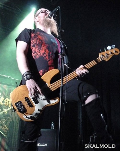 Le planning s'annonce chargé, avec six groupes à l'affiche et Skalmold est la première formation à s'illustrer et mieux encore, à s'illustrer de fort belle manière. Si la renommée des groupes islandais a quelques peu de mal à dépasser leurs frontières, autant dire que Skalmold aura vite fait d'attirer l'attention sur la scène de ce charmant pays. Le groupe affiche le sourire et une maitrise de la scène évidente. Bien en place, soudés, les musiciens produisent un viking metal efficace et rythmé. La technique est indiscutable, les compositions variées révèlent des jeux de chants bien pensés (Valhöll) et des solos bien sentis. Une fois n'est pas coutume, le premier groupe bénéficie d'un éclairage décent, ce qui ne sera malheureusement pour le reste de la soirée, plus souvent baignée par la pénombre. Loin des visuels traditionnels des peaux de bête et des maquillages guerriers, Skalmold opte pour la simplicité scénique. La musique parle d'elle même, dommage que le public reste encore un peu sage malgré un show tonique, plus puissant que « festif » mais néanmoins idéal pour commencer à se dégourdir la nuque. Ceux ne connaissant pas le groupe ne manqueront pas de prêter oreille attentive à leur excellent album « Bladur », en résumé une très bonne découverte pour démarrer la soirée.