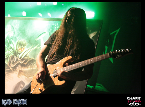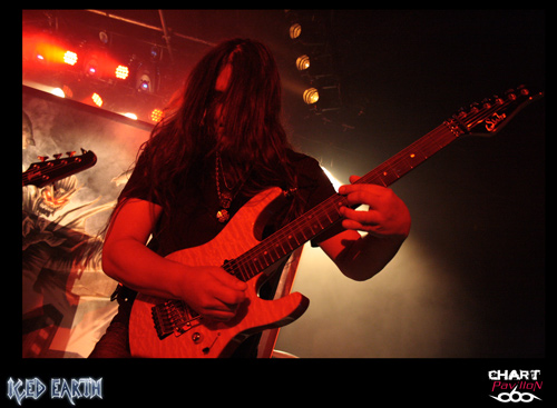 Il convient aussi de dire un mot sur le son du groupe. Comme vous l’avez sans doute remarqué, ICED EARTH est sur album un groupe que l’on apprécie aussi pour la qualité de ces enregistrements. Le résultat est le plus souvent réellement puissant et tranchant, à la limite entre le thrash et le heavy. C’est aussi ce qui fait qu’ICED EARTH n’est pas un groupe de heavy comme les autres et c’est aussi sans doute pourquoi il a su se faire remarquer. En concert, rien ne bouge, le son est aussi impeccable que sur album. A cela s’ajoute les qualités des rythmiques tranchantes et des solos techniques impeccablement exécutés. Si vous êtes musiciens et que vous faites du metal, vous ne pouvez qu’être subjugué par ce duo de guitaristes fonctionnant à merveille ensembles. Le tout est renforcé par une basse claquante très présente et un son de batterie certes assez peu naturel mais très bien travaillé. ICED EARTH en concert, c’est aussi ça et il ne faudrait pas passer à côté car c’est un élément essentiel pour l’identité du groupe.