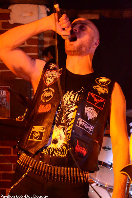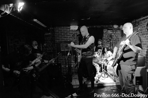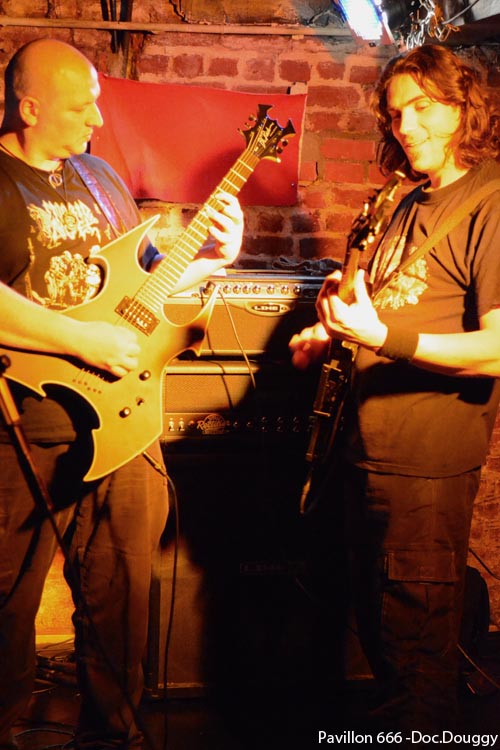 Après un quart d'heure de retard sur le planning prévu GOAT PERVERSOR démarre tout de même son show, devant un public d'une dizaine de personnes... Les Bruxellois paraissent plus en forme que le mois dernier à l'image de leur guitariste soliste qui fera de sa prestation, une prestation de haute volée. La place étant de mise, il se permet avec son bassiste d'ailleurs de jouer pratiquement dos au public, à notre grand dam, mais s'amuse à traverser la scène pour retrouver son autre guitariste qui comme à son habitude, reste des plus stoïque sur scène. GOAT PERVERSOR nous sert alors la même setlist qu'à Valenciennes. La présence d'un seul spot de couleur jaune ainsi que le son qui est très fort n'aide pas à apprécier et à reconnaître leur titre, par contre force est de constater le travail effectué par leur chanteur, en forme, et par le batteur qui enchaîne à merveille un jeu des plus complets. Le clou du spectacle sont les deux derniers morceaux joués par le combo de "Black/Thrash", car la sangle de notre fameux guitariste soliste le lâche. La consommation d'alcool aidant, il est souriant et n'hésites pas à jeter sa guitare par terre, oubliant leur reprise d' UNLEASHED "Death metal Victory", qu'il revient nous jouer assis, et même malgré son état avancé, nous ponctue d'un bon solo. Etat avancé qui ne plaît apparemment pas à tous les membres du groupe, mais bon au moins GOAT PERVERSOR a donné le sourire à plusieurs d'entre nous, même si je crois que c'était pas leur but. Un concert qui fini limite "punk" des fois ça n'a pas de prix ! Mais qu'ils ne le prennent pas mal, c'est avec grand plaisir que je reviendrai voir une de leurs prestations, qui se verra plus pro et dans de meilleures conditions !