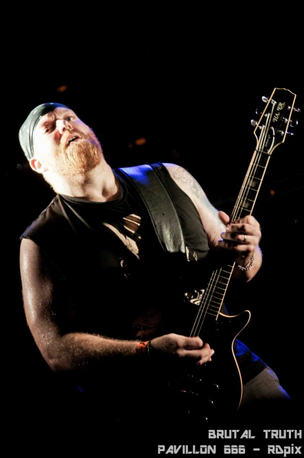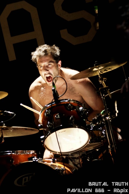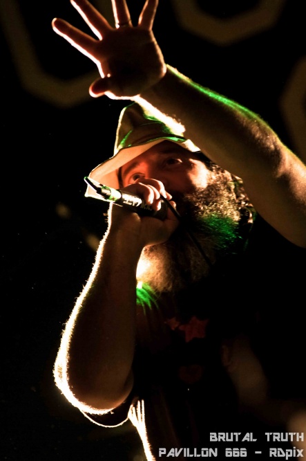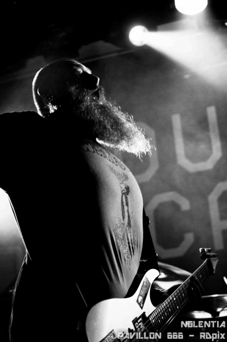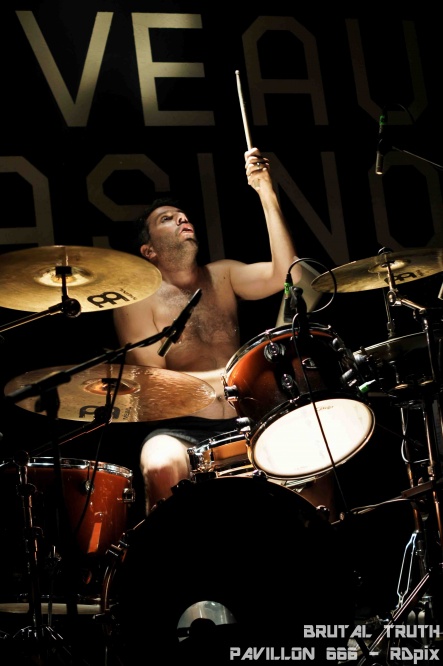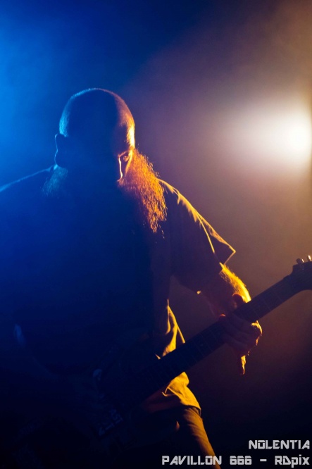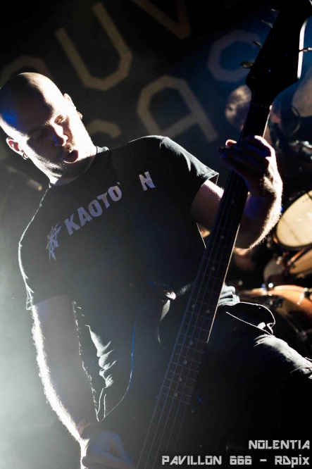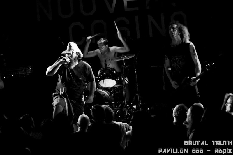 <p> </p> <p>NOLENTIA :</p> <p>Le groupe Toulousain est arrivé de nulle part et a commencé son set sans aucune forme de cérémonie. Premier constat : le son est bon. Un léger problème de basse trop faible mais qui a vite été corrigé. Dans l’ensemble, le groupe n’est pas mauvais du tout.</p> <p>C’est un peu dommage que certains riffs qui partaient pourtant si bien soient coupés aussi vite : grindcore rules. Autre tradition pour tous bons grindeux qui se respectent, les paroles incompréhensibles et qui donnaient presque tout le long du set un truc du genre « yoyoyoyoyoyoh yayayayayayayah ». Mais ce n’est pas là une critique, on était là pour voir du grindcore et on a été servi.</p> <p>NOLENTIA se défend plutôt bien avec une batterie très nerveuse, un bassiste/chanteur qui assure bien même s’il était un peu immobile, et un guitariste imposant avec une belle barbe qui va de paire avec son physique et sa grosse voix. J’ai trouvé le groupe efficace même s’il manquait d’originalité, chose difficile à obtenir dans ce style de métal.</p> <p>Le public n’est pas encore au complet, mais plusieurs dizaines de personnes déjà présentes semblent apprécier la prestation.</p> <p> </p> <p>En cherchant à prendre de la hauteur pour varier les prises de vue, je me retrouve sur la terrasse derrière les ingénieurs son et lumières. Et là, surprise, je tombe sur Kevin Sharp, le chanteur de Brutal Truth, assis dans un coin tout seul. Il s’occupait lui-même du stand merchandising de son groupe. Je saisis l’occasion pour aller le saluer et échanger quelques mots. Quand je lui demande pourquoi il fait tout ses concerts pieds nus (question qui me taraudait depuis la première fois que j’ai vu le groupe au hellfest 2009). Il me répond que c’est pour mieux ressentir les vibrations dans le sol pendant le concert. Puis il s’empresse de me demander en se marrant « pourquoi t’es complètement trempé, t’es plombier ? ». Je lui explique que j’ai pris l’orage sur la tronche en arrivant et que je suis trempé jusqu’au slip. Il s’empresse de prendre un T-shirt sur une pile près de lui et me le tend en me disant « je n’ai pas de slip à te proposer mais prends ça, c’est cadeau ». Me voilà avec un T-shirt Brutal Truth tout neuf et tout sec. Le bonheur. Avant de le laisser je lui demande comment se fait-il qu’il vende ses T-shirt à 10€ alors qu’on les trouve partout à 25€ minimum. Il m’a simplement répondu « No need to be greedy » (pas la peine d’être cupide).</p> <p> </p> <p>Suite à cet échange fort sympathique, je retourne voir la fin du set de NOLENTIA. La salle s’est déjà bien remplie et certains commencent même à pogoter timidement sur les derniers riffs.</p> <p> </p> <p> </p> <p>Puis direction le bar pour boire une pinte le temps que le second groupe se prépare.</p> <p> </p> <p>DEPARTMENT OF CORRECTION</p> <p> </p> <p>Place à DEPARTMENT OF CORRECTION, groupe de grindcore parisien. Á première vue, pas de bassiste. Les quelques groupes de grind qui jouaient sans basse et que j’ai pu voir, comme Pig Destroyer par exemple, m’ont fortement déçu. Qu’en sera-t-il de ce groupe ?</p> <p>Et bien, c’était une claque. Je disais, un peu plus haut, qu’il était rare de voir des groupes sortir du lot dans le style grindcore. DEPARTMENT OF CORRECTION tire son épingle du jeu de plusieurs façons. Outre l’absence de bassiste, l’ autre originalité du groupe est que le chanteur utilise deux micros à la fois. Ceux-ci sont très certainement branchés sur des distos différentes. Ceci permet au chanteur de passer de l’un à l’autre pour changer d’effet ou bien de les utiliser en même temps pour un son bien trash. Le concept fonctionne très bien et même si on a parfois l’impression qu’il chante dans sa glace vanille deux boules (bien que cette image ne soit pas la première qui me soit venue à l’esprit), on en oublie vite la drôlerie de la chose et on se concentre sur le groupe dans son ensemble.</p> <p>La seconde chose qu’on oublie très vite c’est le manque de basse qui, finalement, ne manque pas tant que ça. En effet, le guitariste à lui tout seul sait amener des riffs bien construits et qui se suffisent à eux-mêmes. Technique et très propre, il s’accorde parfaitement bien avec la batterie pour former un son très dynamique. Une dizaine de pogoteurs ont tenu tout le set en se bousculant joyeusement sur les rythmes entrainants du trio déchainé. </p> <p>J’en aurais presque posé mon appareil photo dans un coin pour aller me battre avec tout le monde tant l’énergie que dégageait le groupe était prenante.</p> <p>DEPARTMENT OF CORRECTION nous a gratifié d’une prestation très appréciable et pêchue. Je recommande fortement à tous les fans de grindcore. </p> <p> </p> <p> </p> <p>BRUTAL TRUTH</p> <p> </p> <p>Encore une bière pendant que nos amis d’Outre-Atlantique préparent leur matos. Et c’est parti. Après des balances qui ont un peu trainé en longueur, les musiciens semblaient satisfaits du retour de son et ont entamé les festivités. BRUTAL TRUTH a enchainé les 5 ou 6 premières chansons sans interruption tant et si bien qu’il n’était pas toujours évident de savoir quand un titre prenait fin et quand un autre commençait. Il a bien fallu attendre 15 minutes avant de voir le groupe faire une pause de 30 secondes pour parler au public avant d’attaquer à nouveau.</p> <p>Le line-up n’a presque pas changé depuis la dernière fois que je les ai vu, il y a un an, au précédent Hellfest. Richard Hoak encore à la batterie. Il est toujours aussi impressionnant, aussi bien de par sa technicité que par ses traits du visage tendus, qui lui font faire les pires des grimaces durant ses roulements. Dan Lilker à la basse, l’ex-Anthrax (entre autres) reste assez immobile mais joue ses lignes de basse à la perfection. Le guitariste, quant à lui, est un nouveau