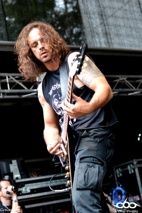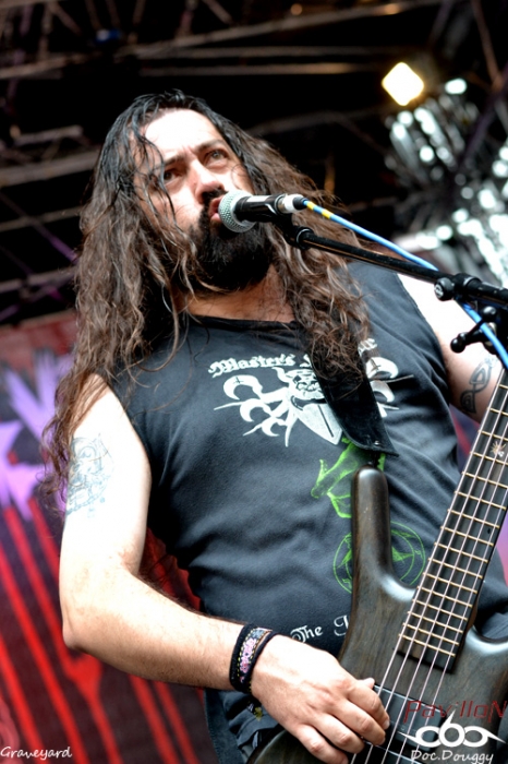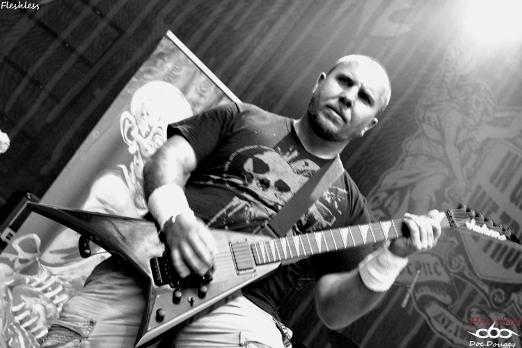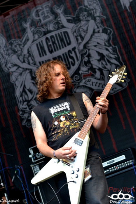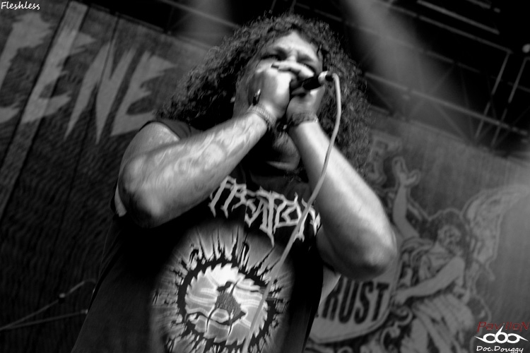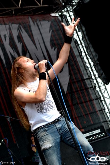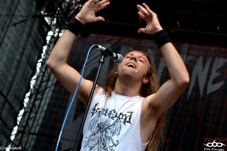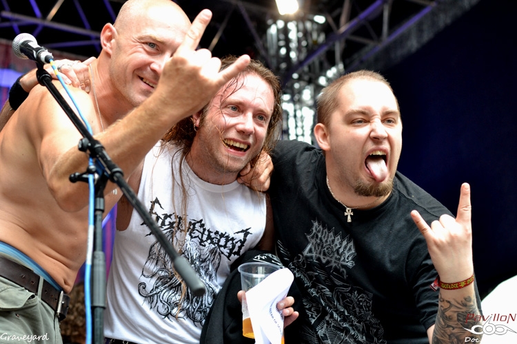 En regardant le programme, j'ai quelque peu de mal à imaginer des changements de plateaux en 10 minutes, si ce n'est qu'en fait la base de la batterie reste la même pour tout le monde, ce qui rend les changements beaucoup plus rapides. Premier groupe ce jeudi donc, c'est les locaux de SMASHING DUMPLINGS qui ouvrent le bal. Comme beaucoup de groupes présents ce week end, la prestation des Tchèques (qui comprennent un ex-FLESHLESS dans leurs rangs) se veut grindcore et sans concessions enchaînant blasts et vocalises guturrales comme le portent le nom de leur seul et unique E.P "Gastrogrind". Sans fioritures, le groupe passe allègrement et en fait déjà danser quelques-uns (on est alors pas nombreux sur le site). Et rien qu'à l'écoute de ce premier groupe, disons ironiquement qu'on est pas sortis de l'auberge niveau brutalité ! J'en profite pour confirmer que le plus souvent les prestations dépassent rarement 30 minutes, car dans ces styles il est bien difficile de faire plus sans lasser pour certains... On enchaîne avec les italiens d'APE UNIT (inconnus au bataillon pour ma part, enfin... plus pour longtemps me diriez-vous !) on lorgne plus vers le Powerviolence, mais je trouve la prestation un peu brouillonne... Heureusement, le site ne manque pas de place pour s'installer et apprécier de près sur les bancs ou de loin en hauteur les groupes... Une heure de passée ainsi que 2 groupes, ça va vite ! Et ça enchaîne avec des Tchèques encore : MÖRKHIMMEL. Là, on est plus dans un Death/Crust old school ne serait-ce que par des vocalises plus arrachées, l'omniprésence du D-beat et du son suédois. Mais à côté de ça, une excellente découverte ! Et enfin un groupe que je connais un peu plus avec les Espagnols de GRAVEYARD. Leur dernier album en date "The Sea Grave" (chroniqué dans nos pages) avait fait mouche chez moi, et c'est donc avec un certain plaisir que je retrouve le groupe pour une prestation scènique qui m'aura bien plu ! Du Death old school "made in Stockholm", il en faut peu pour m'arracher les premiers headbangings de la journée. Et d'ailleurs, le public se fait déjà un peu plus présent, que ce soit sur les bancs de l'amphi ou dans le pit. Et cette fois, on passe de 20 minutes à 25 minutes de set. La suite avec PERFECITIZEN, un trio tchèque encore (ce pays est foutrement productif, en ce qui concerne la musique extrême !) qui ne sont en fait que des ex-ALIENATION MENTAL. Entres parties plus axées Death technique et parties Grindcore, le trio m'étonne et me fait passer un bon moment. S'ensuit 30 minutes plus tard d'ANTIGAMA, groupe polonais que j'ai eu l'occasion de découvrir suite à un split avec Psychofagist. Dans leur genre, le Death metal syncopé des Polonais rappelle par moments Meshuggah, un poil plus dissonant encore, somme toute impressionnant sur scène... Enchaînement avec les allemands de CHAPEL OF DISEASE et leur Death metal old school. Vocalises déchirées, base rythmique typée "Death" des fin 80's et quelques riffs qui vous font facilement hocher la tête. Une bonne découverte, pour un groupe que ma foi j'irai réécouter quand je serai rentré ! Et on reste dans le Death metal avec les Suédois d'USURPRESS, pas de surprises à l'horizon, un mélange Death/Crust de bonne augure. Ce qui devrait faire parler d'eux est plutôt le split en préparation avec Bent Sea... 18h30, les bières commencent à taper mais sur la scène, ça continue encore avec la présence des premiers groupes à "grosse" réputation. Et là c'est FUCK THE FACTS, le combo Canadien mené de fer par sa petite mais impressionnante chanteuse Mélanie. Y'a pas à dire, le combo envoie sévère avec leur Grindcore si ce n'est quand même qu'il faut apprécier les vocalises de la chanteuse, ce qui n'est pas du goût de tout le monde et pour ma part, le groupe me laisse à chaque fois que je les vois un sentiment amer, sûrement dû aux vocalises justement... Puis j'avoue que je suis surtout pressé de voir le combo tchèque (encore..) FLESHLESS débarquer ! Leur death gore fait mouche d'autant que pour l'occasion, ils ne jouent que des morceaux issus de la période où ils étaient signés sur le label de l'organisateur "Obscene Productions". Et une excellente prestation soit dit en passant ! Arrive enfin ce qui va être l'une des claques de la journée, voire du festival pour certains, AHUMADO GRANUJO ! Je ne suis pas grand connaisseur du Cyber Gore/Grind des Tchèques, mais rien qu'au début du set, l'ambiance omniprésente du public qui commence à enchaîner les stage diving, circle pit et autres commodités du genre, c'est bien parti ! 30 minutes qui passent trop rapidement entre parties "Techno" somme toutes dansantes et Grindcore ravageur; une sacrée découverte pour un groupe à l'ambiance "Grindin' Friendly" d'ailleurs la scène finira remplie par le public... Y'a pas à dire, amateurs du genre, ne passez pas à côté de ce groupe ! L'ambiance va d'ailleurs un peu retomber sur le set des Anglais de DESECRATION... Du Death metal brutal pour un groupe qui connaît bien le festival (3eme venue il me semble). Mais pour ma part, pas convaincu et pas très amateur du genre... Mais cette ambiance va remonter lorsque l'on regarde le programme et qu'on y voit marqué MALIGNANT TUMOUR. Après les avoir manqué cette année au Neurotic Deathfest, c'est l'occasion de me rattraper sur le "Rock'n Roll" pustulant des Tchèques (toujours !) et franchement, une bonne pointe d'humour sur fond de grosses guitares grasses et mélodiques qui fait bouger les popotins. Avec en prime un dernier album à promouvoir, MALIGNANT TUMOUR signe une très bonne prestation, qui me fera réfléchir à deux fois si ils passent en même temps qu'un autre groupe sur un prochain festival. Je reste sur quelques morceaux de NEGATIVE APPROACH car plus que le Punk/Crust/Hardcore des Américains, c'est surtout la faim qui me tenaille... Mais des stands de nourriture, le son est bon, c'est old sc