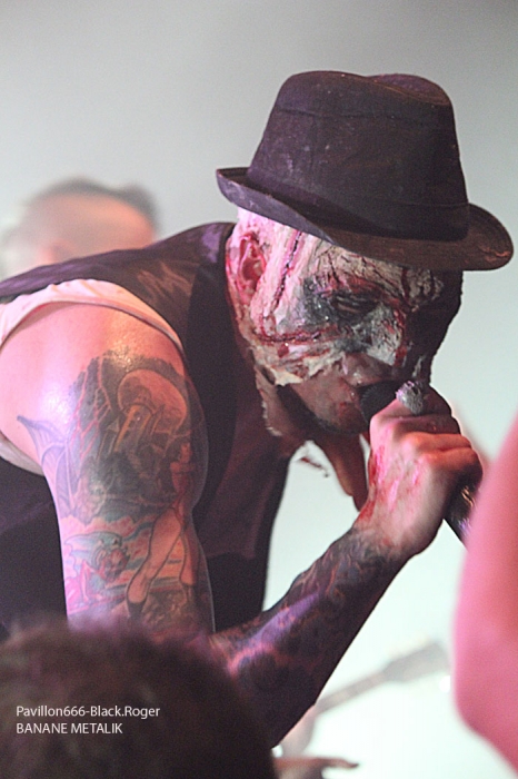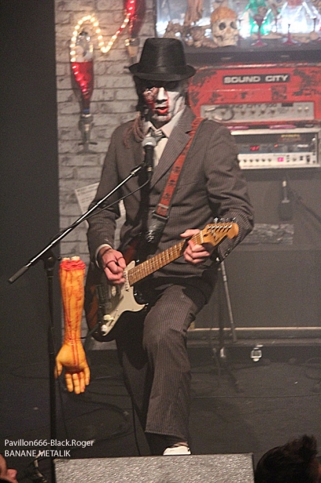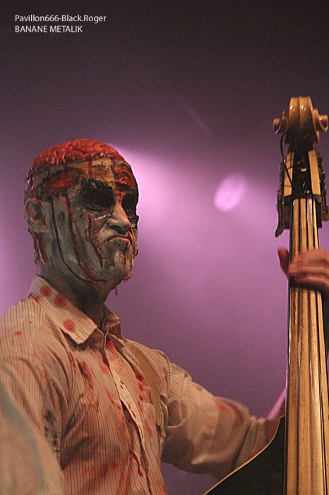 BANANE METALIK avec sa thématique horrifique et son rock « zombiesque » déjanté rassemble tous les rockers, les punks et les métalleux de tous poils, alors pourquoi ? Réponse immédiate là devant nous ce soir avec en intro un sample mafieux qui introduit nos musiciens grimés parrains d’un rock n’roll particulier, place aux « morts-vivants ». Et la banane s’enflamme, le public aussi, qui s’envoie en l’air dans des jets de boissons houblonnées cela va de soi. Le combo gorgé de non-conformisme artistique et autres, provoque, dérange, aime pousser son public dans ses derniers retranchements, et il le fait bien. Son univers plait visiblement, sa musique aussi et ses textes en Français SVP vous interpellent forcément. La salle est en émoi, l’assistance se nourrit de cette scène sanglante la buvant jusqu’à la lie. On aimerait que ça dure encore et encore tant cette ambiance décalée nous convient. Mais à 23 heures trente pile, le CCO coupe le son sur scène en plein milieu d’un titre. Que se passe –t-il, le public s’interroge et reste la planté a réclamer son « dû ».