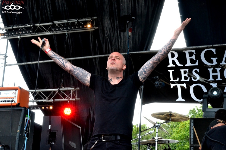 Et la journée commence avec un groupe dont on entend beaucoup parler dernièrement : REGARDE LES HOMMES TOMBER. Certains diront que ce combo/projet du chanteur d'Otargos, Ulrich, fait dans la facilité et utilise la renommée de son chanteur pour un peu plus de 2 ans après sa formation, se retrouver à faire des apparitions notamment au Hellfest, d'autres comme moi vous diront qu'ils jouent la proximité tout simplement (le groupe est Nantais), que leurs musiciens possèdent un certain feeling dans leur composition avec un premier album éponyme de grande qualité, mais aussi qu'ils récoltent ce qu'ils sèment : un bon album, beaucoup de disponibilité pour être sur les routes de France (et d'ailleurs), et un certain sens du marketing qui fait que beaucoup dans la sphère Metal ont entendu parler d'eux. Mais reste à voir ce que donne le contenu "Live". Je ne peux que constater que les instruments sont tous globalement bien dosés lors d'une "introduction" mettant en place le quintette avant l'arrivée d'Ulrich qui sonne le glas de son chant écorché. Lâchant la guitare pour se concentrer sur le micro, le Nantais sait haranguer son public et assure plutôt bien tout en restant dans la sobriété comme le reste du groupe. 45 minutes de set sont suffisantes pour présenter leur album au public, un son massif, lancinant avec sa touche "dark". Bref, une journée qui commence bien !