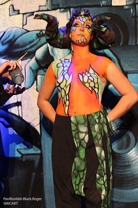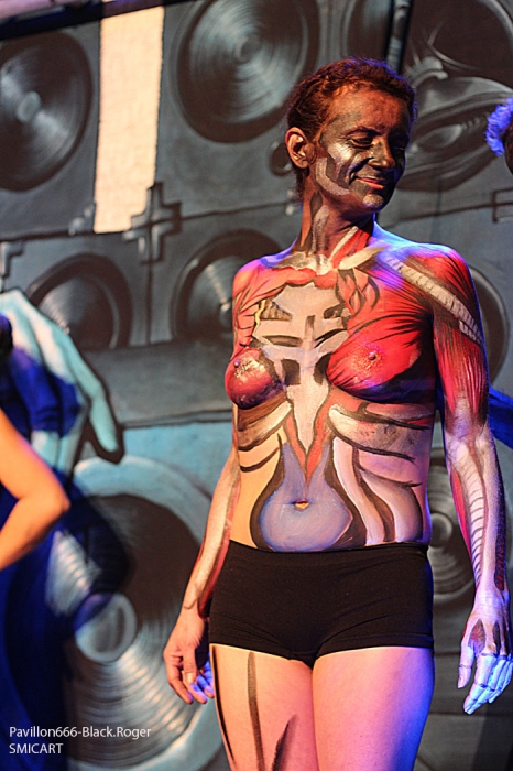 Une fois entrés dans la salle de concert, nous sommes interpellés par la performance, au pied des gradins, de body painting réalisée par SMICARTS, et donc l’attente du premier son sur scène ne paraitra pas bien longue évidemment le spectacle étant tout autre pour l’instant comprenant la superbe « déco » de la salle par cette équipe, « un must » vous dis-je.