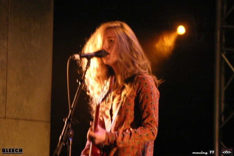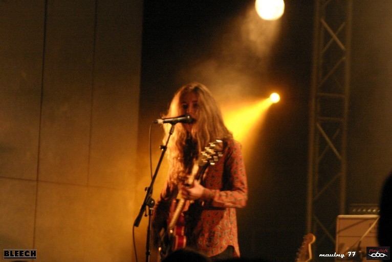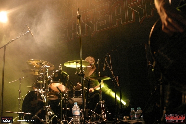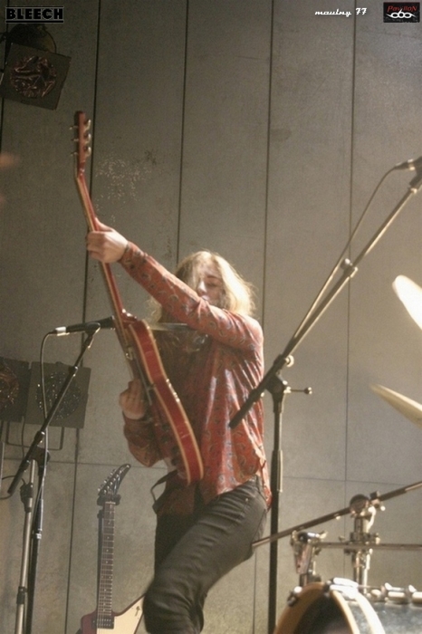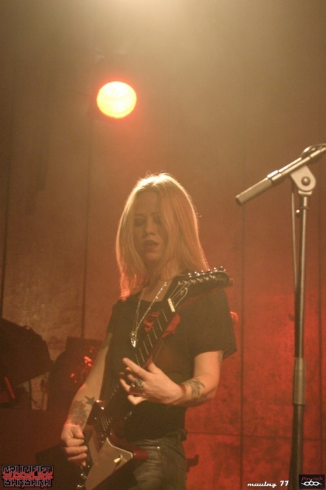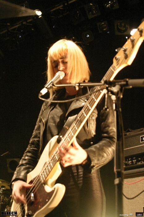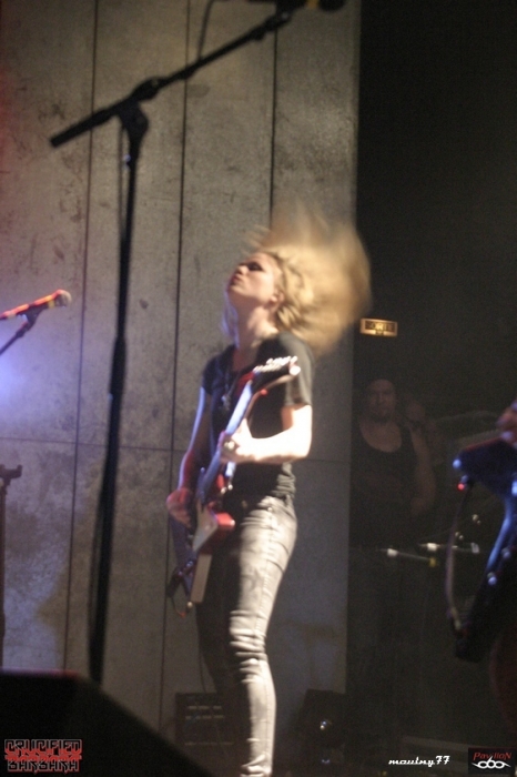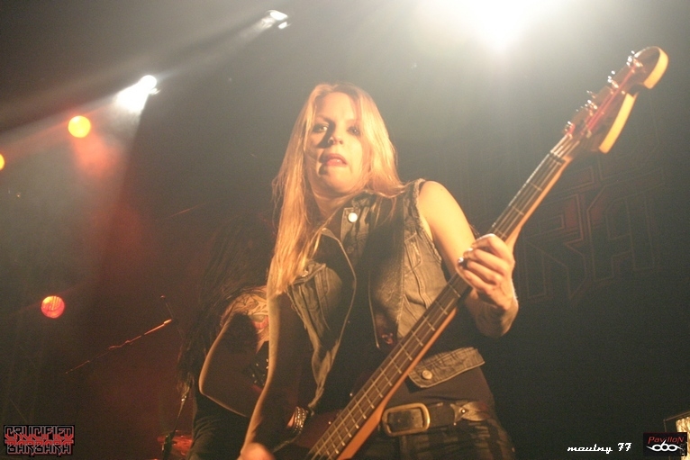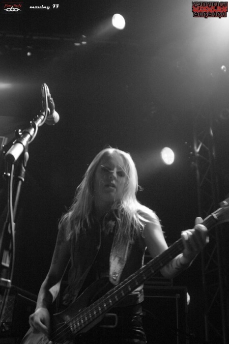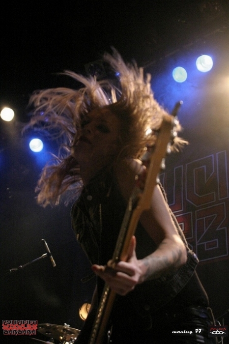 Pour ceux qui ne connaissent pas le trio anglais, celui-ci est composé de Jennifer O'Neill (guitare, chant), de Katherine O'Neill (basse, choeurs) et de Matt Bick (batterie, choeurs). Le groupe a vu la jour en 2009 et évolue dans un registre rock alternatif. Un premier album "Nude" est sorti en 2012, le second opus "Humble Sky" est prévu pour 2014. Bien que Bleech soit loin musicalement de Crucified Barbara, le groupe s'en sort honnêtement pour un support-band. Les onze titres sont exécutés sans failles, Matt se démène comme un diable et martèle ses fûts sans mollir. Katherine se promène sur son manche et a bien du mal à rester en place. Sa soeur, bien que concentrée sur sa double activité, n'hésite pas à s'agiter. Certains gimmicks restent connus mais leur présentation est digeste limitant ainsi le coté cliché. Le public venu pour la tête d'affiche est respectueux à l'égard de la formation, certains iront même jusqu'à scander des "BLEECH...BLEECH...BLEECH". LE seul reproche à faire au groupe est au niveau du son, où la basse est surexposée, celui-ci devient par moment saturé dans les graves. Setlist : Dancing Without You - Here I Am - Sparks - Taking Over - Break My Noise - Love Is Free - L.U.T.W. - Worthing - Easy Ride - I Just Want You - Mondays Après un chassé-croisé de roadies, les suédoises peuvent investir la scène. Une fois n'est pas coutume et contrairement à leur dernière venue dans cette salle, leur matériel est bien livré et en place sur scène. Les filles sont bien là pour en découdre et ne chôment pas à la tâche. Ida se déchaine comme à l'accoutumée, la bassiste ne reste pas en place et malmène son instrument pour le bonheur de nos yeux et de nos oreilles. Klara est un peu plus ancrée dans son coin mais s'exprime tout autant qu'Ida. Mia est moins mobile que ses collègues, mais profite des pauses vocales durant les morceaux pour assurer en relais le headbanging des musiciennes. Derrière ses fûts Nicki assure une rythmique intense et féline sans s'épargner physiquement. Les suédoises prennent du plaisir sur scène et le démontre, Mia communique régulièrement avec le public, l'ambiance en retour est parfaite. Pour tout avouer, il n'a pas fallu beaucoup de temps pour que la fosse soit en communion avec le groupe, le public est bien là pour la formation, l'exprime et lui fait savoir. Le son et le jeu de lights sont correctes, permettant d'entendre chaque musiciennes sans soucis et de mettre en valeur le show. Quelques ombres viennent ternir le tableau, Mia rencontre des problèmes de voix par moment, devenant peu audible et la reprise de Motorhead "Killed By Death" interprétée par Klara manque de puissance. Les filles proposent pour la soirée 13 titres provenant de manière équitable des trois opus du groupe. Les compositions défilent à 100 km/h à l'image de l'entame du show par "The Crucifer" nous laissant pour respirer qu'un léger intermède de batterie ou "Jennyfer" interprété pour le rappel. Même si ce show reste sans surprise, les Barbara assurent un show physique sans retenue et sans artifices, il est fort agréable et plaisant à chaque fois d'assister à l'un de leur concert. Au fur et à mesure des années, les propos peu élogieux à leur égard disparaissent et elles deviennent respectées à juste titre. Comme un certain Lemmy, les filles ont pris l'habitude de venir nous rendre visite tous les ans, patientons douze mois pour les retrouver sur scène. Setlist : Intro Dynasty, The Crucifier, Play Me Hard, Shut Your Mouth, Sex Action, Rock Me Like The Devil, Midtro, Rules and Bones, Motorfucker, Killed by Death (Motorhead cover), In Distortion We Trust, Go Roffe, Jennyfer, Into the Fire, Outro Monty Python Sit On My Face. |