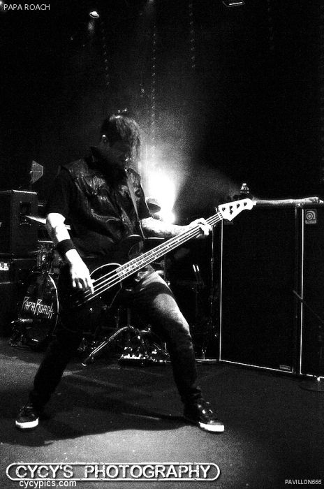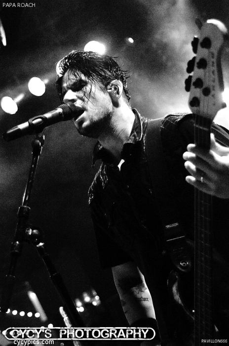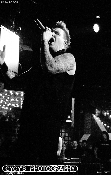 « Ce soir c’est blindé » m’indique la miss à l’accueil tandis que je récupère le sésame Pass durement obtenu le jour même, un grand merci à Olivier Garnier & à notre cher Roger pour leur implication, c'était pas gagné d'avance. Complet, et depuis des lustres, forcément le TRABENDO c’est maxi 700 personnes, et PAPA ROACH est un groupe qui a quand même un background et une envergure suffisamment grande pour remplir légitimement un Bataclan voir même bien plus, mais le groupe affectionne tout particulièrement les scènes « intimistes » et je dois bien avouer qu’avoir la chance de les voir de si près, sans artifices, à « l’ancienne », c’est quelque chose de génial. Et effectivement, ce soir c’est « blindé », et très vite il devient difficile de circuler dans cette salle atypique. Mais revenons à nos moutons et à cette affiche puisque PAPA ROACH est accompagné sur sa tournée par GLAMOUR OF THE KILL, et pour l’occasion au TRABENDO par un groupe Français, HOLOPHONICS. HOLOPHONICS C’est donc aux Français de démarrer les hostilités devant une salle quasi comble, chose rare pour une première partie. Le groupe, originaire de Grenoble, existe depuis 2005 et officie dans un style Metal Rock de très bonne facture. Ils nous offrent une ambiance assez sympa où les guitares composent quelques sonorités aériennes sur des bases rythmiques bien ROCK US. Et le public ne s’y trompe pas, si bien que l’accueil des cinq musiciens est très chaleureux. D’ailleurs, et là encore ce n’est pas souvent le cas pour un bon nombre de première partie, la demi-heure qui leur est impartie passe à une vitesse dingue, une sorte d’impression que sitôt commencé, le show se termine en cinq minutes sous les acclamations unanimes d’un public qui, pourtant, n’a d’yeux que pour le « Papa Cafard ». Un groupe à suivre. GLAMOUR OF THE KILL Vient alors le tour d’un groupe que j’attends au tournant depuis un certain temps, les anglais de GLAMOUR OF THE KILL, GOTK pour les intimes. Groupe fondé en 2007 outre-manche, ils n’ont cessés d’être encensés ou descendus par bon nombre de critiques un peu partout en Europe avec leur Metal à tendance Metalcore/Emocore qui n’est pas sans rappeler leurs aînés de BULLET FOR MY VALENTINE ou leur très contemporain BLACK VEIL BRIDE, en concert au Cabaret Sauvage le 13 décembre soit dit en passant. Aussi, enfin dirais-je, l’occasion m’est donné de découvrir live ce groupe qui nous a pondu un dernier album, « Savages », aux antipodes de leur tout premier méfait, « The summoning » (2011), que l’on pouvait à juste titre considérer comme des plus poussifs. Emmené de main de maître par un Davey Richmond des plus en forme ce soir, aussi bien au micro qu’accroché à sa basse, le groupe va nous offrir un set court mais suffisamment percutant pour que l’on en redemande une louche. Evidemment, ce type de metal, ne s’adresse pas à tout un chacun, mais force est de constater que le groupe sait jouer Live et qu’il déploie une énergie et une bonne humeur communicative évidente, notamment sur le titre phare du dernier album « Second Chance », véritable titre à reprendre en cœur et à tue-tête. Ils ont d’ailleurs tellement tout compris qu’ils sont parvenus à chatouiller les oreilles des plus vieux en reprenant un des titres de KISS des plus emblématiques, le grandissime « LOVE GUN », avant de finir par un évident « Feeling Alive », extrait du premier album, très BFMV dans l’âme. En résumé, le groupe a fait le job, voir plus et en ce qui me concerne, aura très probablement droit à du rabe lors de leur prochaine venue dans la capitale. Setlist : Break Supremacy Second Chance If Only she Knew Love Gun (Kiss) A Freak Like Me Feeling Alive PAPA ROACH : C’est devant un public acquis à sa cause que PAPA ROACH déboule sur scène dans une forme olympique, balançant au passage un véritable uppercut à tous les fans présents dès le premier titre de la soirée, un BURN qu’il sera difficile d’oublier. Et ce sera ainsi tout du long du show. Revue en détail. PAPA ROACH fête ses 20 ans d’existence, décidément le temps passe vite, et c’est avec une setlist mélangeant savamment des titres ancestraux au tout dernier album en date, « The Connection », que les quatre californiens vont se charger de fêter dignement ce point d’orgue d’une carrière menée de main de maître. Sous les acclamations d’un public qui, malgré les envies de certains sera contraint de ne pas slamer par un service d’ordre vindicatif, Jacobix l’incarnation même de zébulon, enchaîne avec un « Silence is the Ennemy » et un « Blood Brothers » qui démontre bien qu’aucune période du groupe ne sera laissée de côté ce soir. Alliant finesse, « Scars » ou encore « Forever », aux hymnes percutants et indétrônables « Between Angels and Insects » ou encore « Getting Away with Murder », tout sera l’occasion pour le groupe de démontrer, si cela était encore nécessaire, que la musique de PAPA ROACH se vit bien plus en live que tranquillement assis chez soi et qu’il est évident que bien des détracteurs du groupe, hélas bien trop nombreux en ce monde, devrait prendre le temps de venir voir avec quel entrain Jacobix et sa bande se chargent de mener la danse, d’avoir ce contact unique avec un public déchaîné (deux fois le tour du Trabendo), voir même de baiser la main de votre serviteur (Je ne la laverais plus jamais, c’est acté) tandis que je quittais le Photo Pit. Tout y passe, pour le plus grand bonheur des fans, le groupe enchaînant des « Where did the angels go », « Still swinging », « Life Line » ou encore « un Give me back my life» qui entrera dans l’histoire tant il fut tonitruant, emmené par une rythmique du feu de dieu que nous délivrent Jerry, Tobin et Tony. Et d’ailleurs Jacobix ne s’y trompe pas lorsqu’il déclare en substanc