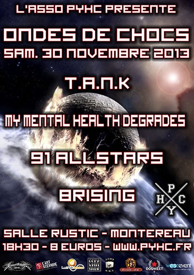 Montereau Fault Yonne, ville du sud de la Seine-et-Marne, accueille en ses terres une soirée metal organisée par l'association PYHC. Ondes de chocs, tel est le nom dédié à ce concert, met à l'honneur des formations death metal, metal core ou hardcore de la région parisienne. A l'affiche T.A.N.K., My Mental Health Degrades (MMHD), 91 Allstars et Brising. En ce samedi soir, peu de metalleux sont venus headbanguer sur les riffs épais et puissants des quatre formations. Sans compter quelques invités, les membres du PYHC et quelques médias, les 80 personnes présentes donnent à l'enceinte un effet de grandeur amplifiée.