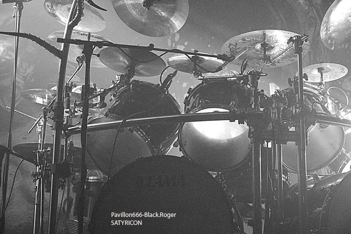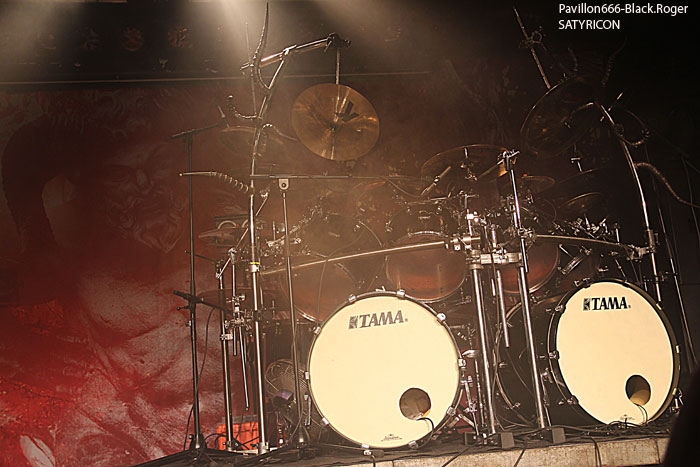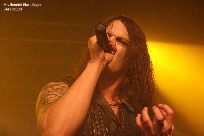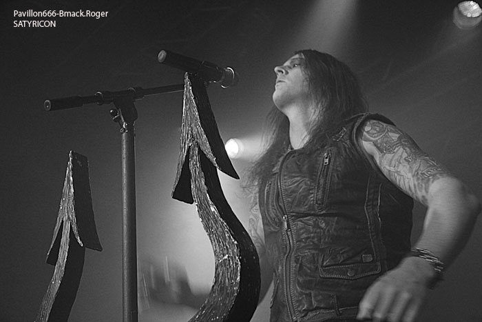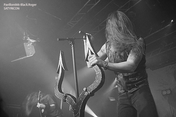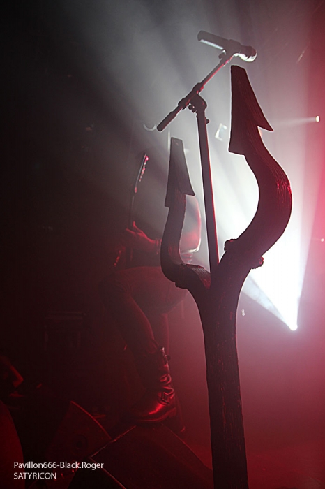 Après un long, très long moment en fait où l’on s’active sur scène pour mettre en place le décorum propre au groupe tête d’affiche. Les membres de SATYRICON apparaissent derrière un épais nuage de fumée (quelle manie ces excès de fumée sur scène !). La fourche-pied de micro emblème du groupe de black Norvégien trône au milieu de la scène et Satyr va l’empoigner vigoureusement dés le départ. Satyr figure emblématique du métal noir scandinave qui outre son propre groupe a participé à de nombreuses formations telles que Darkthrone, Eibon et Storm notamment. Mais ce soir il tient bon la barre du navire Satyricon avec son ami de toujours Frost, composant avec ses autres musiciens de « live » une entité malefique.