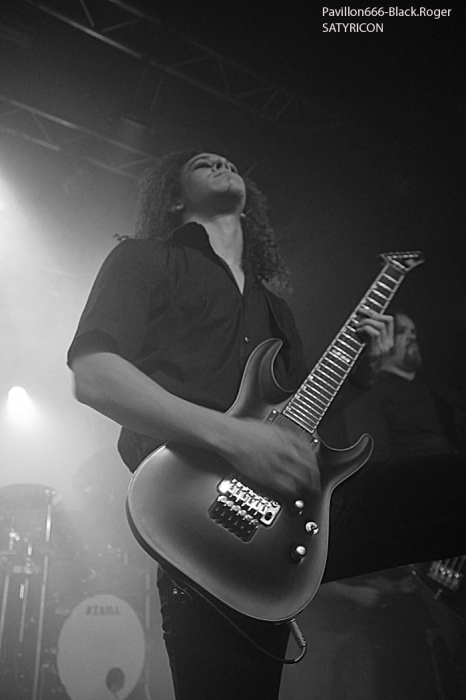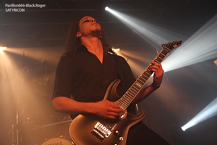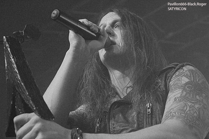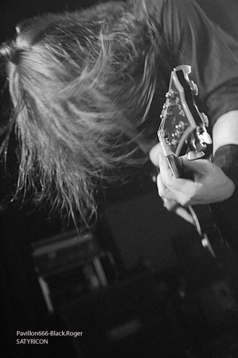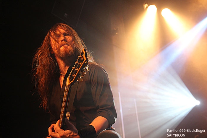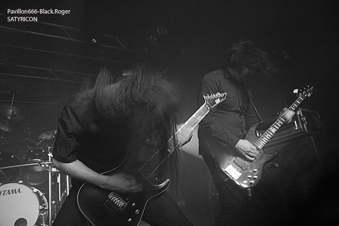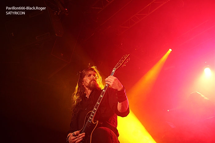 Le sextete ainsi représenté sur scène envoie dès le départ un son très connu pour ses accents froids, martiaux, plombés par une batterie bien mise en avant. Les claviers se font discrets étouffés par les deux guitaristes Steimar et Gildas qui n’ont plus rien à prouver avec leurs exploits guitaristiques tranchants et laminnants. Ce soir, c’est du pur Satyricon qui nous est offert avec toujours la prestation torturée de Satyr toujours en mouvement et qui pendant le set viendra guitare au poing, enfoncer le clou.