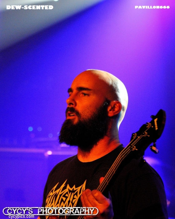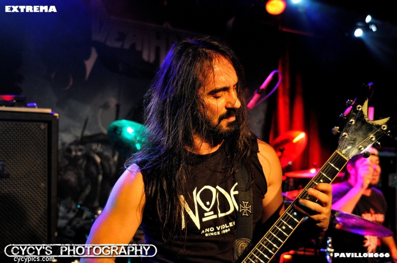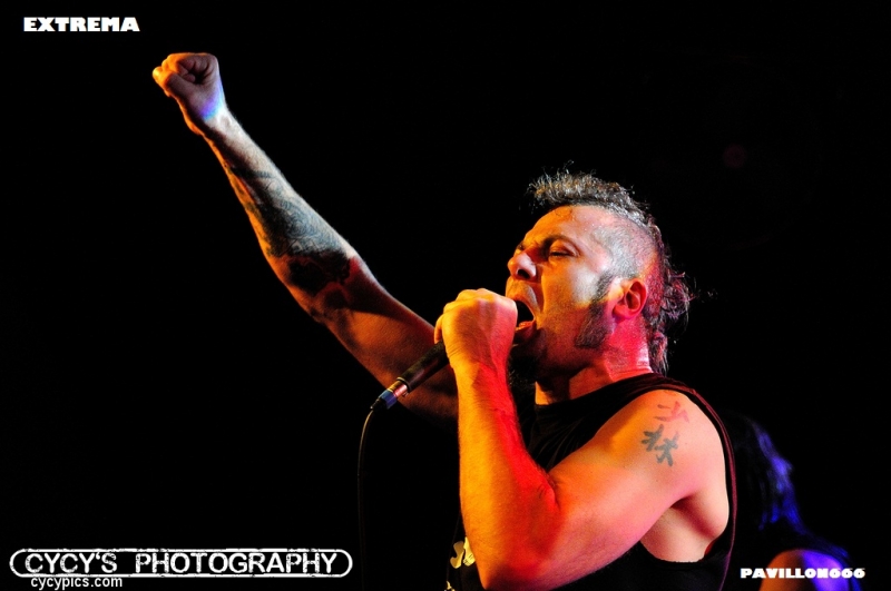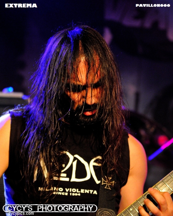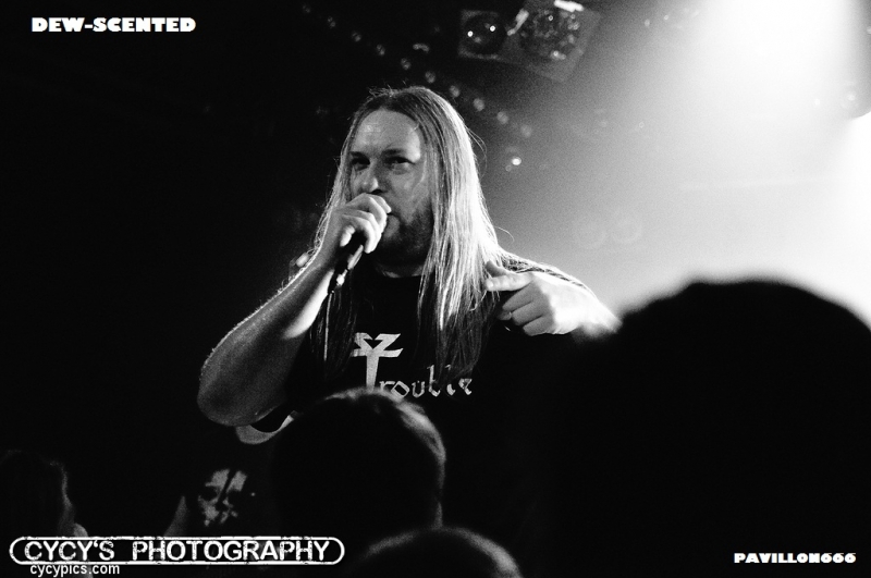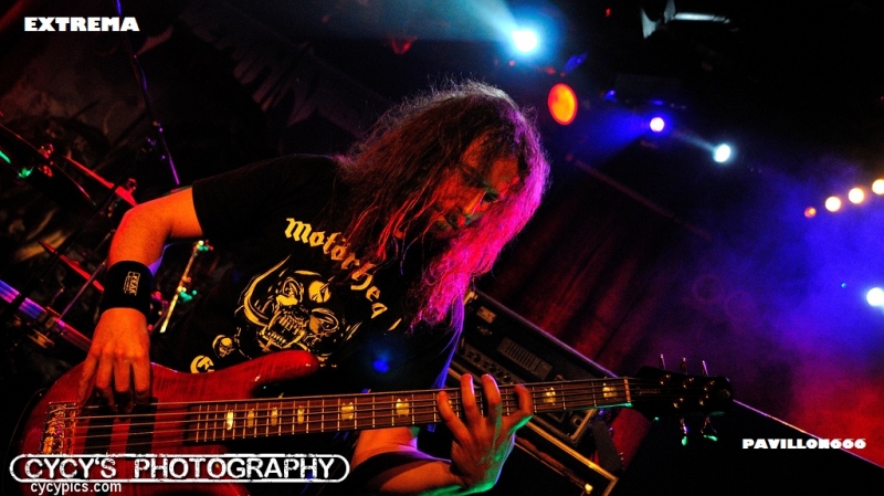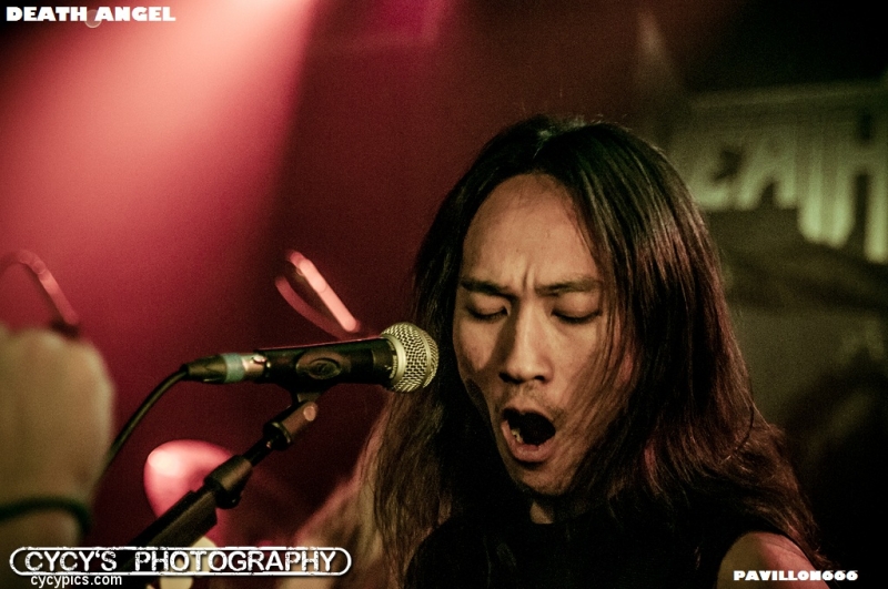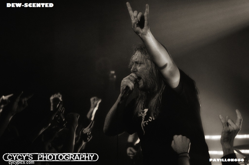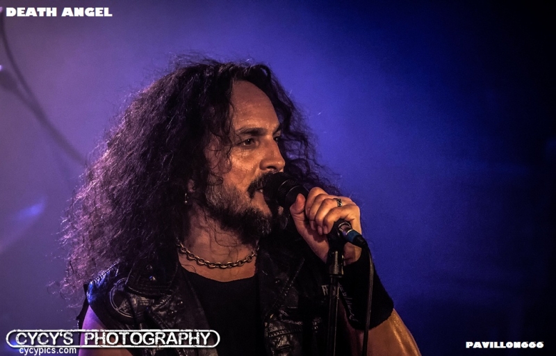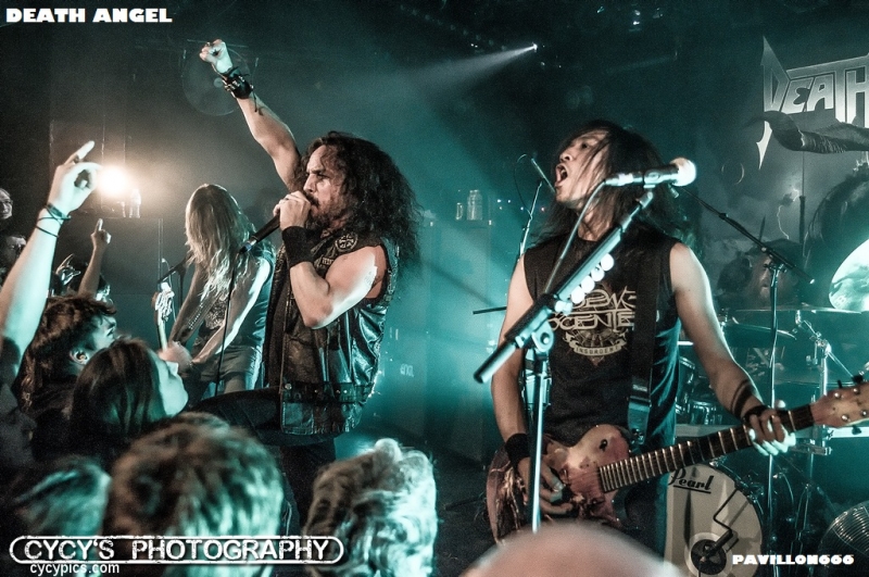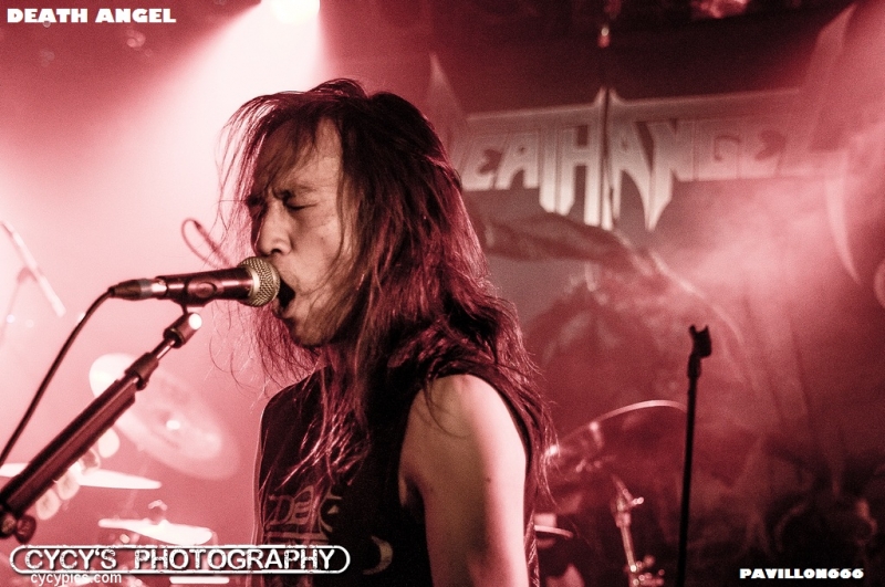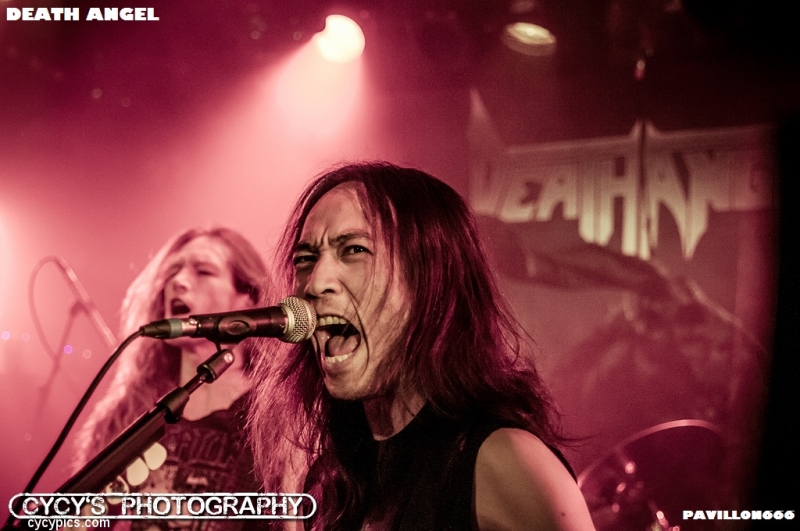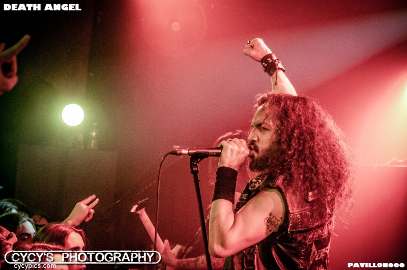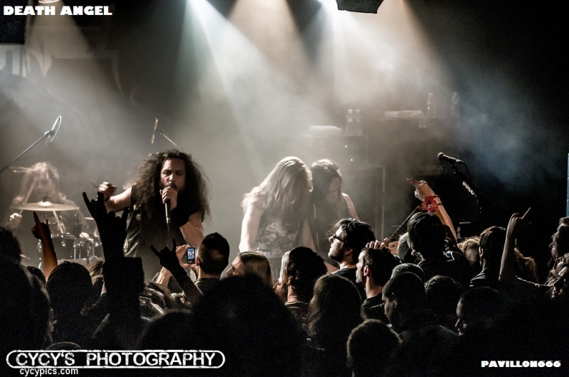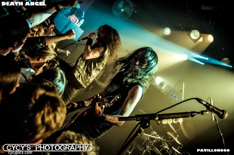Sitôt les portes ouvertes c’est avec plaisir que je retrouve La MAROQUINERIE après quelques années et le concert imparable qu’avait été la dernière date en France des BACKYARD BABIES. Mais quoi qu’il en soit les souvenirs d’une soirée inoubliable, il n’y a pas foule lorsque s’enclenche le débat du soir au sacro-saint nom du THRASH ADMIRON C’est à ADMIRON que revient l’honneur de débuter la soirée. Les italiens, fort d’un album efficace sorti en 2011, « K2 », et d’un style THRASH qui lorgne de temps à autre avec un Metalcore, mais pas trop, réchauffent très rapidement les membres encore ankylosés par le froid qui dressent le poing à chacune des interventions du chanteur. Dans un style qui n’a plus rien à prouver, les riffs sont efficaces et le chanteur possède cette énergie qui fait plaisir à voir tout du long de la petite demi-heure que passera le groupe sur scène. Un bon moyen de prendre de la température et de monter crescendo vers un final qui s’annonce grandiose. EXTREMA Tandis que la salle commence très légèrement à se garnir un peu plus, c’est au tour du second groupe Italien de la soirée de poursuivre les hostilités. EXTREMA, pour ce qui n’ont pas suivi, est un groupe dont la création remonte à plus de 20 ans. Hélas, mais on connait tous les aléas du milieu, ils ne sont jamais vraiment parvenus à éclater au grand jour avec un style Groove Metal qui, pourtant, pourrait tenir la dragée haute à nombre de formation plus jeune dont le talent reste encore largement à prouver. Là n’est pas le débat et le groupe, qui pourtant n’a pas sorti d’album depuis un certain temps (2009) va nous pondre un set bien énergique. Accompagné d’un chanteur des plus charismatique, le groupe nous propose une musique percutante qui va directement à l’essentiel et le jeu de guitare du très efficace Tommy MASSARA, qui au passage est le membre fondateur du groupe. Affaire à suivre donc tant sur scène ce groupe est des plus percutants. DEW-SCENTED Après ce show très efficace d’EXTREMA on peut constater avec plaisir que la salle se remplie nettement plus et que les allemands de DEW-SCENTED vont pouvoir s’exprimer dans des conditions dignes de leur réputation. Fort d’un tout dernier album excellent, ICARUS sorti en 2012, et d’une compilation que nous a offert le groupe cette année, les Allemands vont mettre tout le monde d’accord avec un style qui se rapproche bien plus du DEATH que du THRASH. Quoi que … c’est un savant mélange des deux styles que DEW-SCENTED propose live en accélérant quelque peu le tempo par rapport à sa production discographique. Les fans sont unanimes et le set des allemands en droite ligne avec une réputation qui n’est plus à faire après 8 albums et plus de vingt ans d’existence. DEATH ANGEL Le dernier passage du groupe l’an passé au HELLFEST m’avait rajeunit de quelques années tant leur set 100% axé sur le chef d’œuvre qu’est et restera ULTRA-VIOLENCE avait tout démonté et laissé pour pâle figure les sets de leurs potes SACRED REICH ou encore EXODUS. Et c’est non sans émoi que je trépignais d’impatience à l’idée de les revoir et ce, en comité restreint carrément intimiste malgré les quelques 200 personnes probablement présentes ce soir à la Maroquinerie. Après plus de 25 ans d’existence DEATH ANGEL fait partie de ces icônes intouchables qui ont permis à un style de forger et de se propager dans la quasi-totalité des styles Métal actuellement en vigueur de par le monde. Il y a des groupes comme cela, qui, et même si eux ne le revendiqueront jamais, ont permis l’émergence de toute une scène voir même plusieurs, question d’humilité très probablement. C’est sur LEFT FOR DEAD, issue du tout dernier génialissime album THE DREAM CALLS FOR BLOOD, que le groupe débarque sur scène avec une énergie de dingue. Une énergie qui vous donne la sensation de vous prendre un véritable coup de poing en pleine face. Très vite, Mark OSEGUEDA et ses compères prennent leur marque sur cette minuscule scène et impose un rythme de fou furieux. Tout y passe, des riffs somptueux, un chant ravageur, des solos qui ont fait la gloire du groupe, et une présence scénique que seuls ces GRANDS groupes possèdent. « Vous en voulez encore » ? Et voilà que le groupe enchaîne coup sur coup SON OF THE MORNING, MISSTRESS OF PAIN et le simplement sublime FALLEN, lui encore issu du tout dernier album, preuve en est que cet opus est digne d’être dans un top qu’il serait toutefois bien difficile de construire tant le groupe a de pépites. Rob & Ted assurent des parties de grattes qui rappellent pourquoi on aime (ou pas) le THRASH. Rythme saccadés, puissant, d’une vitesse dingue, des envolées solistes capables de ridiculiser des groupes ayant une envergure médiatique bien plus importantes qu’eux. Damien SISSON et Will CARROL ne sont pas en reste pour nous offrir ce groove si particulier et cher à DEATH ANGEL. Du coté Setlist, le groupe n’aura de cesse que de piocher dans des pépites telles qu’on peut décrire les morceaux CLAWS IN SO DEEP, SUCCUBUS, EXECUTION-DON’T SAVE ME, THICKER THAN BLOOD ou encore un CASTER OF SHAME d’anthologie qui viendra conclure la première partie du show des californiens. S’il y avait encore un avis mitigé quant à savoir si DEATH ANGEL représente bel et bien ce qu’est et sera pour toujours le THRASH, tout court, mais surtout, celui de la BAY AREA de SAN FRANSISCO, celui-ci va enterrer une bonne fois pour toute les quelques doutes qui pourraient, mais j’en doute, subsister après un tel show. C’est sous les acclamations que reviennent les 5 de Frisco pour entamer une triplette qu’il me sera très personnellement difficile d’oublier avec coup sur coup EVIL PRIEST, BORED et sa partie reprise de HEAVEN AND HELL (Black Sabbath) et les démentiels THROWN TO THE WOLVES / ULTRA-VIOLENCE. Sous les acclamat