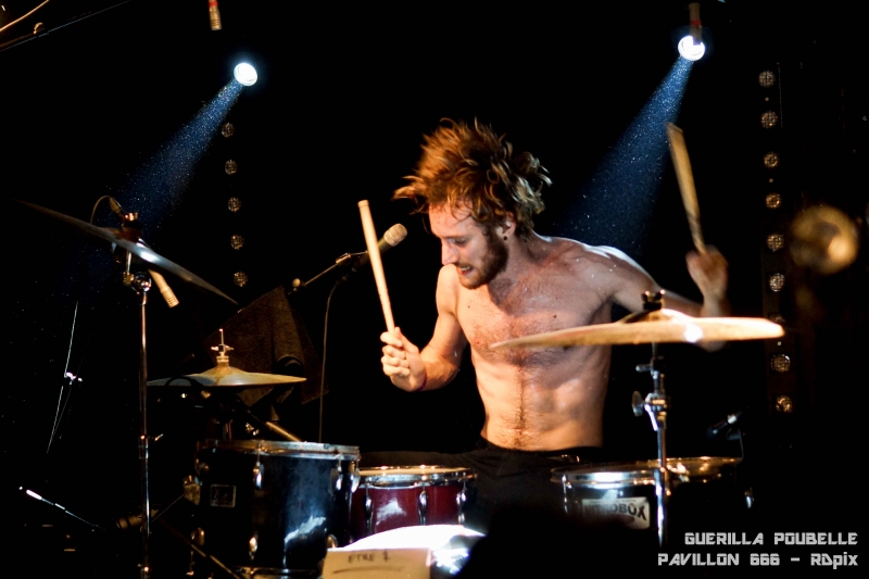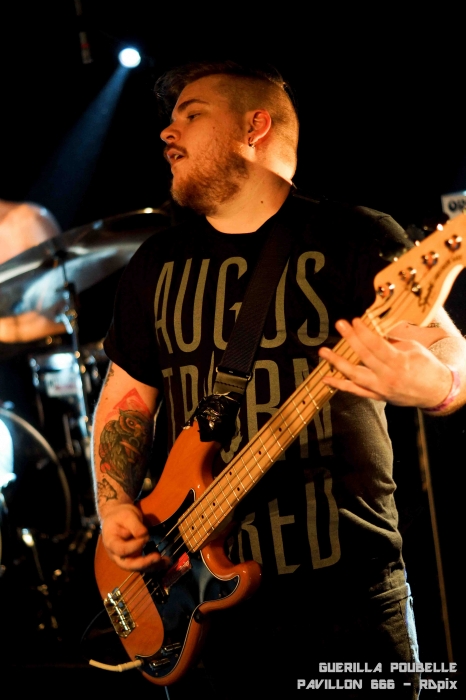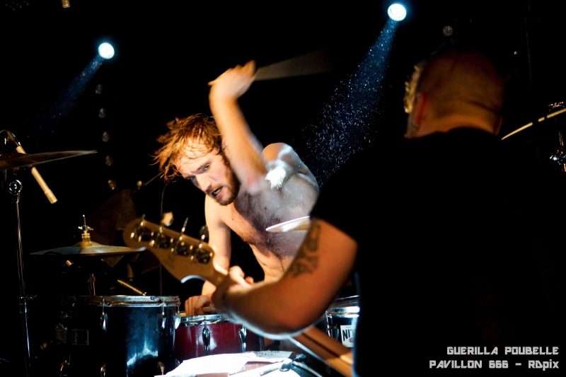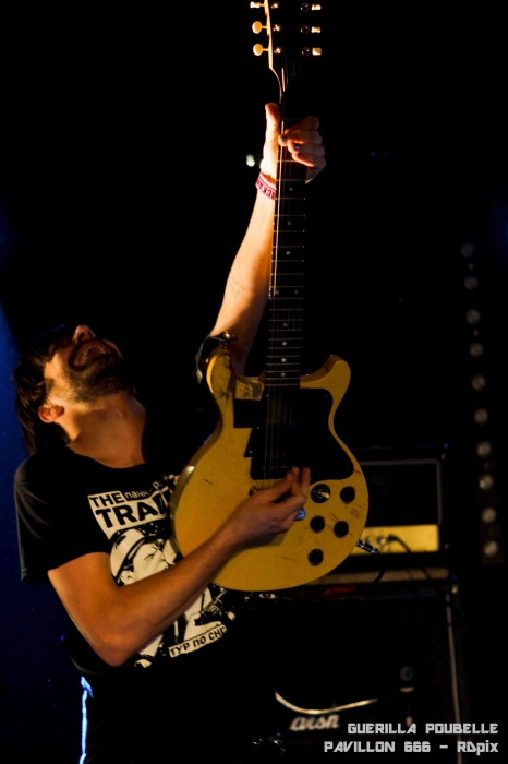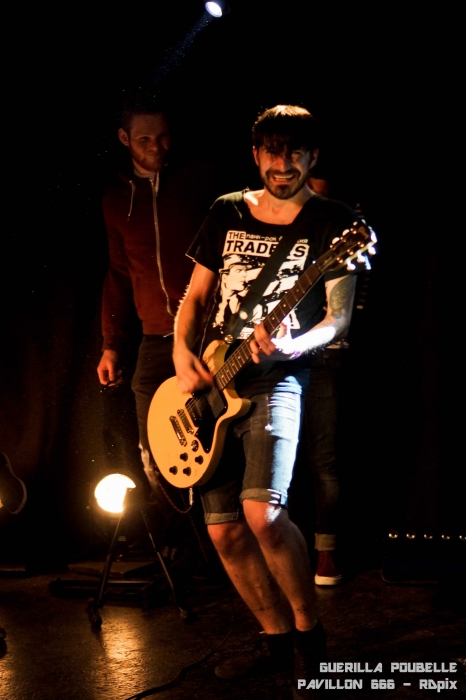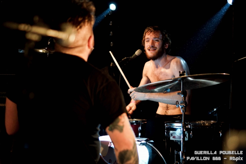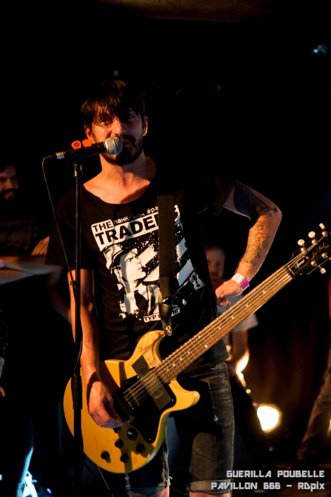 Une bonne demi-heure a suffi à la salle pour se remplir de ces 200 personnes venues assister au concert. Et sans perdre de temps, voilà déjà les P.O Box qui montent sur scène. Au nombre de 6, ils se composent d’un du quatuor classique guitare, basse, batterie et chant. Mais pour ajouter un peu de fun, on y trouve également un trompettiste et un tromboniste. Le groupe a entamé son set avec un morceau calme aux allures de fanfare, laissant une partie du public dubitatif. Pas pour très longtemps car la spécialité de P.O Box c’est de manier habilement des passages dans un style ska lent ou enjoué, à un punk rapide et complètement barré. Le changement de style s’est fait de façon brutale et sans prévenir. D’un coup le devant de la salle s’est transformé en une foule énergique et qui n’a cessé de sauter qu’a la fin de la soirée. Francophone je disais un peu plus haut ? Pas vraiment à vrai dire. Le vocaliste chante l’intégralité de ces textes en anglais. Avec un petit accent français ne manquant pas de rajouter un peu de charme à la chose. Ses musiciens sautaient et se marraient entre eux pendant tout le set montrant qu’ils étaient aussi là pour s’amuser. Leur bonne humeur était contagieuse tant et si bien que les spectateurs semblaient un peu déçus lors du départ du groupe. Pas de rappel, certainement par manque de temps. Après un rapide changement de matériel et un remontage complet de la batterie, la scène était prête à accueillir Guérilla Poubelle. Le public aussi. Quelques jeunes punks fougueux attendaient les premières notes pour se défouler. Les premières notes ne se sont pas fait attendre. Aussitôt sur scène, le trio a vite donné le ton. Till, le guitariste chanteur courait dans tous les sens tout en jouant ses riffs effrénés. Le bassiste lui était moins mobile mais tout aussi survolté. Le batteur s’est vite retrouvé en slip sous les encouragements du public et la chaleur ambiante. De l’énergie à l’état pur. La voix de Till a un peu mûri depuis le temps. On est loin de l’époque des Betteraves et de sa voix d’ados. Il a pas mal bourlingué depuis et ça se voit. Entre deux morceaux, le chanteur saisissait la moindre occasion pour balancer une vanne au public, comme à son habitude. Tout en déconnant il faisait des solos parfois plein de fausses notes pendant que son bassiste le montrait du doigt en se moquant. Quelques problèmes techniques sont également venus entacher le show comme un souci de grosse caisse. Le temps que le batteur règle le problème, Till meublait tant bien que mal. Mais rien de reprochable. Les fausses notes et les galères de matos, c’est ça le punk, c’est ça qu’on aime et qui fait tout le charme de ces groupes toujours proches de leur public. Je ne l’ai pas précisé mais les Guérilla Poubelles était là aussi pour faire la promo de leur nouvel album sorti en janvier. Le set était donc composé de quelques nouveaux titres qui ne faisaient pas du tout tache parmi les anciens. Bien au contraire. Mais ce soir-là, le groupe n’a pas innové uniquement sur l’aspect musical. Il a fait très fort en détournant le classique braveheart que l’on peut voir souvent dans les concerts de métal où le public se sépare en deux et se rentre dans le lard un bon coup avec de l’élan. Mais je ne vous apprends rien. Si ? Bon ! Comment peut-on innover sur un braveheart me demanderez-vous ? Les Guérilla Poubelle sont connu pour ne pas aimer les mecs qui cognent sur les autres dans un pogo ( et ouais, ils ne sont pas toujours drôles... les Guerilla Poubelle, pas les mecs qui cognent. Mais ça n’engage que moi). Et donc au lieu de demander à leurs fans de se foutre sur la gueule, ils ont exigé, au moment du contact, qu’ ils fassent une grande embrassade générale. Et quoi de plus marrant que de voir des jeunes punks transpirants s’exécuter sans poser de questions et se faire de grands câlins au milieu du public. D’ autres trucs drôles il y en a eu. Un jeune lycée montant sur la scène pour slammer tout en se filmant à bout de bras avec son téléphone. J’ai cru que ma vessie allait me lâcher sur ce coup-là tellement j’ai ri. Après un rappel, le groupe est revenu pour une dernière chanson de son nouvel album et s’est arrêté là. Un peu rapide à mon goût. Mais on s’est bien marré quand même. Les deux groupes étaient pleins d’énergie et de talent. La salle du Rack’Am que je découvrais pour la première fois était également bien aménagée malgré un plafond un peu bas qui ne permet pas une scène très haute. Le son et la lumière étaient à la hauteur et l’équipe organisatrice était fort accueillante. Je les en remercie grandement. Bonne continuation aux deux groupes que j’espère revoir bientôt. Quant à vous, je vous retrouve très bientôt pour de nouvelles chroniques de concert. |