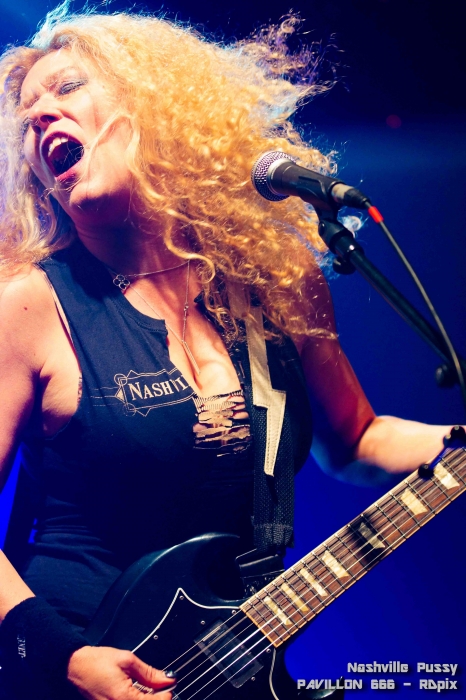 Je découvrais les lieux, intrigué. Ca a bien changé depuis la Loco. Le public s’est entassé dans une salle organisée en plusieurs parties ressemblant plus à une boîte de nuit qu’à une salle de concert. Et pourtant dans un coin, une scène surélevée de 50 cm et ne mesurant pas plus de 5m² était installée. Batterie, amplis et retours suffisaient pour remplir la quasi-totalité de l’espace. Il restait à peine de quoi poser le pied sur scène pour les musiciens. Et c’est bien ici que Wild Dawn allait ouvrir le bal. Les membres ont émergé du public qui entourait la scène de toute part. Une fois tout installé, leurs instruments à la main, ils n’ont pas attendu pour envoyer la sauce, pas perturbés pour un sou par le manque de place. Le groupe propose un rock aux multiples inspirations avec son style bien à lui et une personnalité forgée malgré son jeune âge. Le son est lourd et la musique est empreinte aussi bien heavy metal que de blues. Le chanteur à la carrure imposante possède une voix puissante et toujours juste. S’adaptant parfaitement aux différents styles du répertoire du groupe, le vocaliste s’occupe également de la guitare rythmique. Ce dernier était entouré d’un second guitariste et d’un bassiste. Le batteur caché derrière ses lunettes de soleil et ses cymbales donnait le rythme à tout ce beau monde. Entre deux chansons, le chanteur motivait régulièrement le public qui ne semblait pas vouloir se défouler. Le son s’y prêtait pourtant très bien. Peut être était-ce l’étroitesse de l’espace ou le manque de visibilité de la scène et son pauvre éclairage qui n’aidait pas. C’est sur les trois derniers titres du groupe que la foule a commencé à chanter et encourager vraiment le groupe. Il faut dire que les meilleurs morceaux avaient été gardés pour la fin. Le guitariste en a profité pour se lâcher un peu aussi. Lassé du peu de place qui lui était alloué, il s’est mis en tête de faire le tour de la salle le temps d’un solo endiablé. Ecartant la foule sur son passage, il s’est promené un bon moment sans jamais perdre la trame de son morceau pendant que le reste du groupe donnait le rythme sur la scène microscopique. Le petit show a fait son effet pour décoincer le public, mais hélas, seulement à la fin du set. Set List : Bitter Mind, Now Or Never, Plague, Ain’t Life Grand, Back On Track, I’m My Own Worst Enemy, I’ve Got the Rock. Une fois le set fini, le groupe nous a invités à rejoindre la grande salle de concert en attendant que les Nashville Pussys se préparent. Comment ça, grande salle ? Pourquoi les deux groupes ne sont-ils pas logés à la même enseigne? Wild Dawn n’a rien d’un groupe de débutants qu’on met de coté sur une petite scène. J’étais un peu déçu pour le coup. Effectivement, la véritable salle de concert n’a rien à voir. Scène haute d’1m70, large comme il faut. Beaucoup plus de place pour le public. C’est franchement nul pour le groupe précédent. Surtout que Nashville Pussy n’est pas arrivé tout de suite. Les balances auraient très bien pu être faites entre les deux groupes qui auraient, du coup, pu partager la scène. De plus, après le retard initial d’une heure, on n’était plus à ça près et aurait pu attendre quelques minutes de plus. Mais bon, passons. Il est temps d’accueillir les américains de Nashville Pussy. Blaine Cartwrigh et sa femme, Ruyters Suys sont de retour et ça va chauffer. Le groupe joue un hard rock déjanté qui sent le cambouis et la sueur du red neck tout droit sorti d’un trailer park dans un coin oublié de l’Arizona. Teinté de blues, et de rock sudiste, leurs inspirations vont de Lynyard Skynyard à Motörhead en passant par AC/DC. Le genre de groupe qu’on trouverait dans un rade poussiéreux de bord autoroute. Sauf que là ça a vraiment de la gueule. Le groupe en impose aussi bien musicalement que visuellement. Tandis que le public criait « we want pussy » en cœur, le groupe a entamé « Keep on Fuckin’ ». Energique comme toujours, Ruyters jouait de sa guitare tout en faisant ses mimiques de psychopathe. Blaine assurait comme toujours la partie principale au micro tandis que le batteur envoyait le rythme. Bien qu’encore un peu timide, la bassiste arrivée dans le groupe depuis deux ou trois ans se révèle être très efficace. Cette dernière et la guitariste (complètement barrée ceci dit en passant) accompagnent toutes deux le chanteur au micro. Le duo d’accompagnement vocal Bronnie Buitrago/Ruyters Suys me semble le meilleur line up depuis les débuts du groupe. Quelques titres se sont enchainés avant l’arrivée d’un premier morceau tiré du nouvel album. « Rub it to Death » a semble-t-il reçu un accueil positif du public vu le nombre de personnes reprenant les paroles avec le groupe. D’autres nouveaux morceaux suivront tel que « Everybody’s Fault But Mine » et « Up the Dosage ». Mais bizarrement, le groupe n’en fera pas plus, et préfère faire la part belle aux titres plus anciens. « Go to Hell », un morceau plus lent a permis aux musiciens de reprendre leur souffle avant d’enchaîner avec une reprise de Kokomo Arnold que le groupe a fait durer cinq bonnes minutes le temps de présenter ses membres. Ensuite, les hostilités ont repris de plus belle avec « Snake Eyes » et « I’m the man ». Quelques slammeurs montant sur scène ont tout de même réussi à énerver un peu le chanteur qui demandait que ça cesse et qu’on lui laisse la scène libre. Mais certains non-anglophones ont pris cela pour des encouragements et ont continué à grimper malgré tout, pour le plus grand désespoir de Blaine. Ce bref passage est vite oublié et le groupe reprend de plus belle. Un bref rappel a permis au groupe de s’envoyer quelques whiskies avant de repartir encore plus fort avec « Go Motherfucker Go » et finir avec « You’re Going Down » dans l’hystérie gé