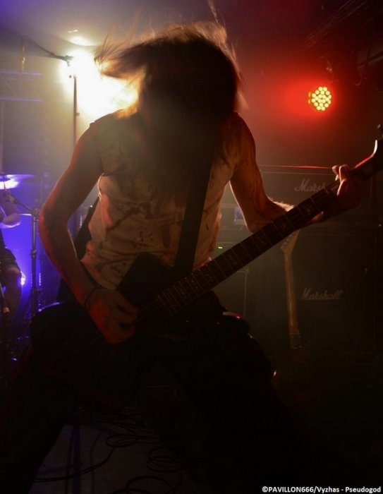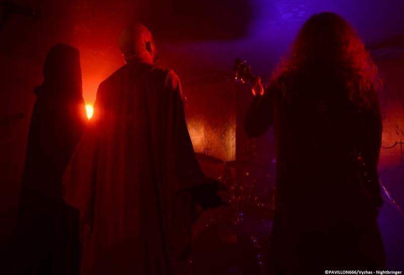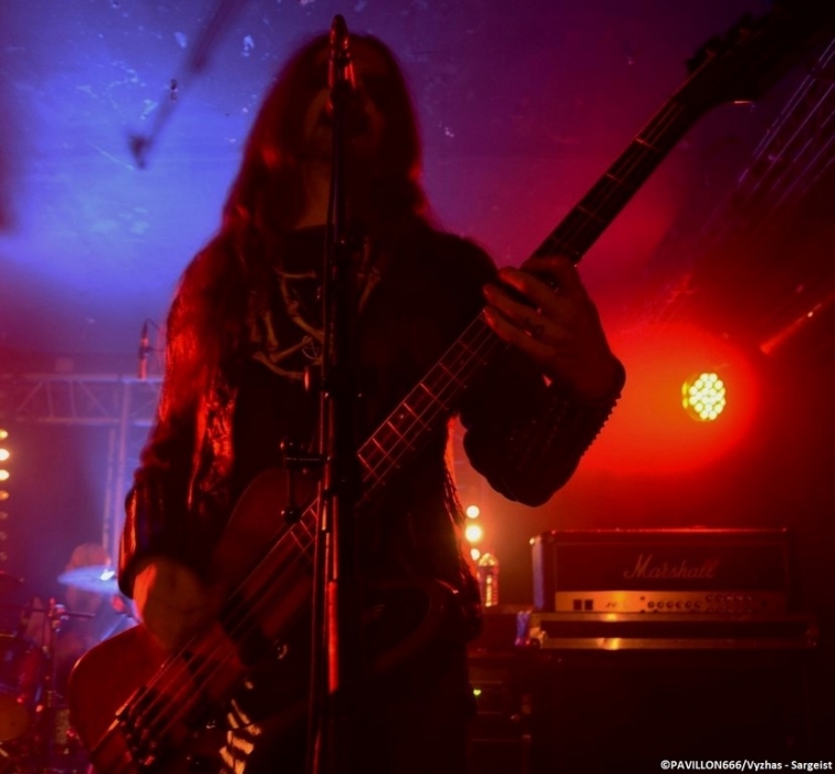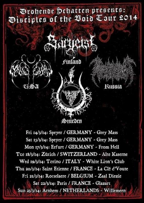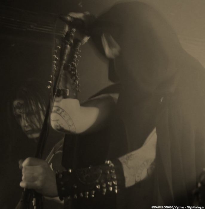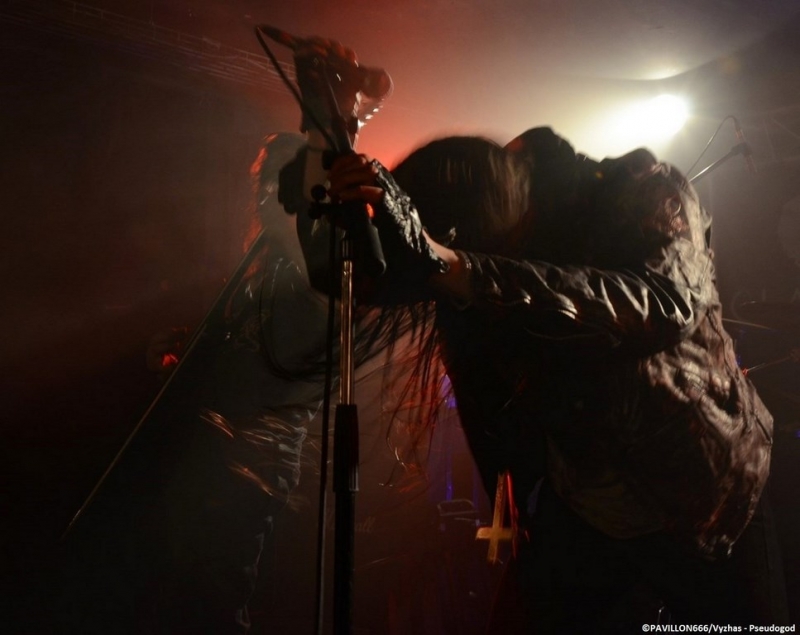 La soirée démarre avec une heure de retard pour cause de problèmes techniques dû à l’incompétence ahurissante d’un ingénieur du son. En effet, tous les groupes de ce soir auront eu à faire face à un son plus qu’approximatif, à tel point que dans un premier temps Irkallian Oracle a annoncé qu’il ne jouerait pas ce soir. Après les pourparlers avec l’organisateur, les suédois décident finalement de monter sur les planches. C’est vêtus de soutanes noires et encagoulés que les membres débarquent et nous offrent un black/death mid-tempo lourd et très dissonant. Le groupe met à l’honneur son côté « cérémonie occulte » avec l’accompagnement d’instruments très ritualistes (cloches et tambours notamment). Une expérience sonore et visuelle très particulière qui aura séduit une bonne partie du public, mais qui pour ma part m’aura laissé complètement de marbre, vu la longueur et la redondance des morceaux. Tout droit venu de Russie, Pseudogod prend le relais et nous délivre cette fois-ci un black/death caverneux nettement plus convenu. Le quartet arrive sur scène maculé de sang. Le chanteur fait preuve de charisme avec ses longs cheveux gras et son timbre guttural réverbéré proprement hallucinant. Pour le reste les autres membres restent très statiques et timides. A la différence du public complètement furieux, voire un peu trop, m’empêchant de profiter pleinement de la prestation poisseuse du combo, la médiocrité du son ne facilitant pas la tâche non plus. A noté également une reprise de « Blood War III » du groupe black français Antaeus. Changement d’ambiance avec les américains de Nightbringer. Le quintet apparaît en corpse paints et habits monastiques noirs, à l’exception du chanteur portant une soutane rouge. Formé en 1999, le groupe n’est pas un amateur, avec une discographie longue comme le bras, jonchée de trois opus studios et de multiples splits. A l’image d’Irkallian Oracle, Nightbringer nous plonge dans une atmosphère très particulière. Dès l’introduction lugubre au clavier, la formation nous emmène dans son univers très ritualiste, une messe noire d’un black metal aux riffs incisifs et aux mélodies tranchantes mettant le public dans une transe d’une quarantaine de minutes. La musique des américains est globalement très rapide. Des passages mid-tempi viennent aérer leur black acéré et met parfaitement en valeur la dimension mystique et cérémonielle du combo. Nightbringer aura été ce soir le seul groupe a bénéficié d’un son limpide. Une excellente prestation qui sauve, pour le moment, une soirée au bord du naufrage, d’un point de vue sonore. Après la performance transcendantale de Nightbringer, retour avec les très attendus Sargeist. Retour également à un son exécrable pour la tête d’affiche. Les quatre membres débarquent en corpse paints noir et blanc, enguenillés, clous et ossements. Après la prestation « cérémonielle » de Nightbringer, la foule redevient hystérique et reprend ses pogos enragés et dévastateurs dès le premier titre des finlandais. Malheureusement, la qualité déplorable du son aura eu également raison de Sargeist. En effet l’unique guitare de Shatraug était imperceptible dans le mix en façade. Seule la batterie effrénée et la voix acérée étaient audibles. D’ailleurs si la formation était immobile sur scène, le vocaliste Hoath Torog fût le plus charismatique parmi ses sbires, son attitude « inamicale » lui confère une certaine aura maléfique. Mais Sargeist aura su convaincre une bonne partie de ses fans et du public en général avec les morceaux cultes de sa discographie (« Satanic Black Devotion », « Black Fucking Murder », « Let the devil in », « Empire of Suffering », « Black Treasures of Melancholy »). Leur prochain album, « Feeding the crawling shadows », dans les bacs le 31 mars, est également mis à l’honneur ce soir avec les titres « The Shunned Angel » ou encore le titre éponyme. Pour conclure, remercions tout de même Garmonbozia pour cette date 666% trve black metal, mais la soirée fut décevante à cause du son approximatif. En espérant que cet ingénieur du son ne recroise plus la route des blackeux présents ce soir, qui à l’entendre de la bouche de certaines personnes dans le public, est devenu en l’espace d’un soir « l’homme à abattre » ! |