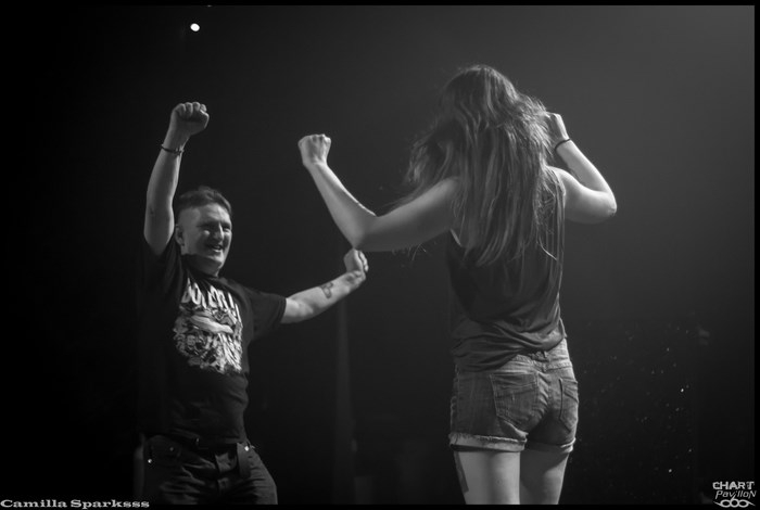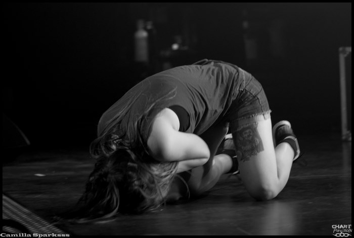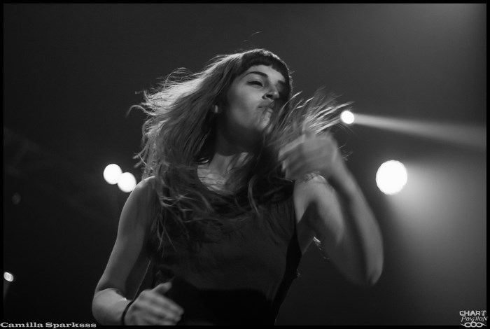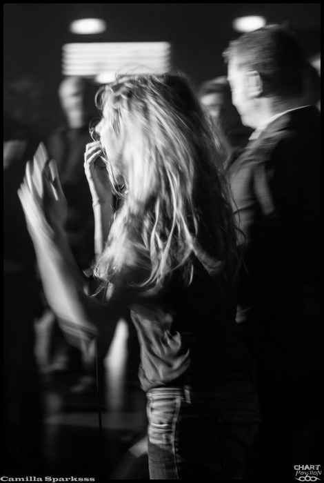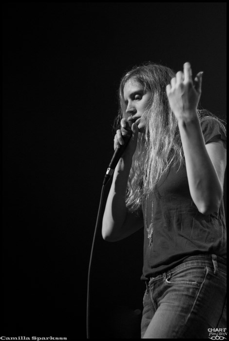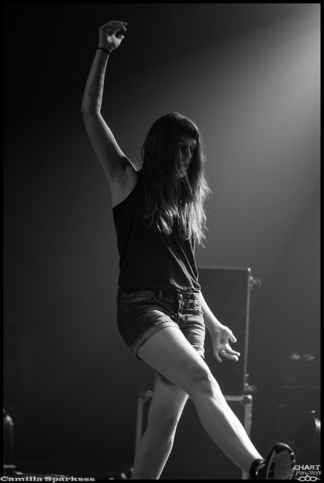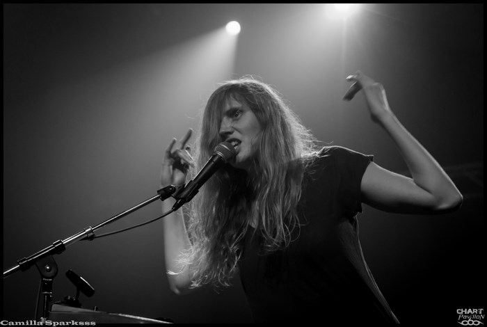 Changement radical de ton avec CAMILLA SPARKSSS. On laisse de côté les instruments conventionnels pour un clavier et des boîtes à rythme. CAMILLA SPARKSSS est en fait un duo féminin composée d’une chanteuse/musicienne et d’une danseuse. Si les premiers morceaux nous laissent un peu perplexes, nous nous faisons très vite prendre au jeu. Barbara LEHNHOFF qui est donc la meneuse du groupe est d’un charisme assez époustouflant. Son attitude scénique est captivante. La demoiselle ne se gène pas pour descendre dans la fosse et s’adresser directement aux personnes du public. Avec une telle énergie, ce set passe à vitesse grand V sans que l’on n’ait vraiment eu le temps de se rendre compte de quoique ce soit. C’est à mon avis la petite révélation de cette soirée bien que tous les groupes aient un véritable intérêt et soient tous réellement convaincants ce soir.