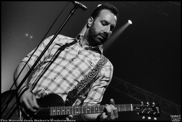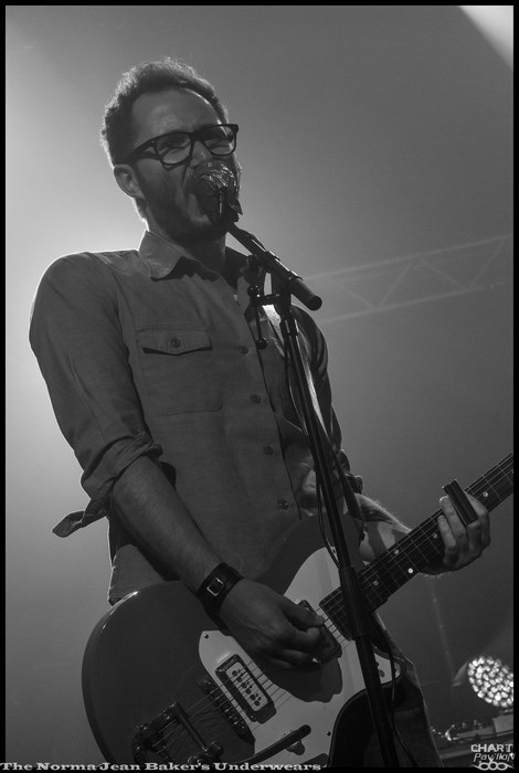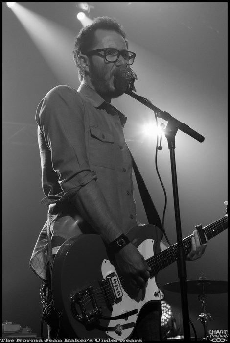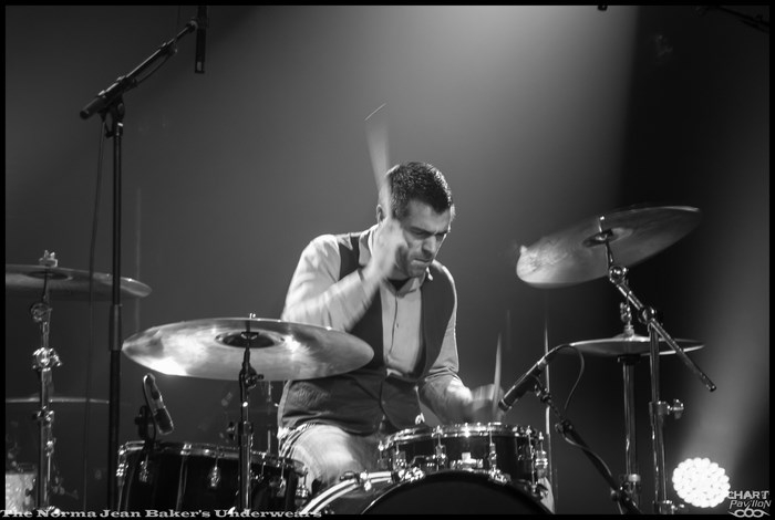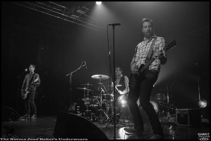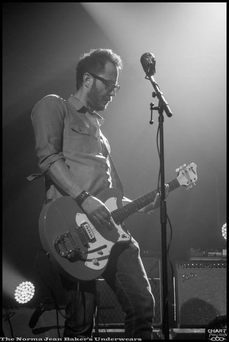 Mais avant tout cela nous avons rendez-vous avec THE NORMA JEAN BAKER’S UNDERWEARS. Il s’agit d’un trio stéphanois que les locaux auront peut-être croisé dans les bars de Saint-Etienne. Avec deux guitaristes et un batteur, le groupe propose un rock très énergique inspiré par un mélange des classiques des années 60/70 et d’une dose de punk rock noise. L’efficacité et l’énergie sont au rendez-vous. Malgré une grande scène pas toujours facile à exploiter le groupe occupe très bien l’espace, à sa manière. C’est aussi dû à un charisme assez développé chez ces musiciens. La prestation est au rendez-vous et on ressort assez conquis par THE NORMA JEAN BAKER’S UNDERWEARS.