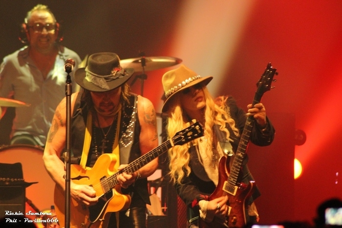 Pourtant, il a décidé de prendre ses distances avec les médias. Ainsi nos objectifs seront placés derrière la table de mixage limitant ainsi les plus serrés... Lassitude, agacement ou folie de star!!! Le star-system se prolonge dans le format du concert, pas de première partie, Richie Sambora et ses musiciens seront sur les planches pour 2h00 de set non stop. Richie Sambora arrive seul sur les planches doté d'une veste blanche, chapeauté façon show à l'américaine. Délaissant temporairement sa guitare, il engage le premier titre uniquement au micro. Les titres suivants seront menées par les diverses guitares de Richie, chaque morceau voit l'apparition d'une gratte différente. Le guitariste reste ancré dans la démonstration au détriment du feeling et de l'humilité. Orianthi convaincante durant sa période avec Alice COOPER devient pour l'occasion le "jouet" de M. SAMBORA. Comme son compagnon, elle prend la pose, reste chapeautée tout au long du set et esquisse trop peu de plaisir. Le couple est venu faire le job de manière routinière... Les autres musiciens paraissent plus heureux de foulées la scène du Bataclan mais leurs déplacements et attitudes semblent limités par le boss. Le show parcourt la discographie solo de Sambora, vient visiter quelques brûlots de BON JOVI ou quelques covers dont un morceau de mademoiselle Orianthi. L'ensemble n'est pas homogène, les titres sont parfois pénibles, Richie Sambora venant nous faire une démonstration d'accordéon sur une reprise de Willy DeVille. Bien qu'ils en aient sous le manche, rares sont les interventions passionnantes des deux guitaristes. Richie est le seul intervenant et le contact avec son public est limité, utilisant un propos peu prononcé afin d'installer un climat froid et anti-liesse. La foule tentera de mettre de l'ambiance et reprendra en choeurs les hits de Bon Jovi, allumant quelques étincelles de courtes durées. Lorsque les lumières se rallument, ce show laisse un gout amer. Il est parfois difficile de donner l'envie d'avoir envie... Setlist : 01 / A Song for You (Leon Russell) 02 / Every Road Leads Home to You 03 / Nowadays 04 / Lay Your Hands on Me (Bon Jovi ) 05 / Weathering the Storm 06 / Burn the Candle Down 07 / Stranger in This Town 08 / Sugar Daddy 09 / You Don't Wanna Know (Orianthi) 10 / Storybook Love (Willy DeVille) 11 / I'll Be There for You (Bon Jovi) (avec Fran Cosmo - Boston) 12 / Learning How to Fly With a Broken Wing 13 / Seven Years Gone 14 / Livin' on a Prayer (Bon Jovi) (version acoustique) 1er Rappel: 15 / The Answer 16 / Taking a Chance on the Wind 17 / These Days (Bon Jovi) (avec en intro Get Up, Stand Up by - Bob Marley) 2e Rappel: 18 / Rosie 19 / Stick to Your Guns (Bon Jovi) 20 / Wanted Dead or Alive (Bon Jovi) |