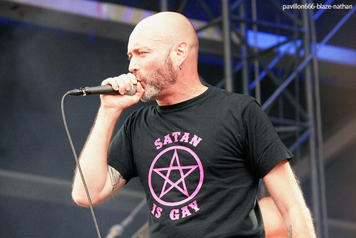Blaze Nathan : Après avoir digéré Lofo, allons prendre un verre avec les autres cinglés du punk/métal/hardcore à la française TAGADA JONES qui vont mettre le « merdier » dans la warzone. Avant le début du show, slam d’un lapin rose, ça promet ! Public très impliqué, très remuant cela va de soi et connaissant bien les paroles évidemment. Il fait très (trop) chaud mais le groupe se donne à fond, sueur, chaleur, ambiance Tagada enfin quoi !