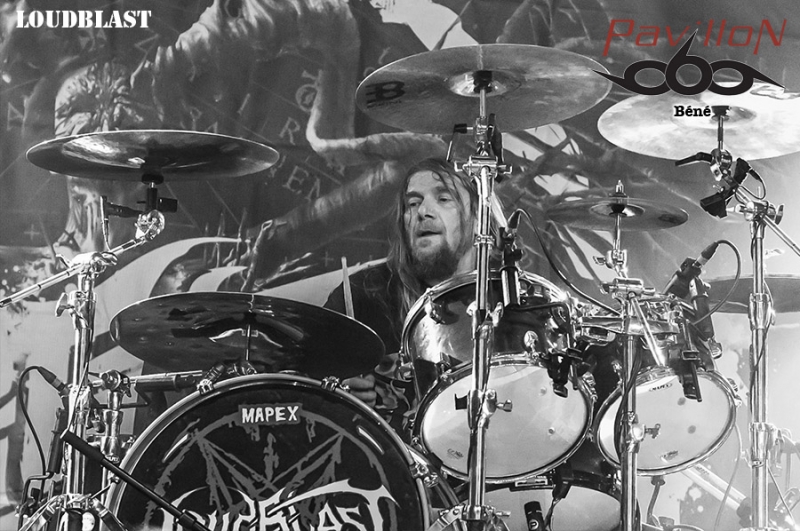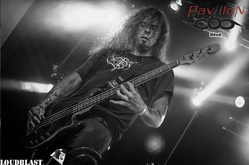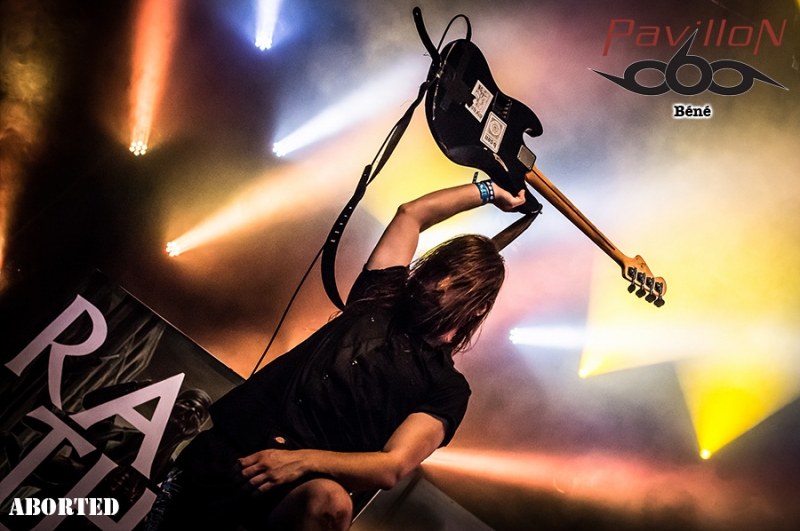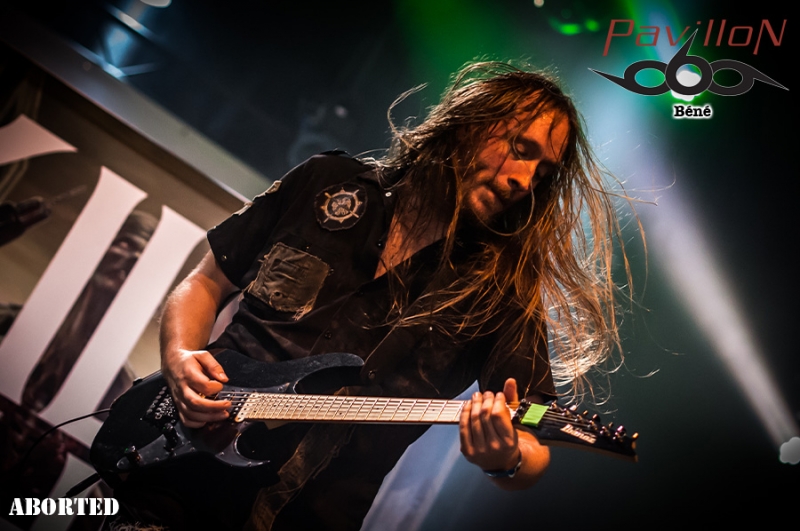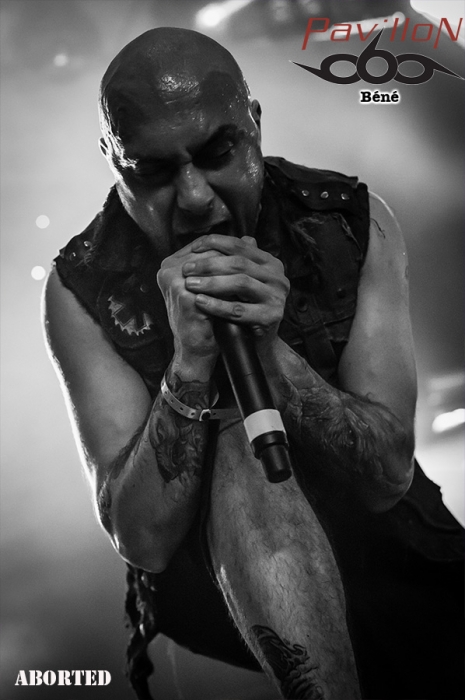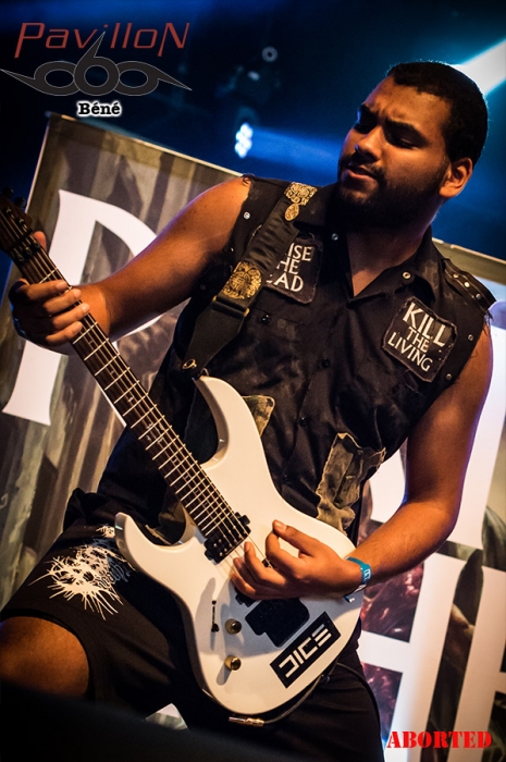 Jolie surprise que ce premier groupe du jour : BRUTUS. Originaires de Louvain, région néerlandophone de la Belgique flamande, ils sont un des deux groupes à avoir été sélectionné par le Festival de Dour, lors de la finale du tremplin Red Bull Bedroom Jam. Stéfanie est la chanteuse mais aussi la batteuse de ce trio post rock. Sa voie est aérienne, elle te transporte un peu dans les airs et tu te sens bien, tu pourrais rester là des heures à l’écouter. En parallèle elle fait résonner ses fûts et tu ne sens pour autant aucun tremblement, aucune défaillance quelconque dans sa voix (ce qui pourrait arriver avec les mouvements de bras). A la basse, Peter nous livre des lignes brutes et efficaces, tandis que Stijn à la guitare offre des soli sinistres, voir angoissants mais qui au final collent tellement bien à l’ambiance et au reste. Je pense suivre l’évolution de ce groupe de près à l’avenir, car j’ai vraiment passé un très bon moment. Une fois le set de BRUTUS terminé, la scène se dégage. Les techniciens commencent à installer la suite. Un premier panneau est amené sur scène « KILL THE LIVING ». Le second suit « RAISE THE DEAD ». Je reconnais un des gars qui aide à porte le panneau. Crâne rasé, Sven De Caluwé, chanteur d’ABORTED, est sur la scène. Il semble venir prendre la température et voir de quoi il retourne à Dour, festival où au final la communauté métal est une minorité. Je dois t’avouer que j’attends ce set avec interrogation. Pour une raison que je ne saurais t’expliquer j’ai eu un peu de mal avec la dernière prestation que j’ai vue au Motocultor 2013. D’après les confrères, elle était bonne, mais je n’ai pas accroché, question de feeling ? Honnêtement je ne sais pas… Du coup j’espère accrocher cette fois (SVEN, JB, KEN, MENDEL, DANNY si vous lisez ça ne vous arrêtez pas là et lisez la suite s’il vous plaît !) Je vois quelques métalleux devant, peu de monde derrière. Je trouve ça dommage… j’espère que ça va se remplir. Ken prend place à la batterie sous une flopée de spots rouges. Le public s’étoffe doucement. Sur l’intro, JB à la basse, Danny et Mendel aux grattes le rejoignent sur scène, suivis de près par Sven, qui scande un « WHAT’S UP DOUR ?? ». Pas beaucoup de réponse… Le show commence, le chapiteau se remplit et ça headbangue quand même devant…Mais bon…Tu ressens quand même vachement à ce moment-là que tu n’as pas affaire à un public résolument métal… C’est bien dommage…La prestation est juste excellente. Sven en frontman qui se respecte arpente la scène d’un bout à l’autre et essaie de motiver le public. JB excelle à la basse, et il a un charisme de malade… Aussi loin que je me souvienne c’est la première fois que je vois un bassiste avec une telle présence et une telle attitude. Malgré la foule qui peine à s’enthousiasmer, les autres membres du groupe ne sont pas en reste et assurent. J’en viens carrément à me demander pourquoi je n’avais pas accroché au Motocultor. Peut-être que mes goûts musicaux ont évolué tout simplement. Je suis quand même déçue du manque d’engouement du public… Je sais bien que Dour est un festival qui revendique la variété des styles mais bon… Je me mets à la place des artistes et quelque part ça doit être frustrant… Le set d’ABORTED se termine, et je suis très satisfaite de les avoir revus. J’ai pu me refaire un véritable avis sur le groupe, et en rentrant je vais prendre le temps de réécouter les albums avec une oreille différente et attentive. Y'a que les imbéciles qui ne changent pas d'avis hein... Les suivants, pas vraiment besoin de te les présenter (ou alors, tu dois revoir tes classiques en urgence !). C’est la troisième fois que je les vois cette année, la deuxième pour Pavillon. J’ai nommé LOUDBLAST. Et pourtant rien ne va changer. Et rien dans le sens où Stéphane BURIEZ est toujours aussi impressionnant de charisme. Ce mec a de la prestance, le genre de truc qui ne s’apprend pas, et qui même si tu le vois un milliard de fois, même si tu n’es pas plus fan que ça, même si tu es fan depuis toujours et que tu devrais y être habitué, t’impressionnera toujours, encore et encore. Buriez joue avec la foule, alternant regards noirs et sourires. Lançant des « ça va DOOOOOUR ?? », et incitant le public à se manifester et se faire entendre. La performance est comme à son habitude quasi parfaite (je mets « quasi » parce que personne n’est parfait ah ah…). Hervé à la batterie est en grande forme, et ça s’entend ça blaste sévère. A la basse et à la guitare, Alex et Pierre sont carrés, précis et bien en place. La complicité entre les 4 hommes est visible et c’est agréable à voir. Que dire de plus ? Rien, ce serait me couper l’herbe sous le pied. Parce que je les revois au moins encore une fois cette année au Motocultor. Par contre je peux te donner la setlist : 1. A Bloody Oath 2. The Bitter Seed 3. The Abstract God 4. Taste Me 5. Emptiness Crushes My Soul 6. From Dried Bones 7. Never Endin' Blast 8. Flesh 9. The Horror Within 10. Cross the Threshold Pour succéder à LOUDBLAST sur la Cannibale Stage, les anglais de SYLOSIS et leur métal/Trash/progressif. Emmené par Josh Middleton au chant, le groupe va mettre le feu à la salle. Personnellement j’ai passé un bon moment mais je n’ai pas non plus trouvé ça transcendant. Le set débute avec le très bon « Fear the World », et ensuite c’est assez linéaire, pas de réelle surprise. Un bon concert mais rien d’exceptionnel non plus. C’est au tour de SKINDRED de fouler les planches de la Cannibale Stage. Le set débute avec un remix de la marche impériale de Star Wars. Benji au chant déboule sur scène dans un costume pour le moins surprenant, ressemblant vite fait à une tenue de cavalier revisitée. Le public est enthousiaste et motivé d’accueillir l